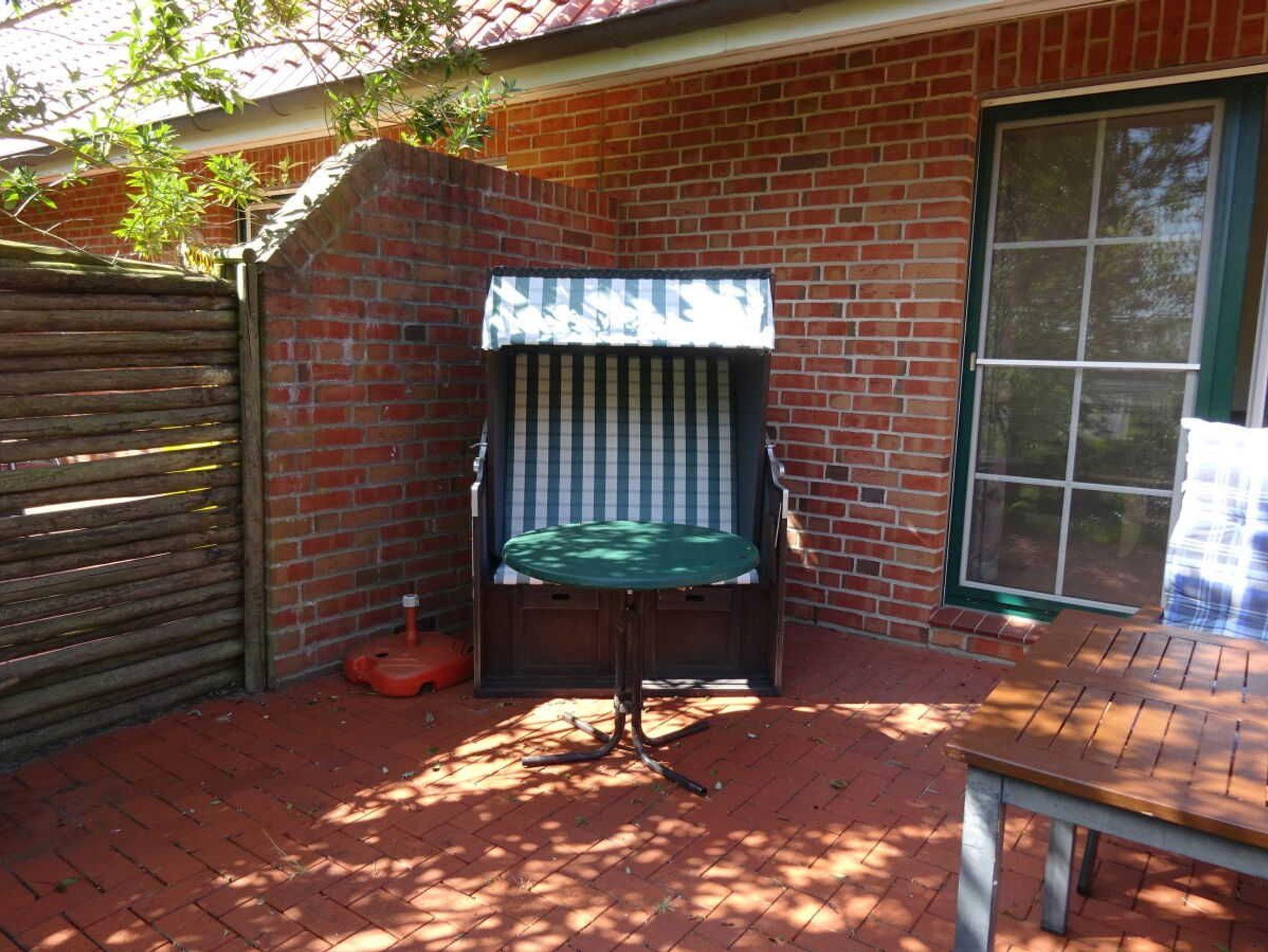 Vom hellen Wohnzimmer aus gelangen Sie durch die Terrassentüren auf die große separate Südterrasse mit Gartenmöbeln für 4 Personen inkl. Gartentisch und Auflagen und Strandkorb.