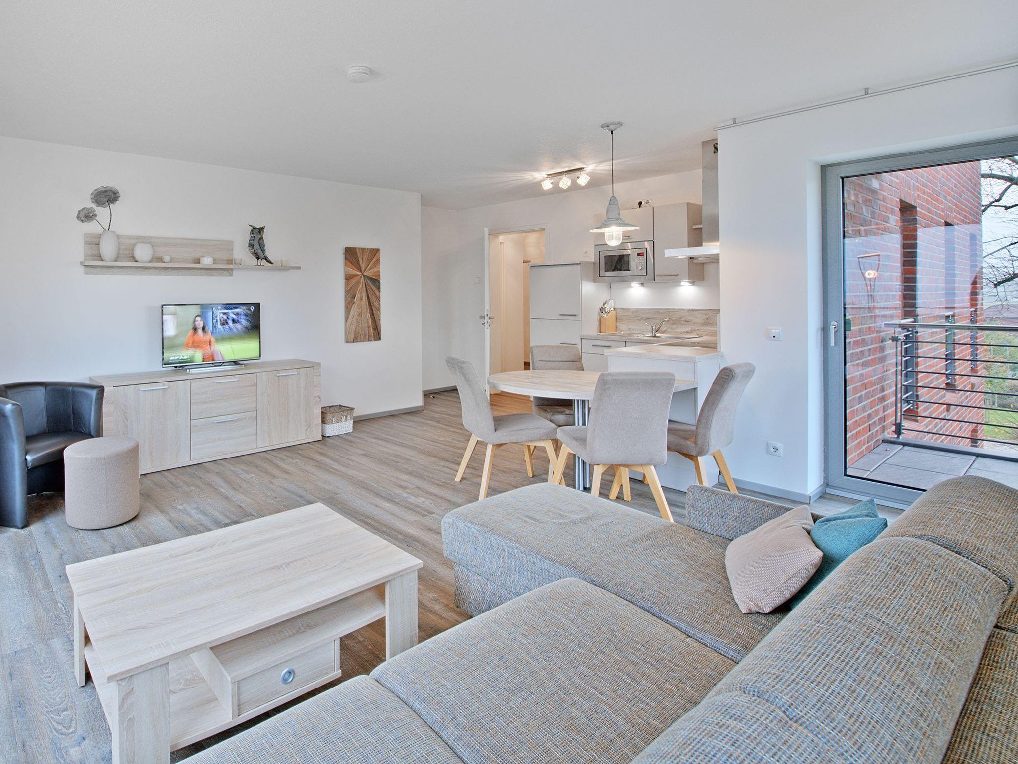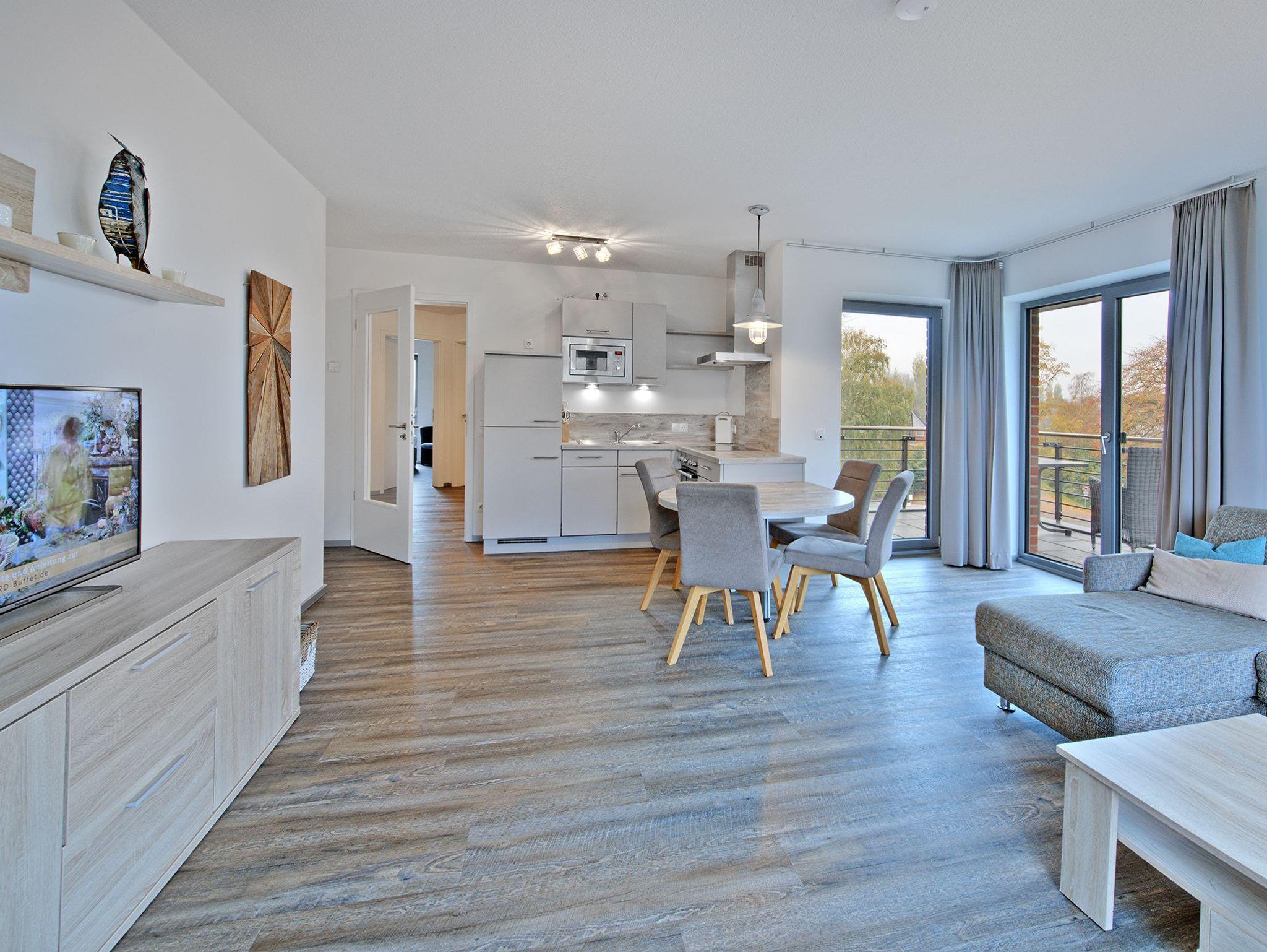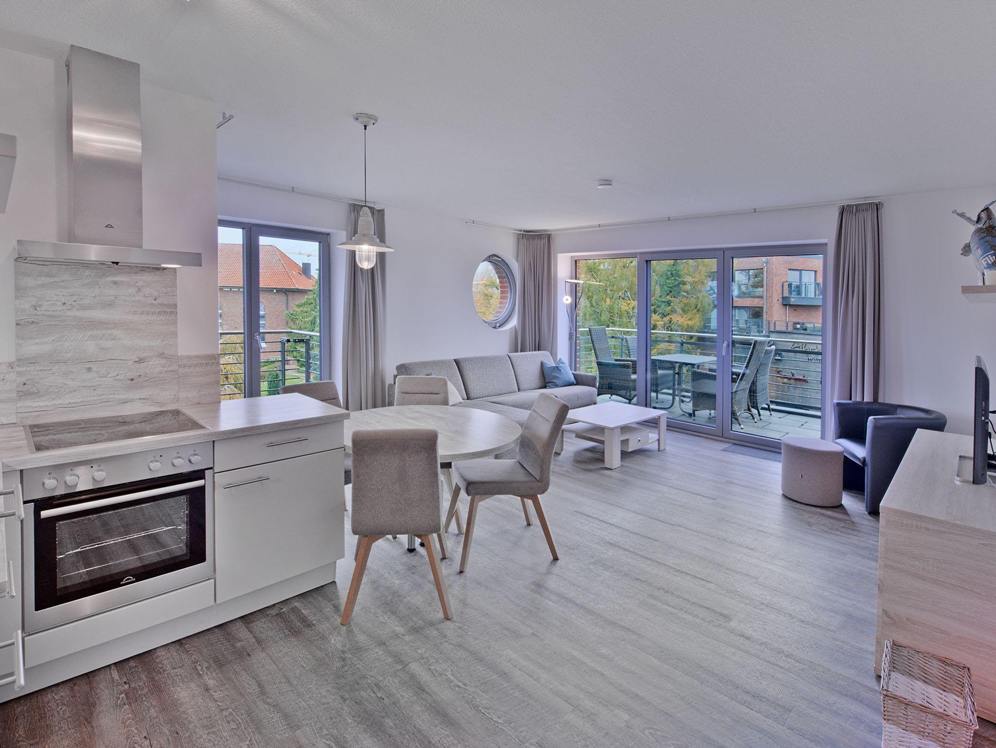 Die Appartements der Kategorie D4 R3 in unserem Ferienhaus LUV bieten Ihnen eine komfortable Ferienwohnung mit zwei separaten Schlafzimmern, einem offenen Wohn-, Koch- und Essbereich sowie einem Balkon mit Blick auf die Elbe.