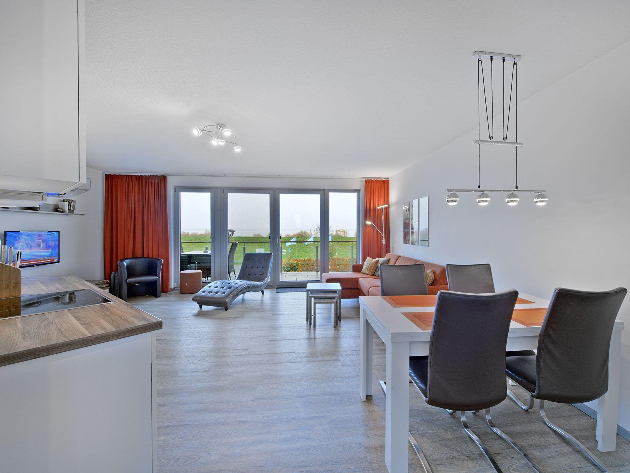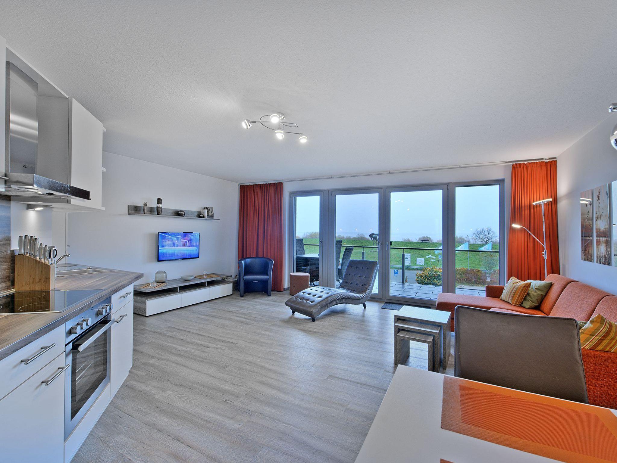 Die Appartements der Kategorie D3 R2 im Haus Lee verfügen über ein Schlafzimmer, Wohn-, Koch- und Essbereich und einem Balkon mit direktem Blick auf die Elbe.