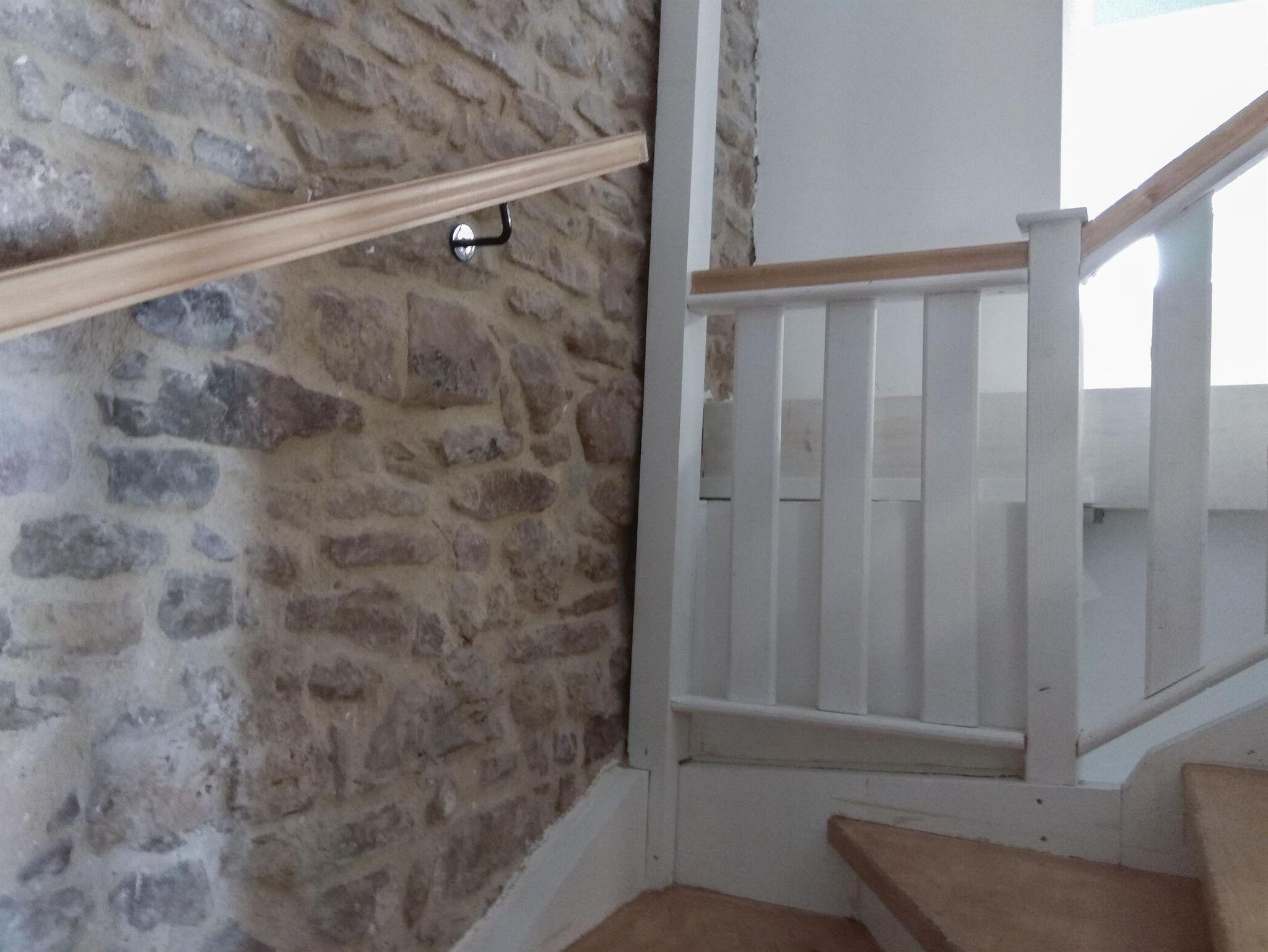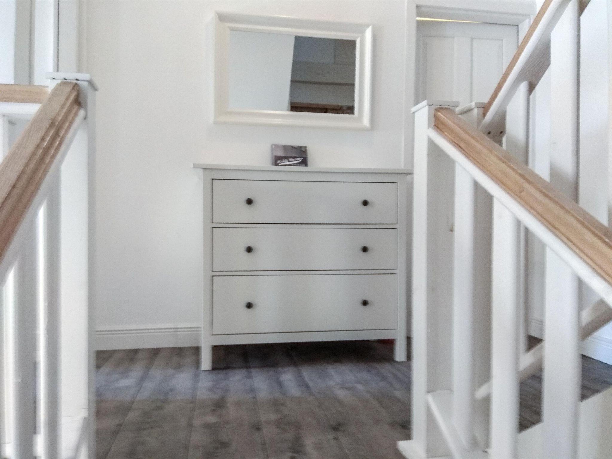 - Erdgeschoss - Der offene Grundriss kombiniert Eingang, Küche und Wohn- und Essbereich. Der Holzofen garantiert gemütliche Abende. Der Fernseher hat einen Amazon Fire TV Stick. Waschmaschine und Trockner befinden sich unter der Treppe.