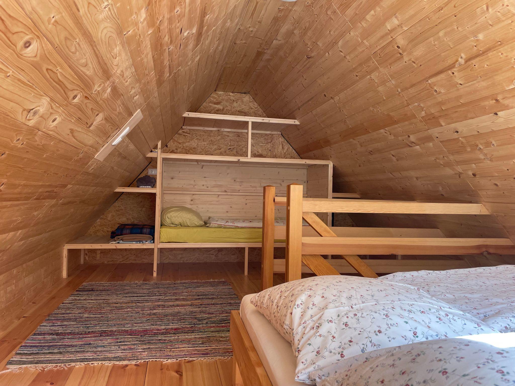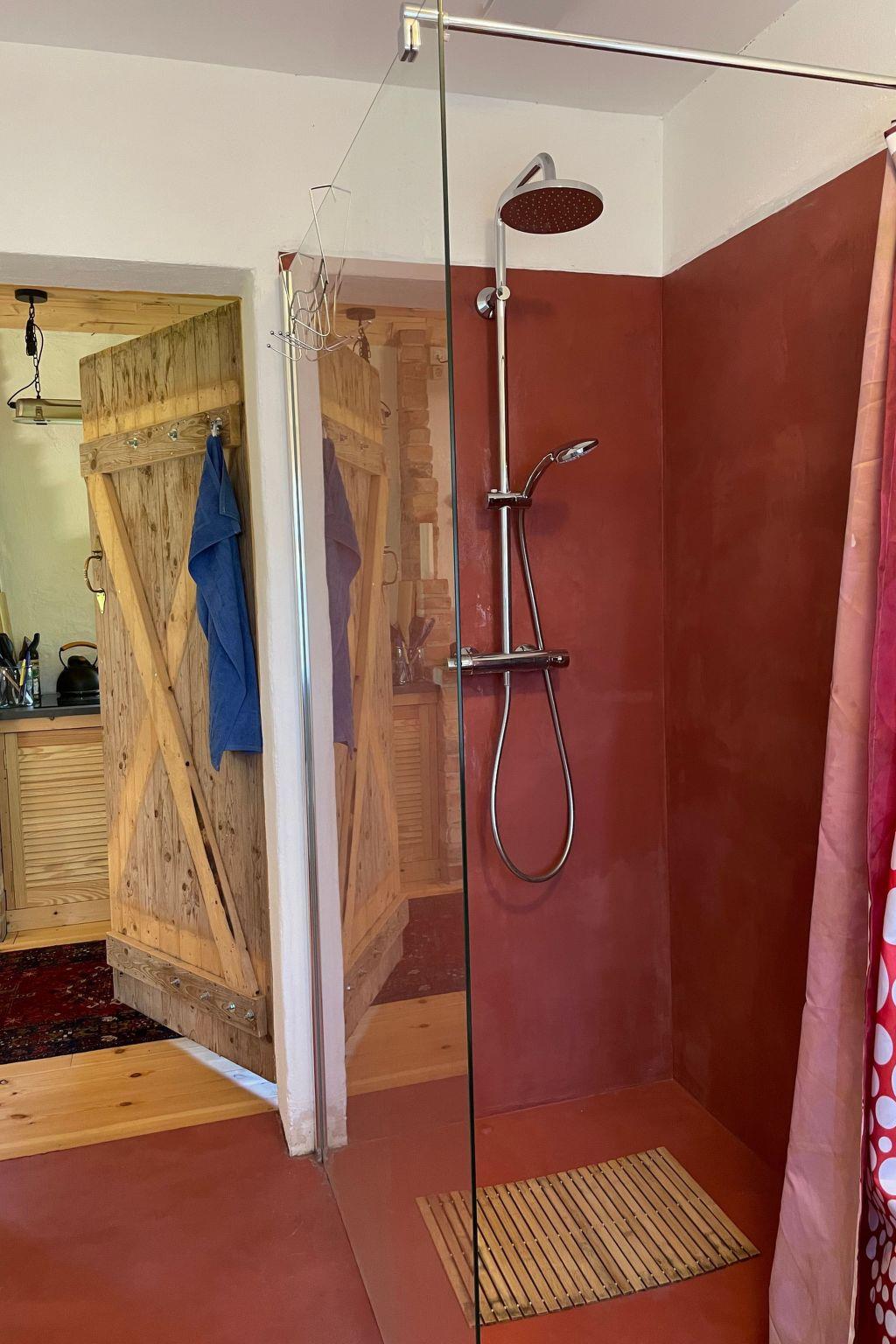In the middle of this small oasis of old trees and secluded corners of the garden stands the old vicarage from 1743 and right next to it the former wash house, which now houses the holiday flat of the same name. The flat has a living room with an open-plan kitchen and wood-burning stove, a bathroom and a bedroom on the first floor with a double bed and a "cupboard bed" that your child will love. The flat is heated exclusively by the wood-burning stove. Logs can be purchased per basket from the landlady as required. The bathroom is heated with an infrared heater. The hot water is provided by an instantaneous water heater.
