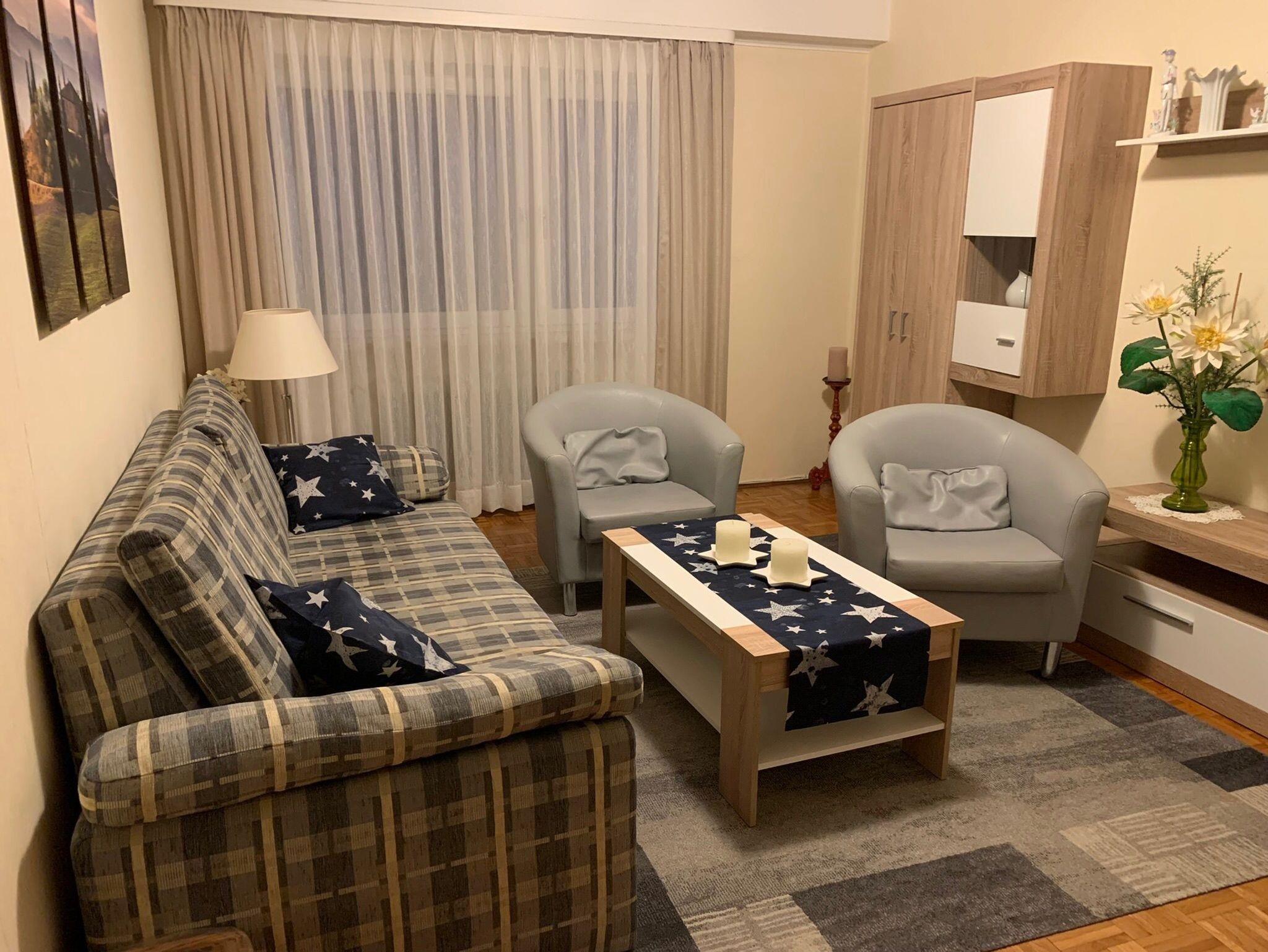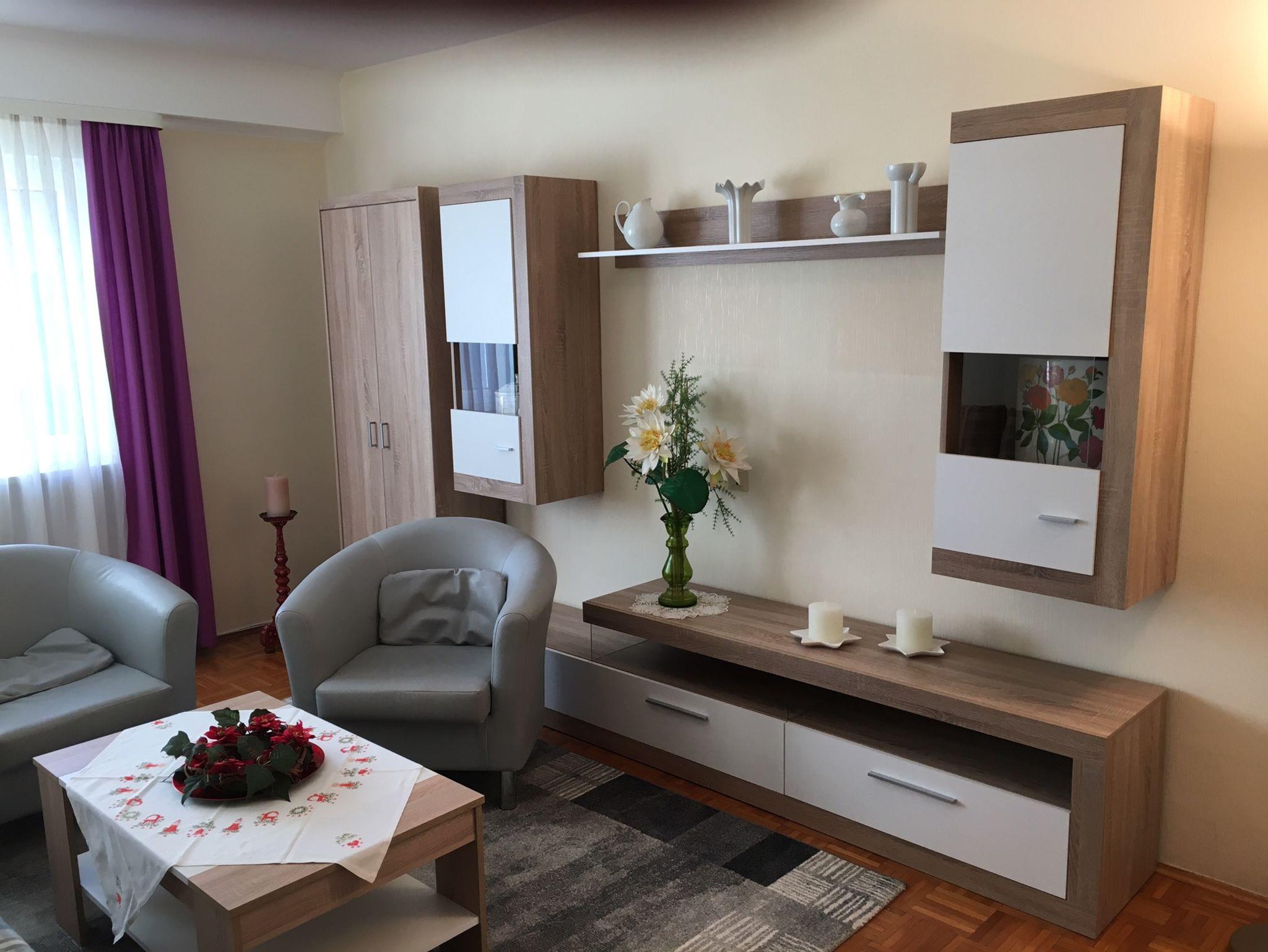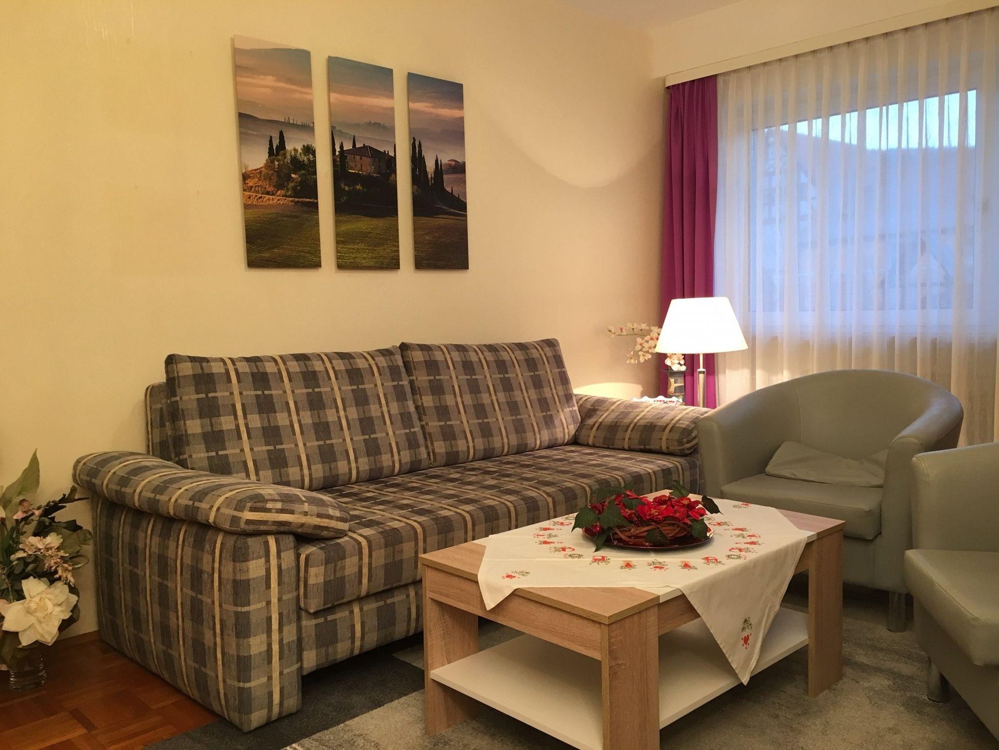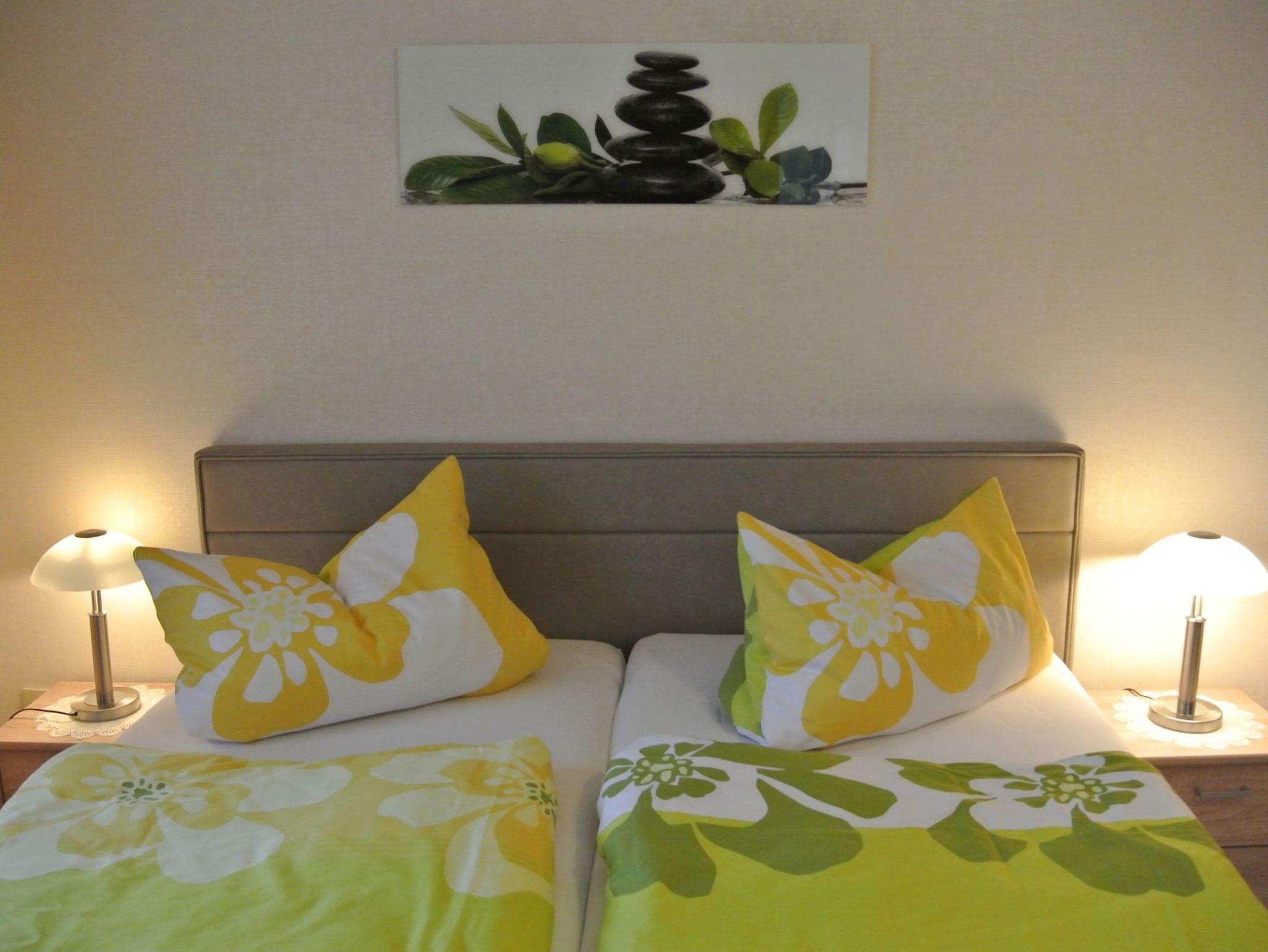 Im Schlafzimmer befindet sich ein Doppelbett und im Wohnzimmer eine Schlafcouch (2x1,60 m). Das neue Badezimmer verfügt über eine begehbare Dusche und WC, auch ein Föhn ist vorhanden. Ein zusätzlich separates WC bietet eine weitere Waschgelegenheit.