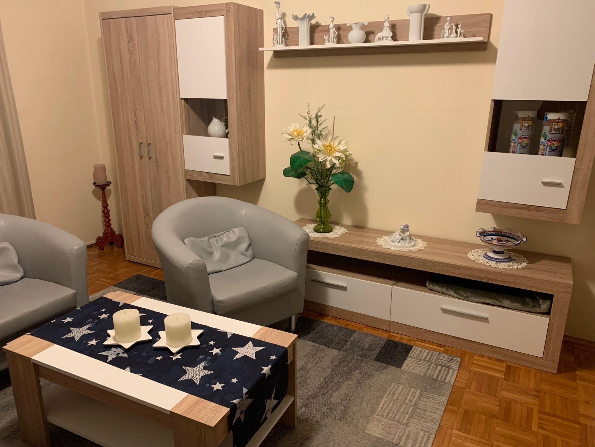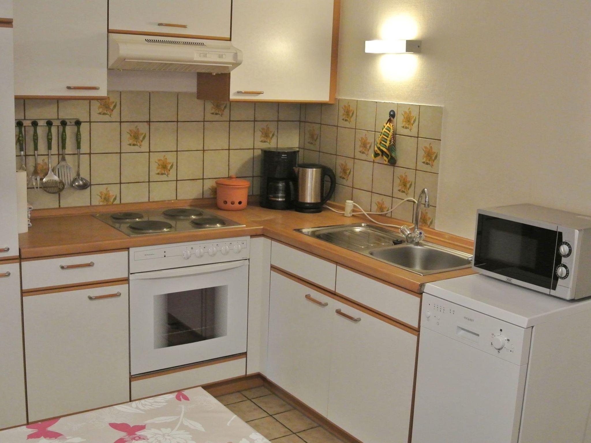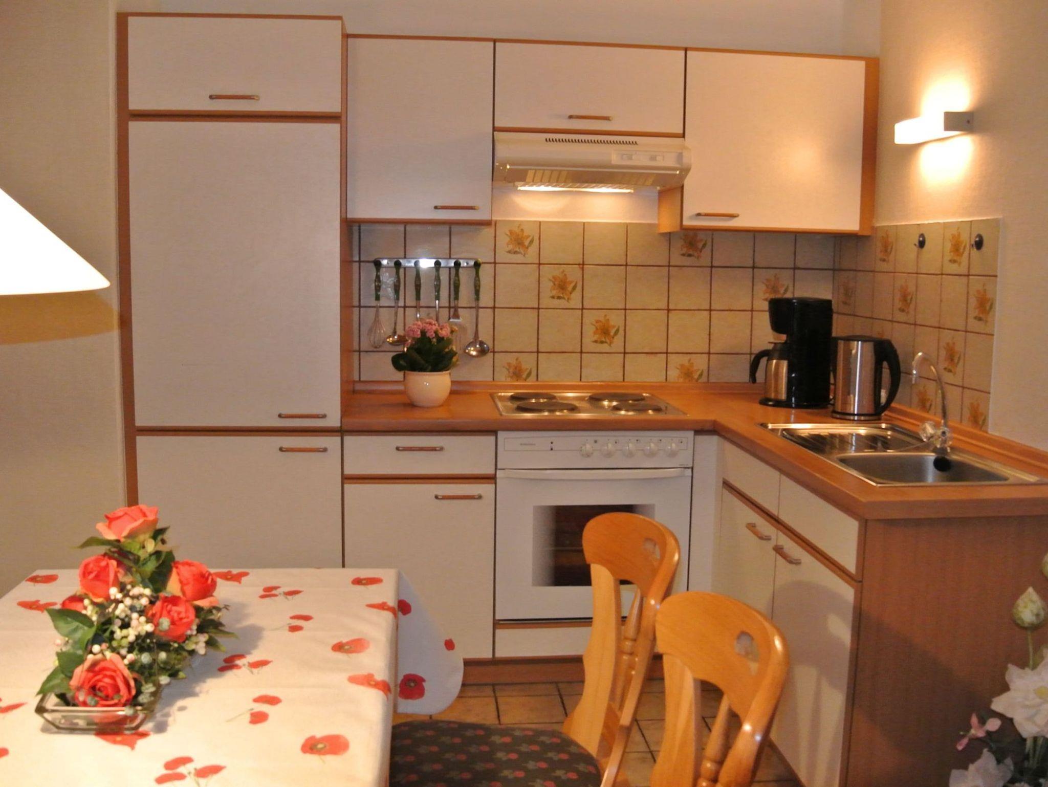 Die Wohnung ist ca. 60 qm groß. Sie verfügt über einen eigenen Eingang mit Windfang und ist ausgestattet mit einer komplett eingerichteten modernen Wohnküche einschließlich moderner elektrischer Küchengeräte, Mikrowelle und Geschirrspülmaschine sowie einer gemütlichen Sitzecke.