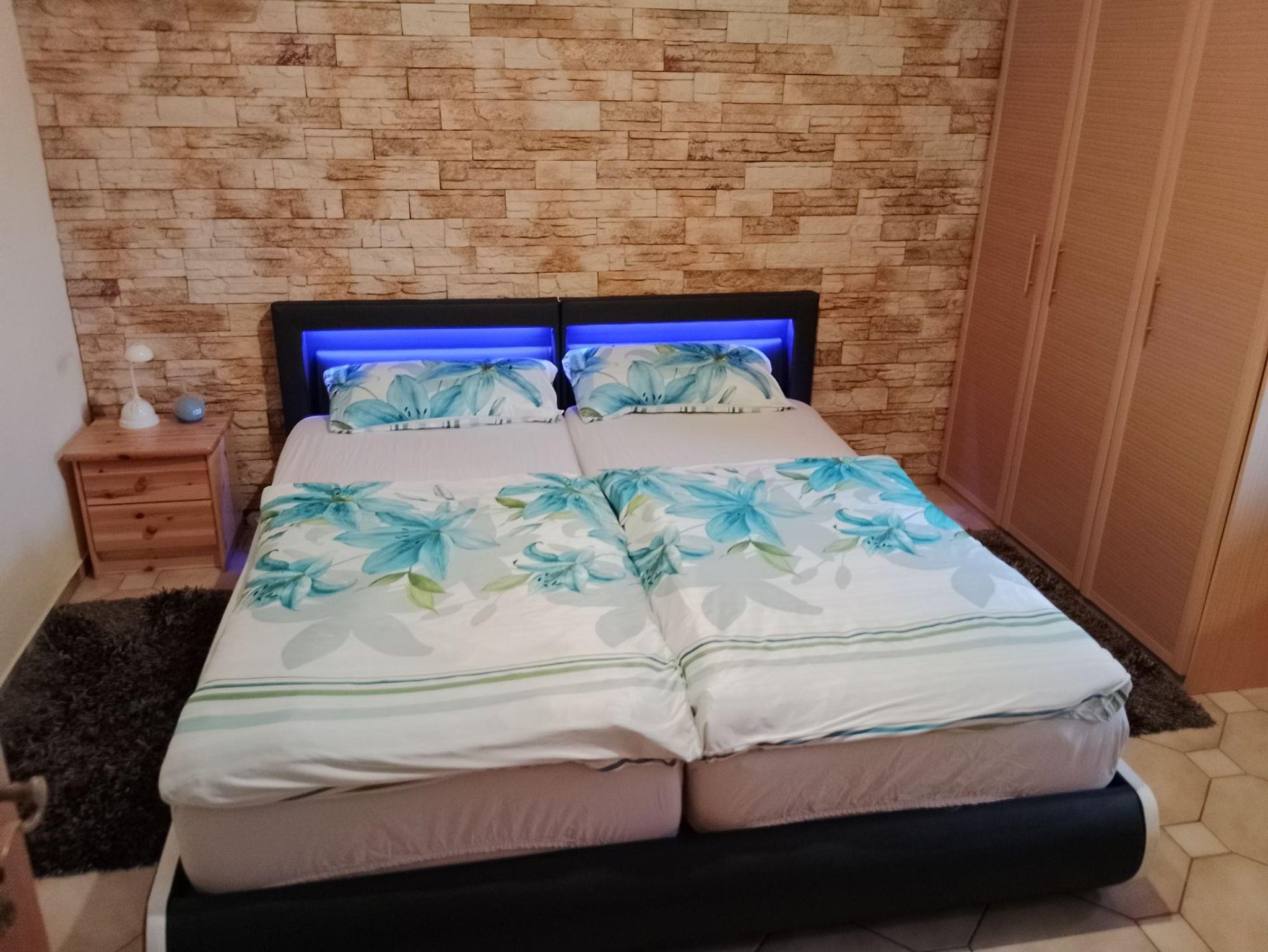 Ferienwohnung mit Doppelbett-Zimmer sowie Doppelbett-Schlafsofa, Küche, Bar- und Wohnraum, Toilette und Bad mit Dusche.