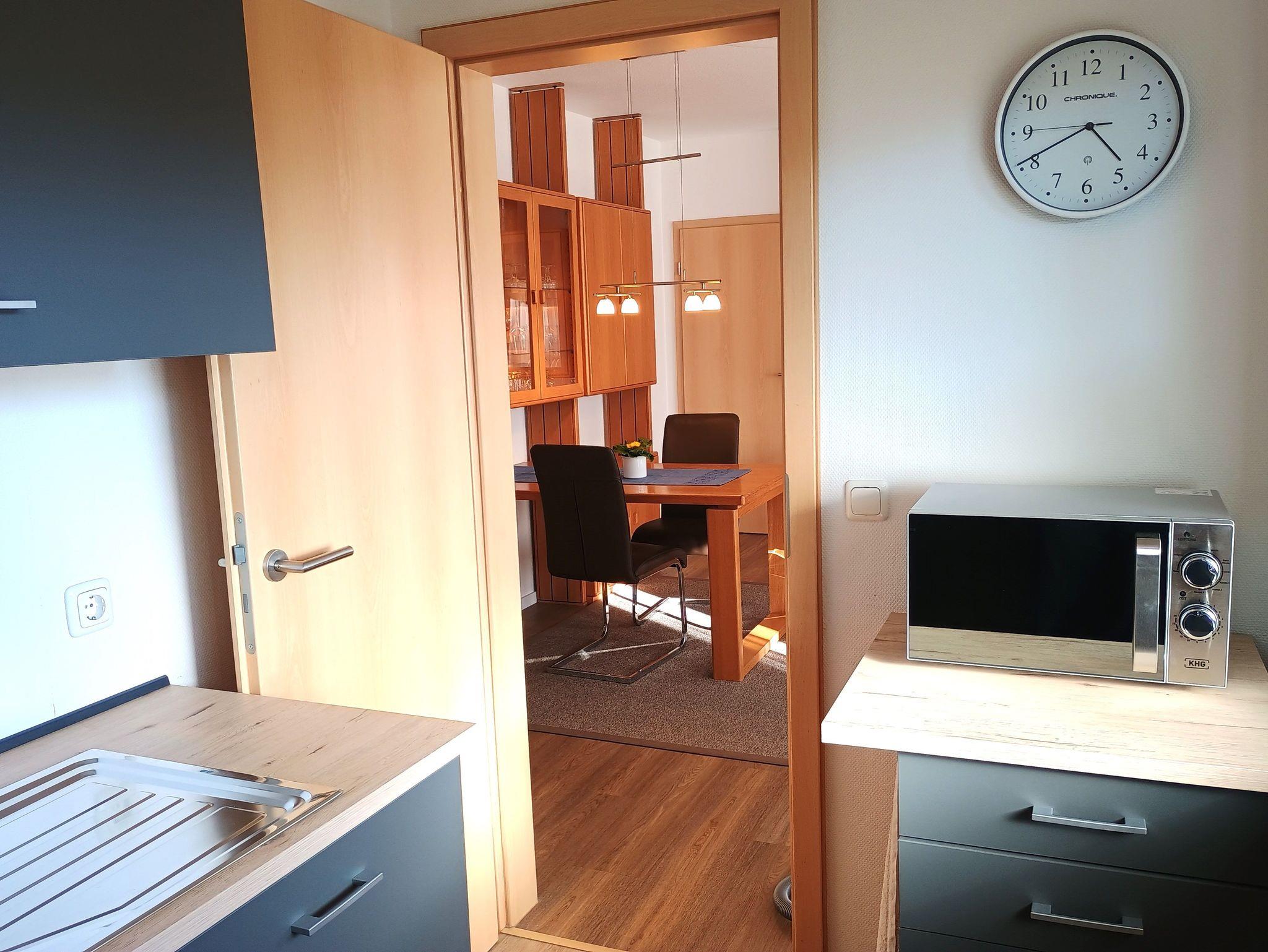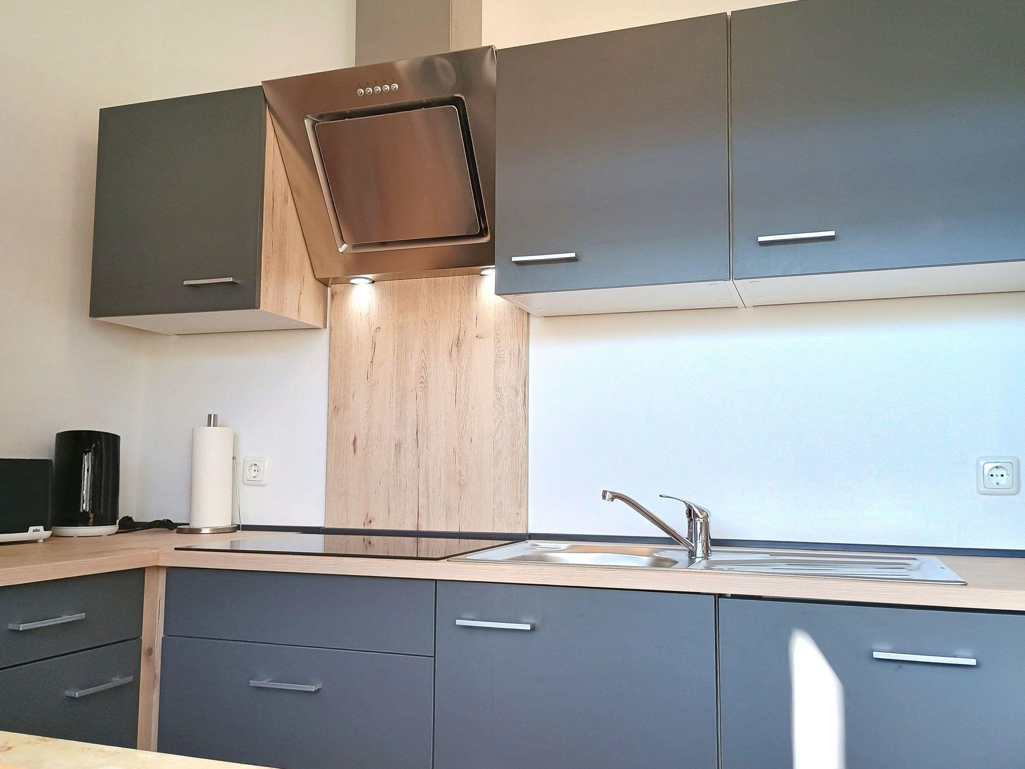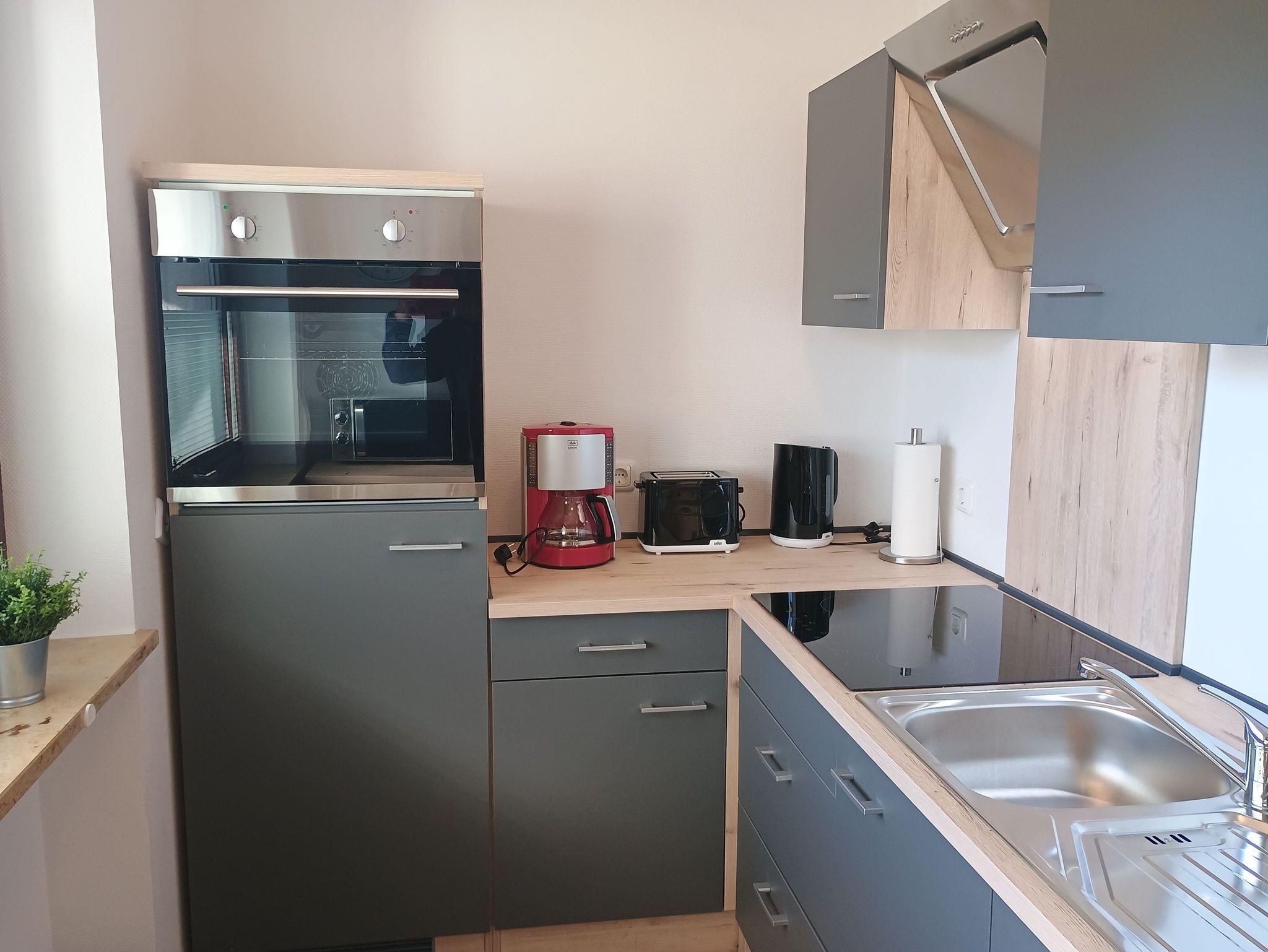 Die brandneue Einbauküche ist mit Ceran-Feld, Backofen, Mikrowelle, Geschirrspüler, Pad-Kaffeemaschine, wahlweise Filterkaffeeautomat, Toaster, Wasserkocher sowie einem Eierkocher ausgestattet.