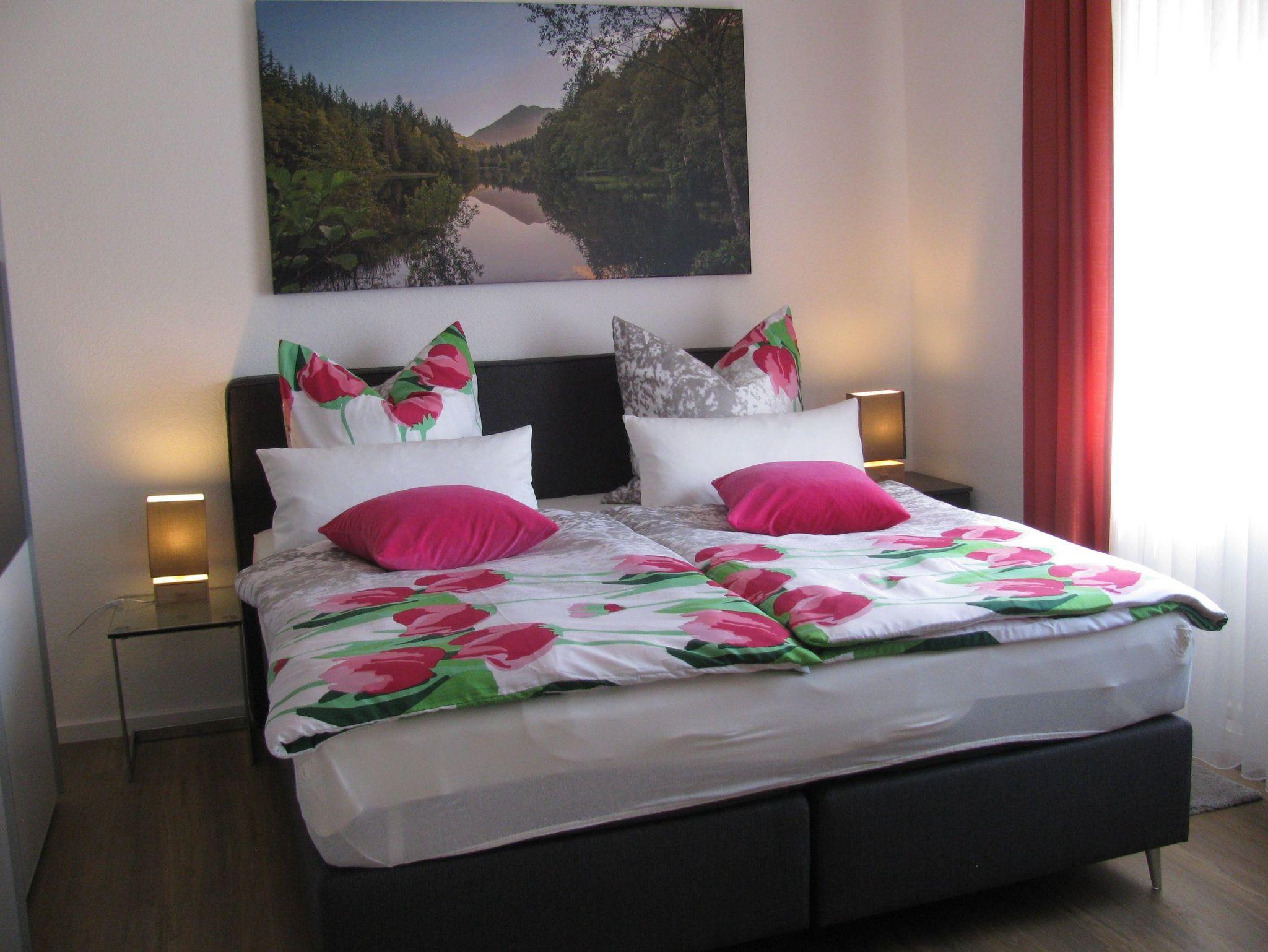 Das moderne Schlafzimmer ist mit einem Doppel-Boxspringbett und einem großem Schiebetürenschrank ausgestattet.