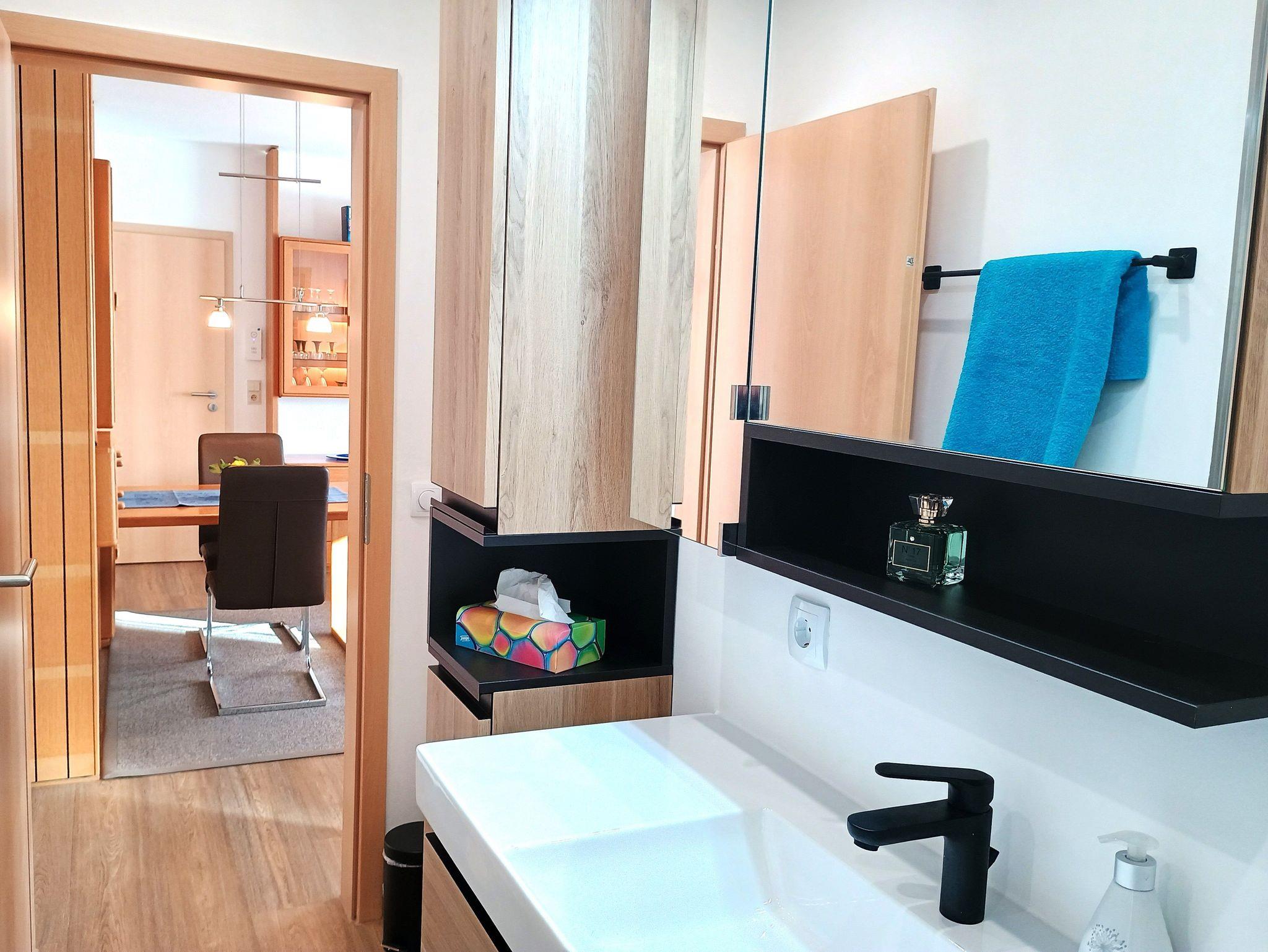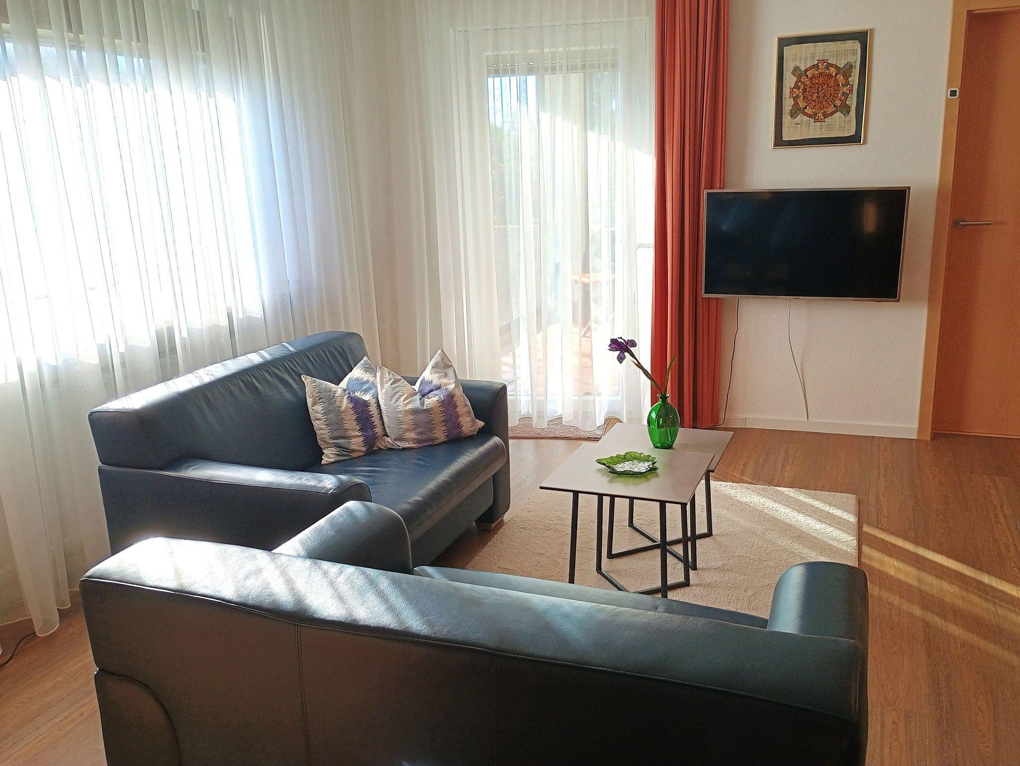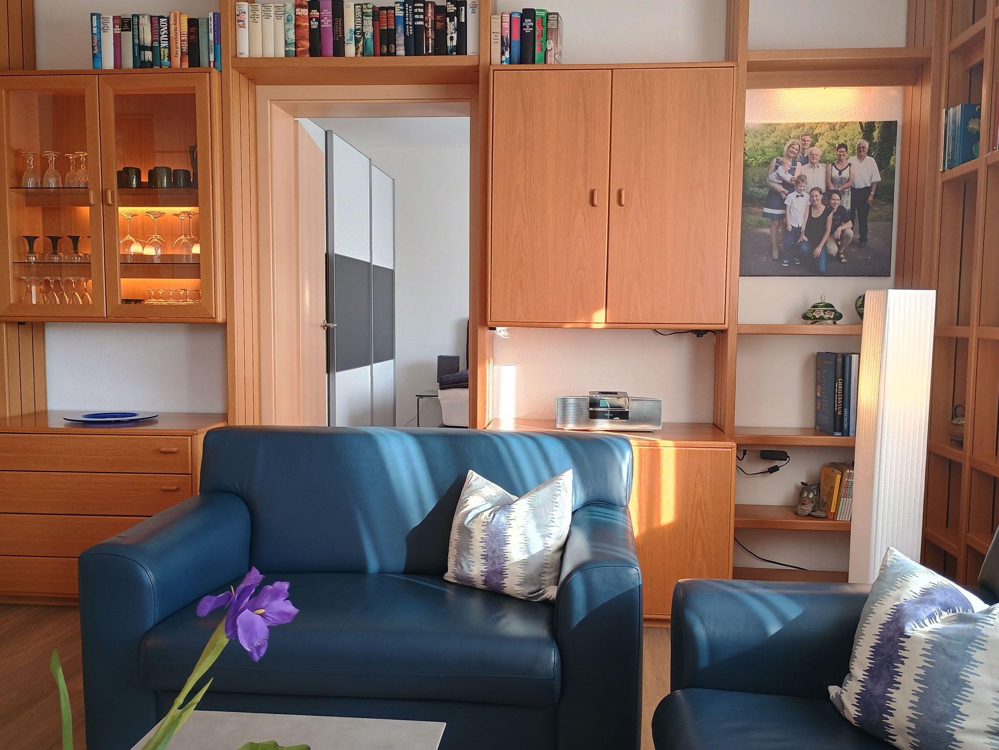 Im Wohnzimmer erwarten Sie innenbeleuchtete Schrankwände, exklusive Ledercouches, ein Essplatz, ein Smart-TV, eine Musikanlage, W-LAN und zahlreiche Bücher. Sie finden dort ebenso Exkursionsbücher (Burgen, Höhlen, Biergärten, Wanderungen etc).