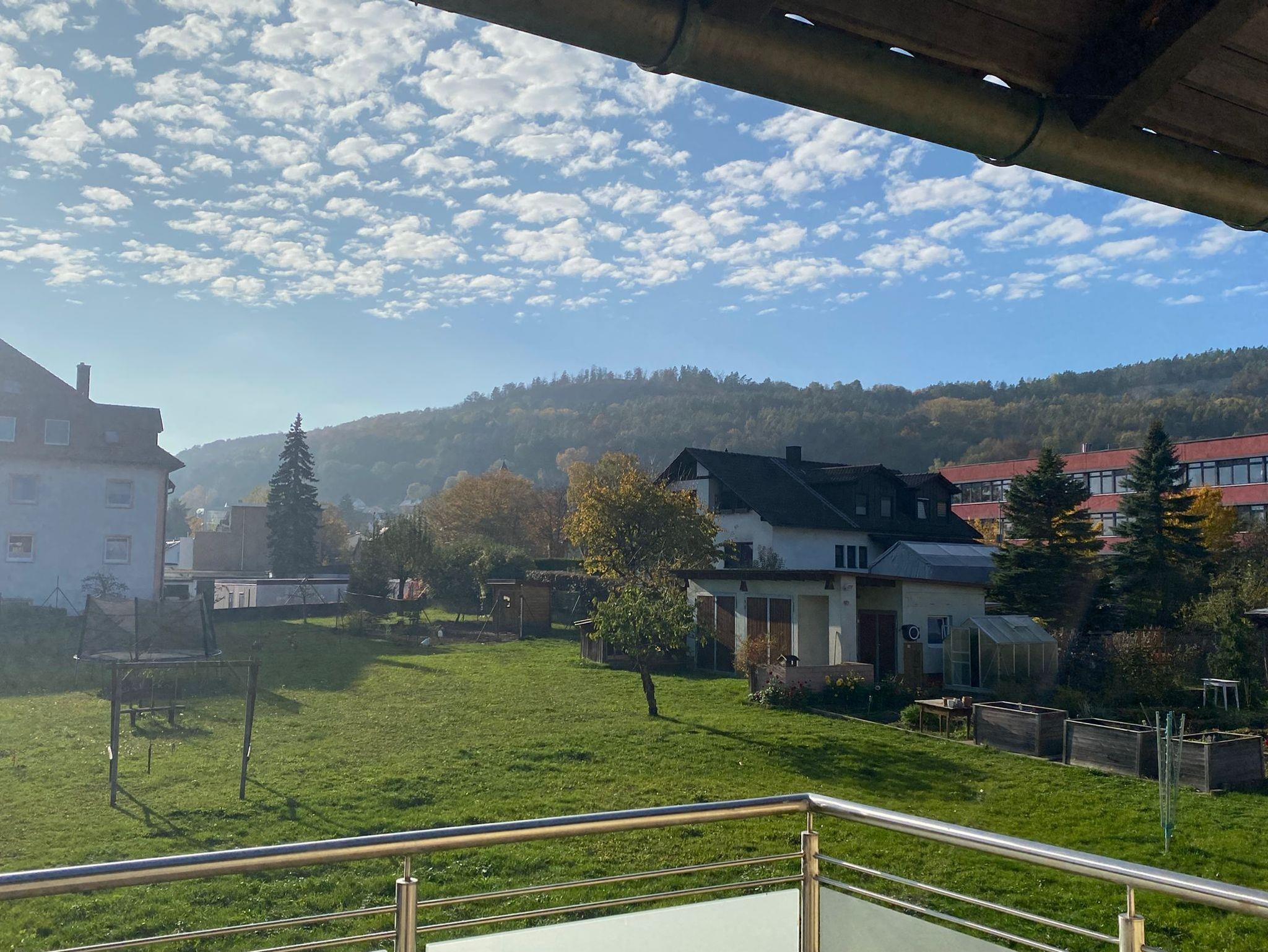 Sie ist circa 100qm groß, verfügt über einen großen Balkon mit Blick in den Garten und einen kleinen Balkon.