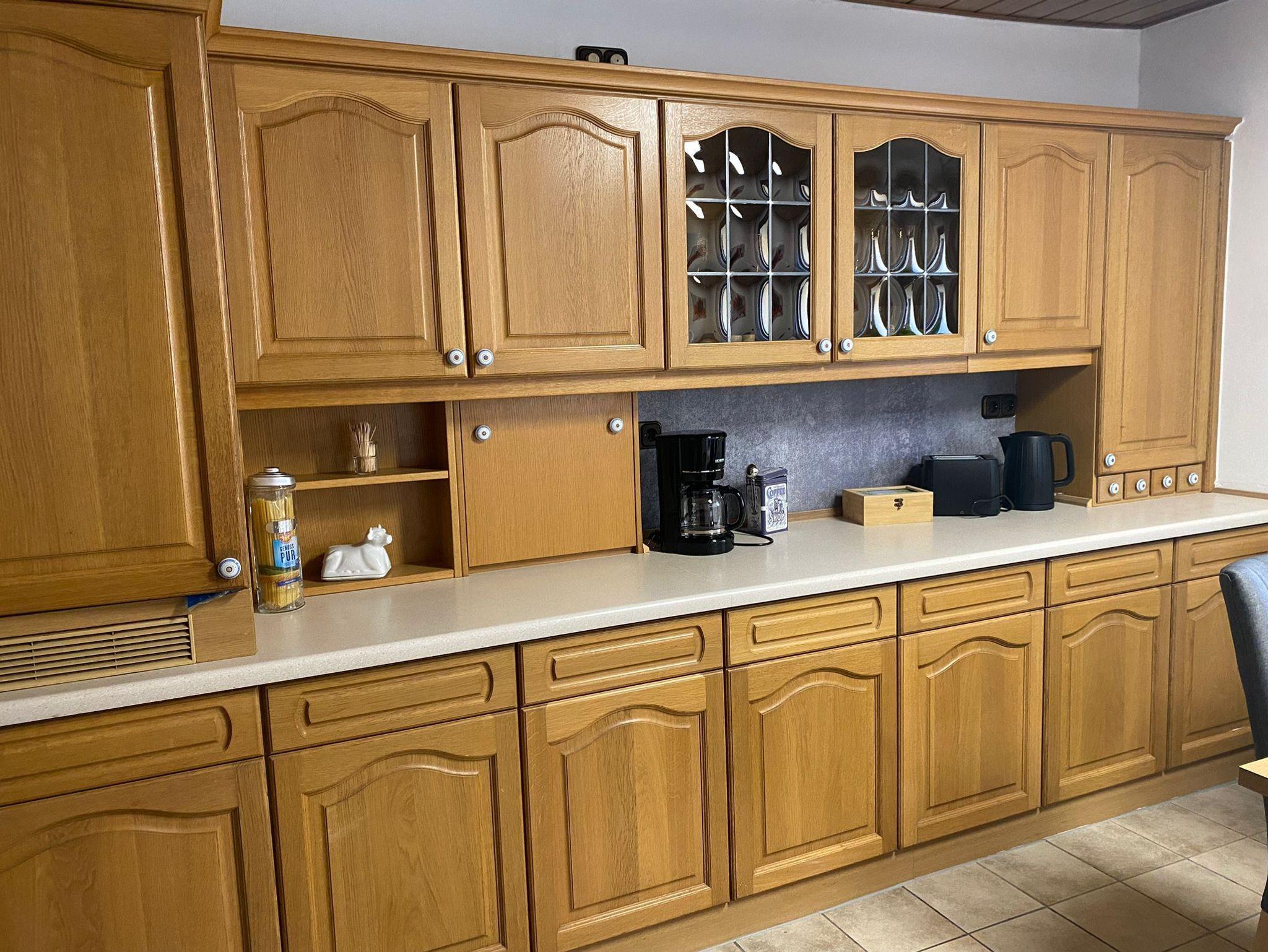 In der geräumigen Küche befindet sich neben einem Herd mit Backofen und einem Esstisch alles, was zum Kochen benötigt wird: Toaster, Eierkocher, Wasserkocher, Kaffeemaschine, Spülmaschine, Geschirrtücher, Wischlappen, sowie Reinigungsmittel sind ebenfalls vorhanden.