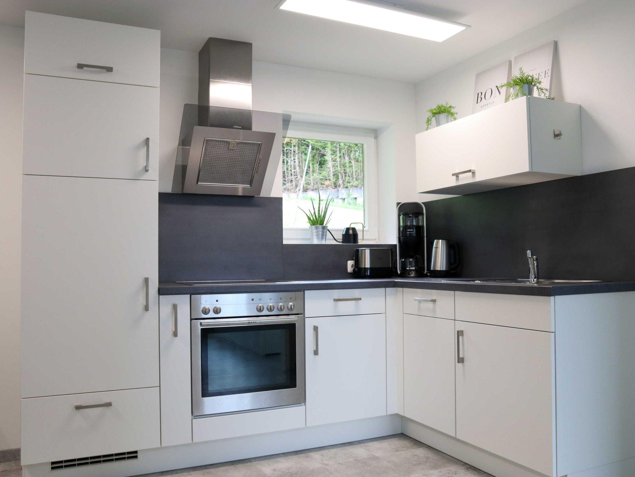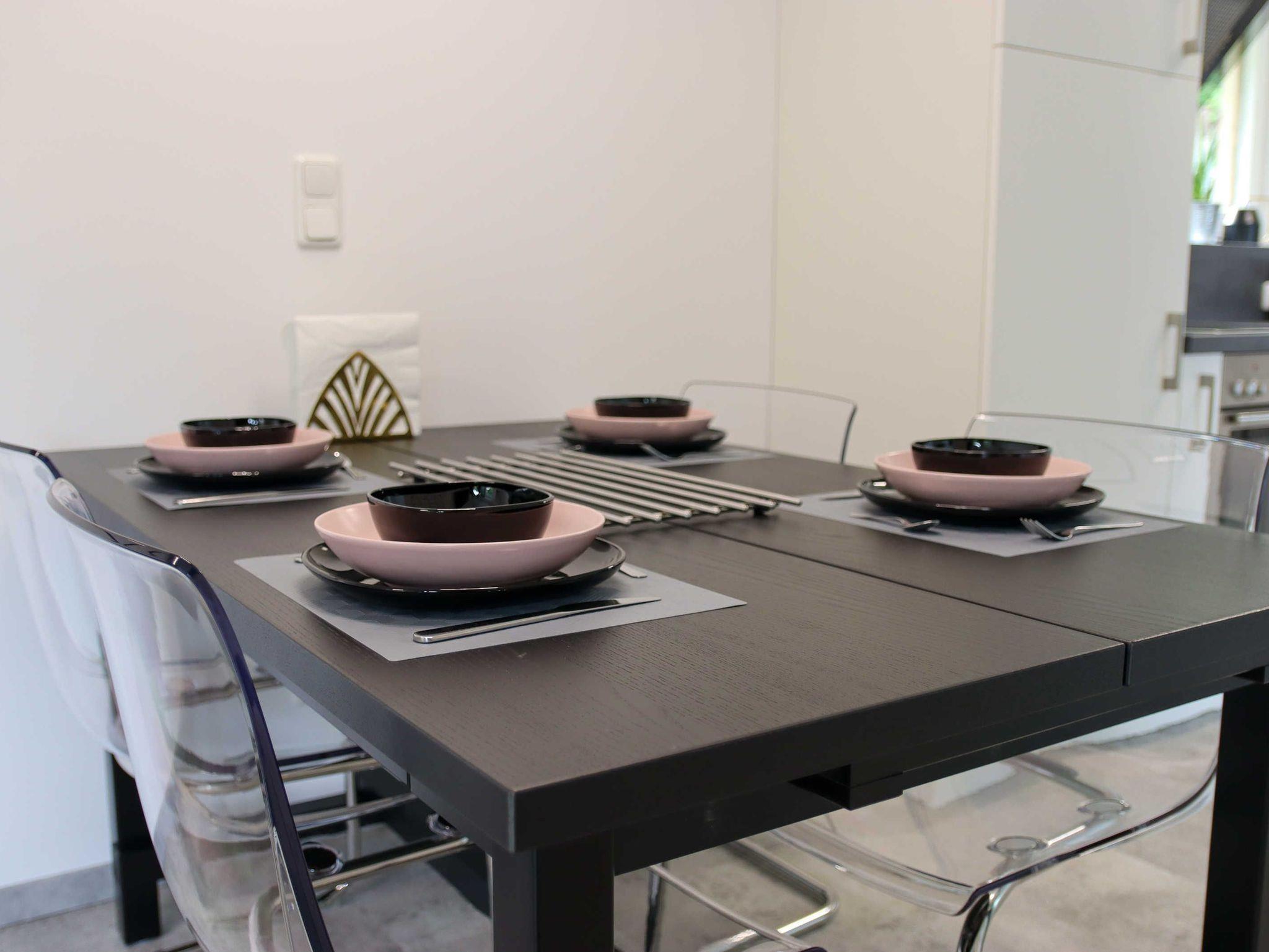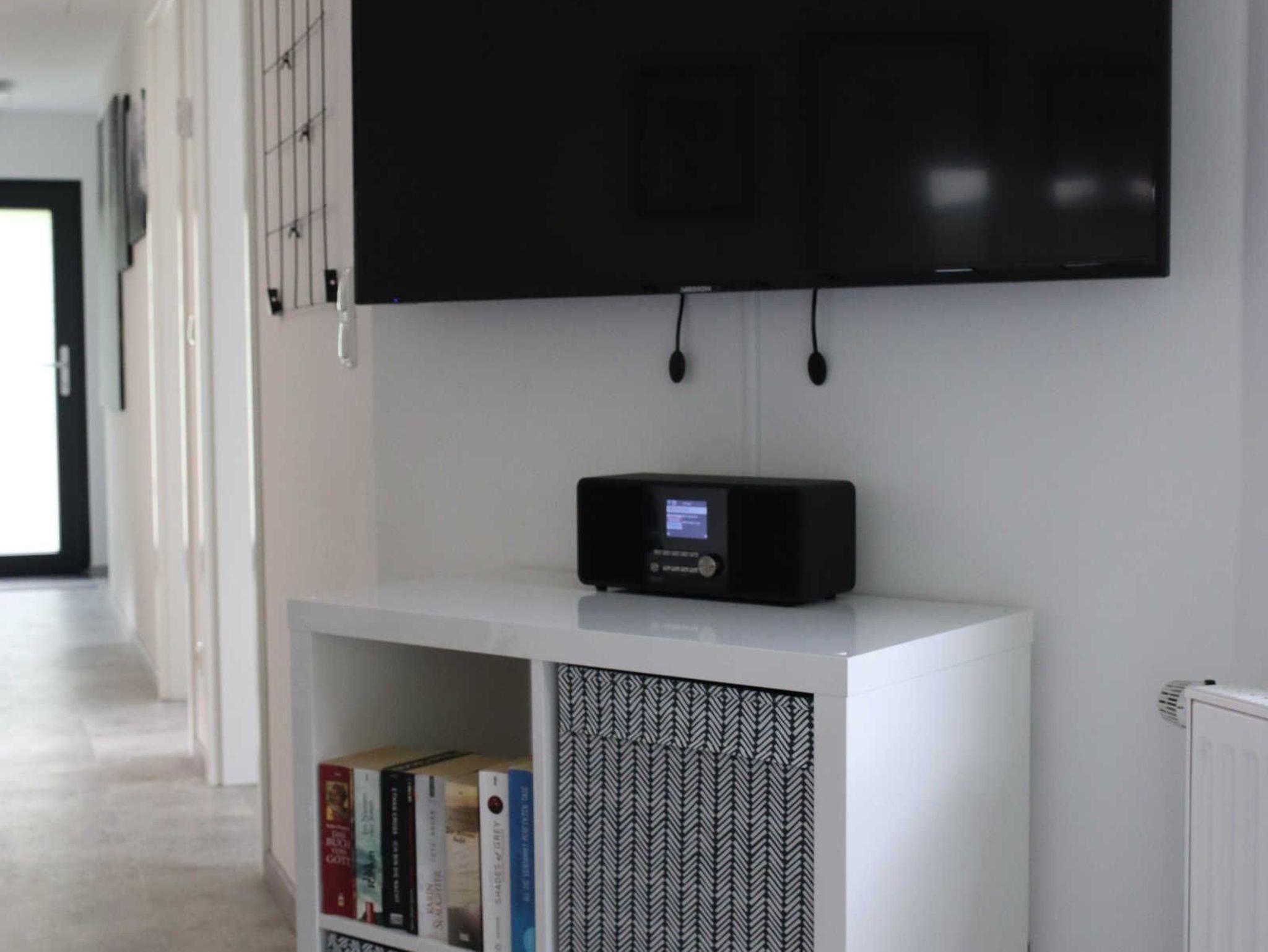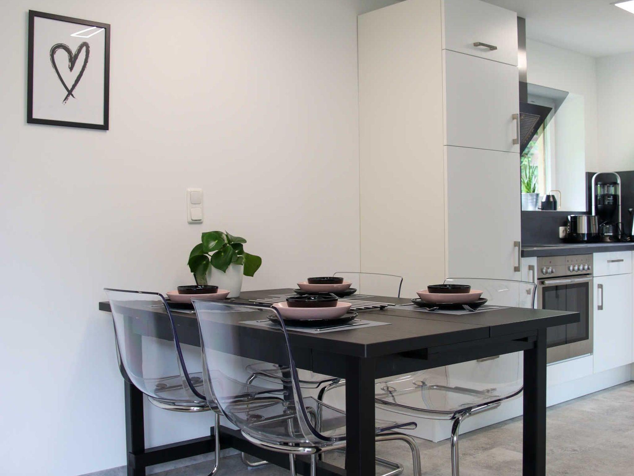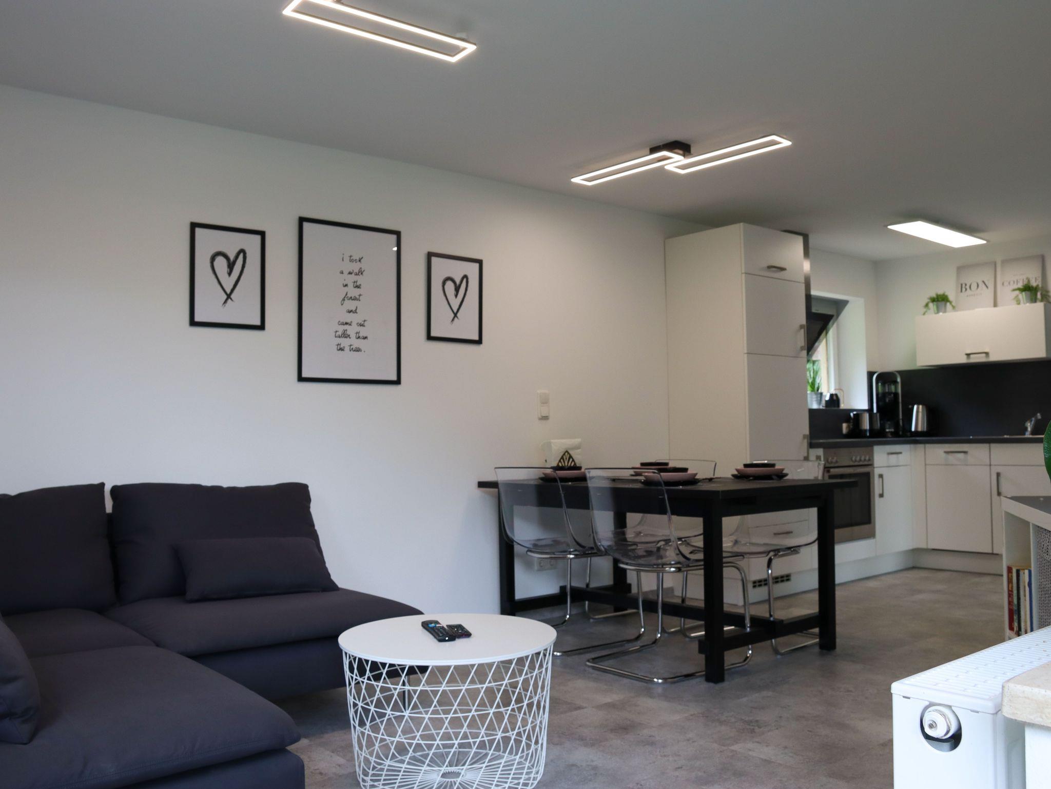 Der gemütliche Wohnraum mit offener Küche bietet einen Sofabereich mit Smart-TV, Internetradio und einen großen Esstisch mit zusätzlicher Ausziehmöglichkeit.