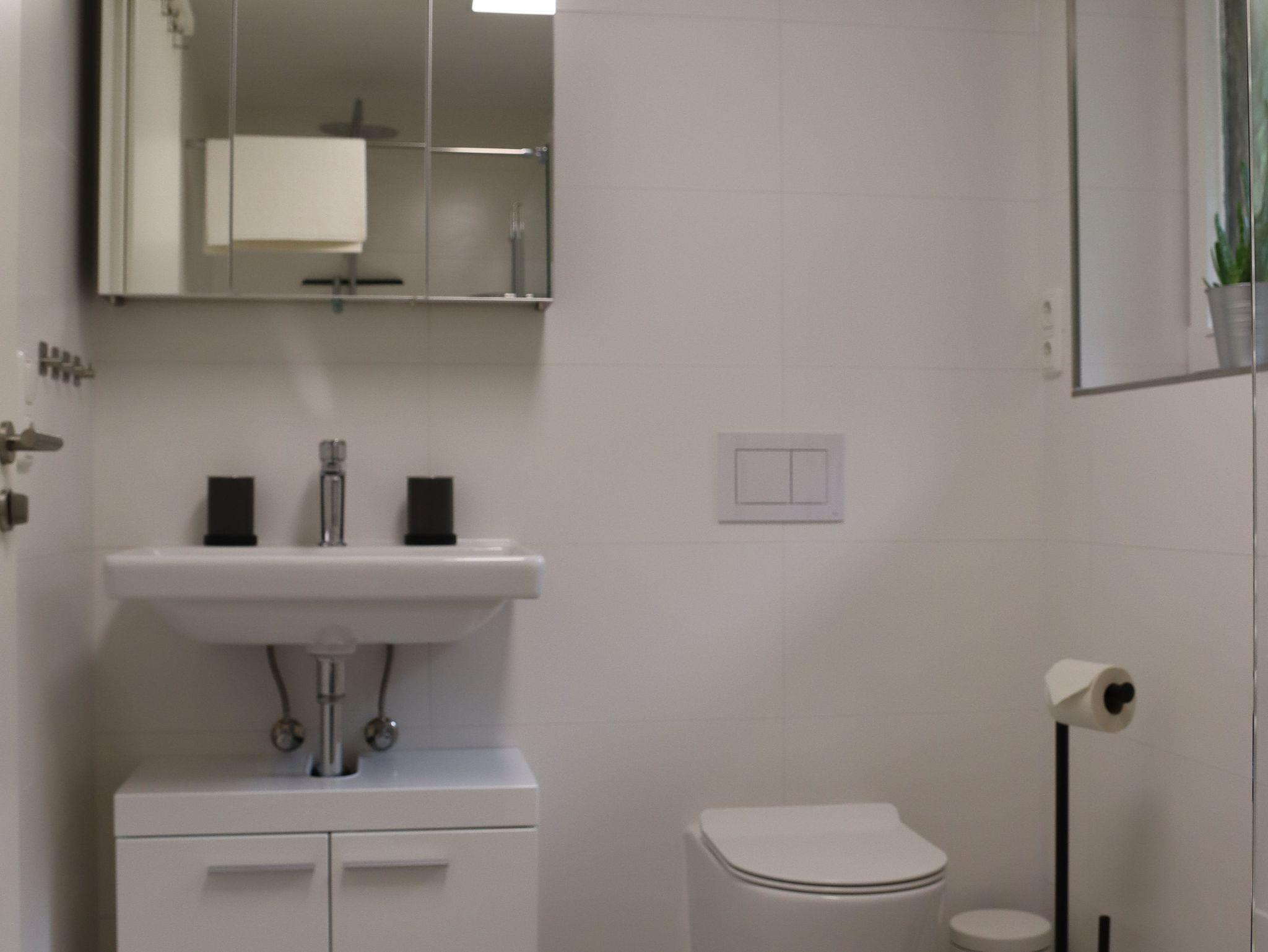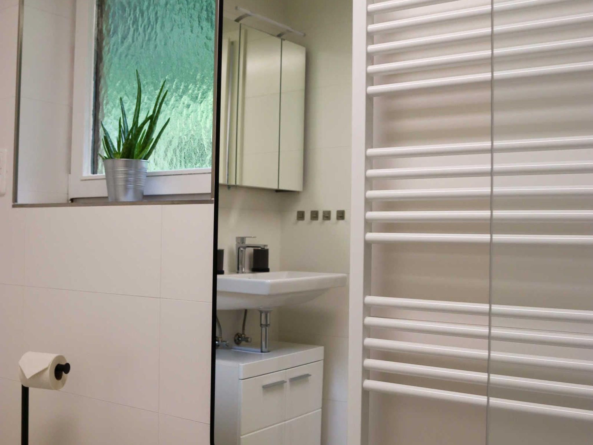 Das Bad ist mit einem Drei-Seiten-Spiegel, Fußboden- und Handtuchheizung, Haartrockner und großer, ebenerdiger Dusche ausgestattet.