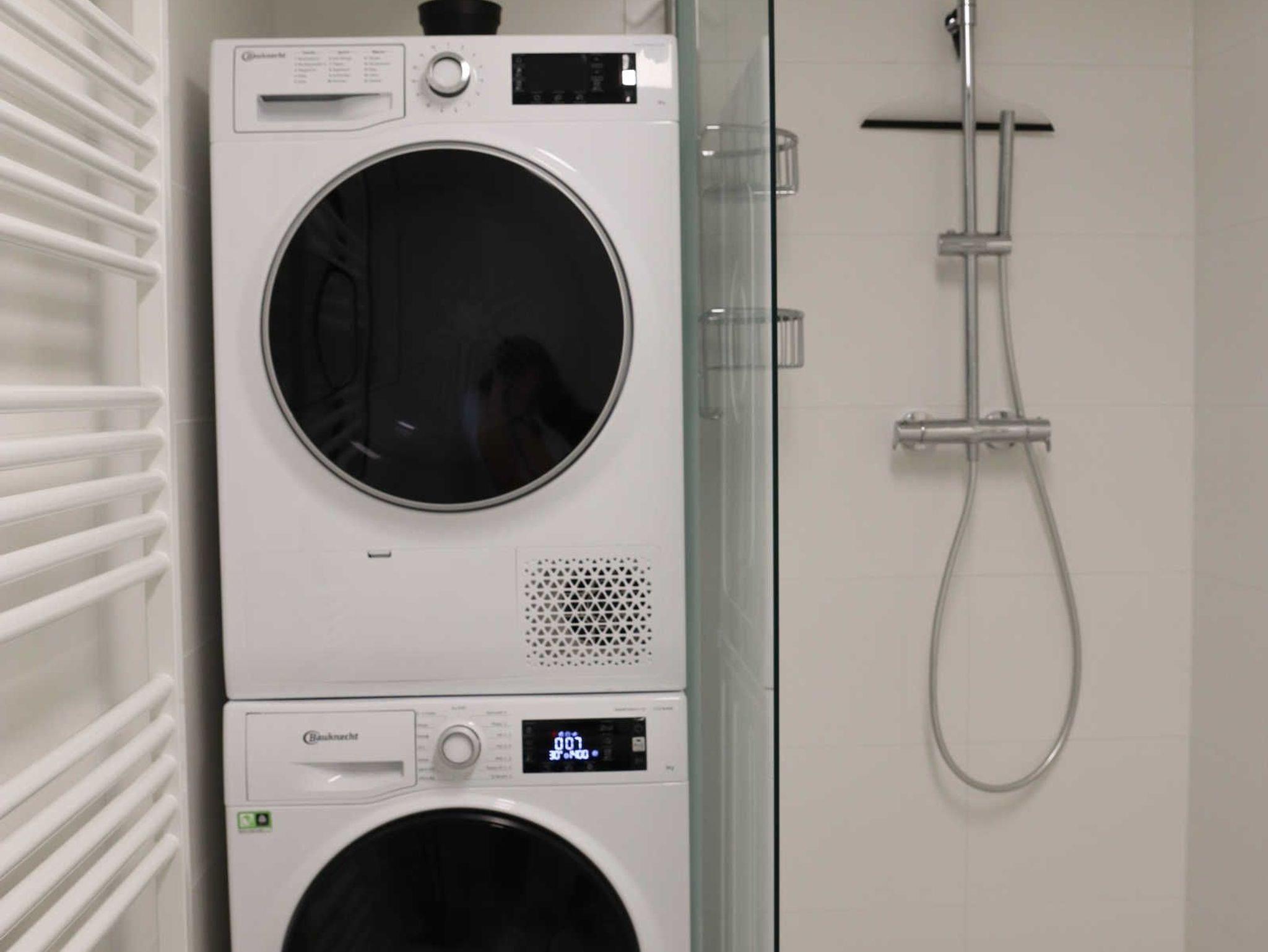 Eine Waschmaschine und ein Trockner stehen im Bad zur Verfügung.