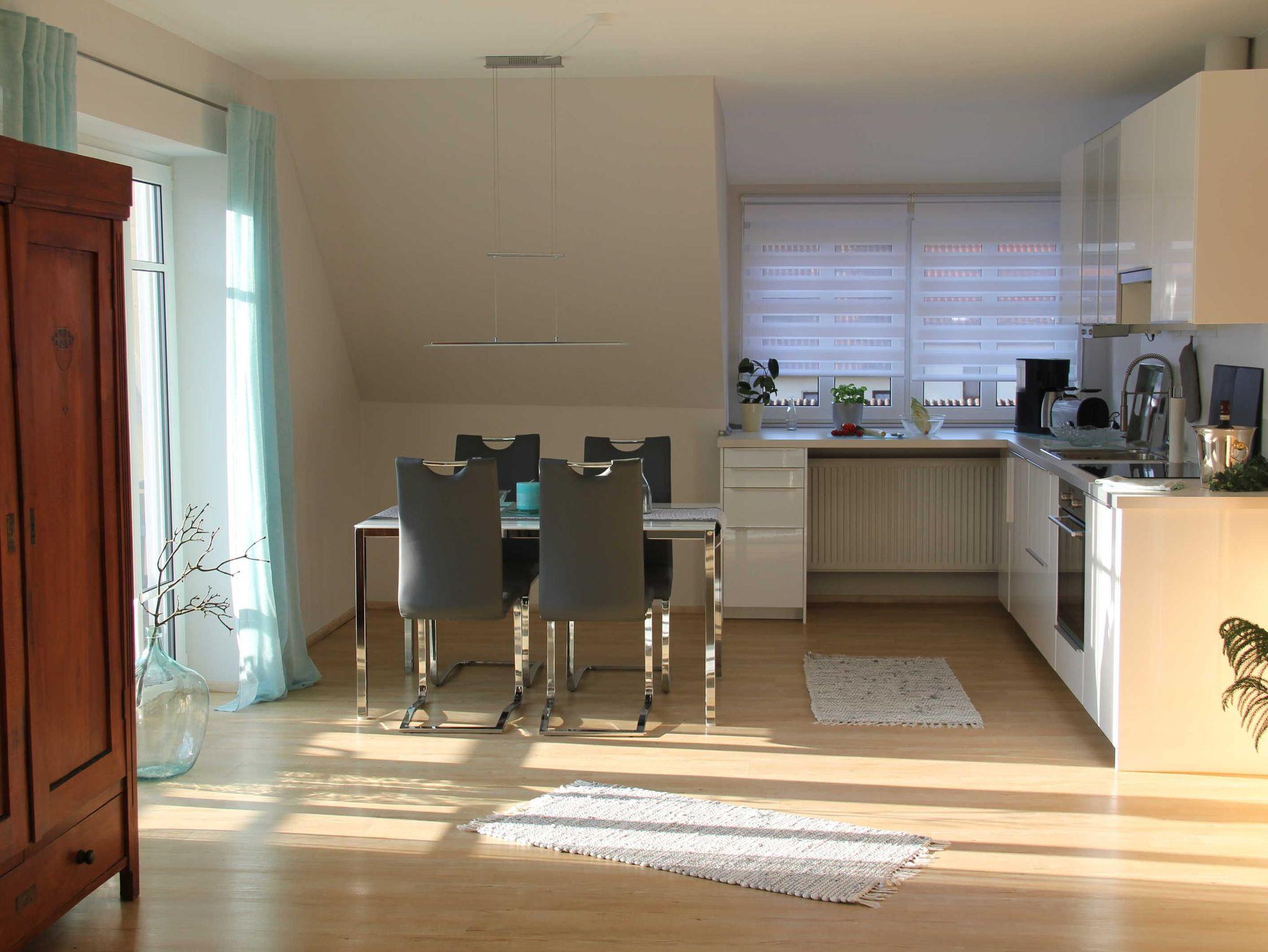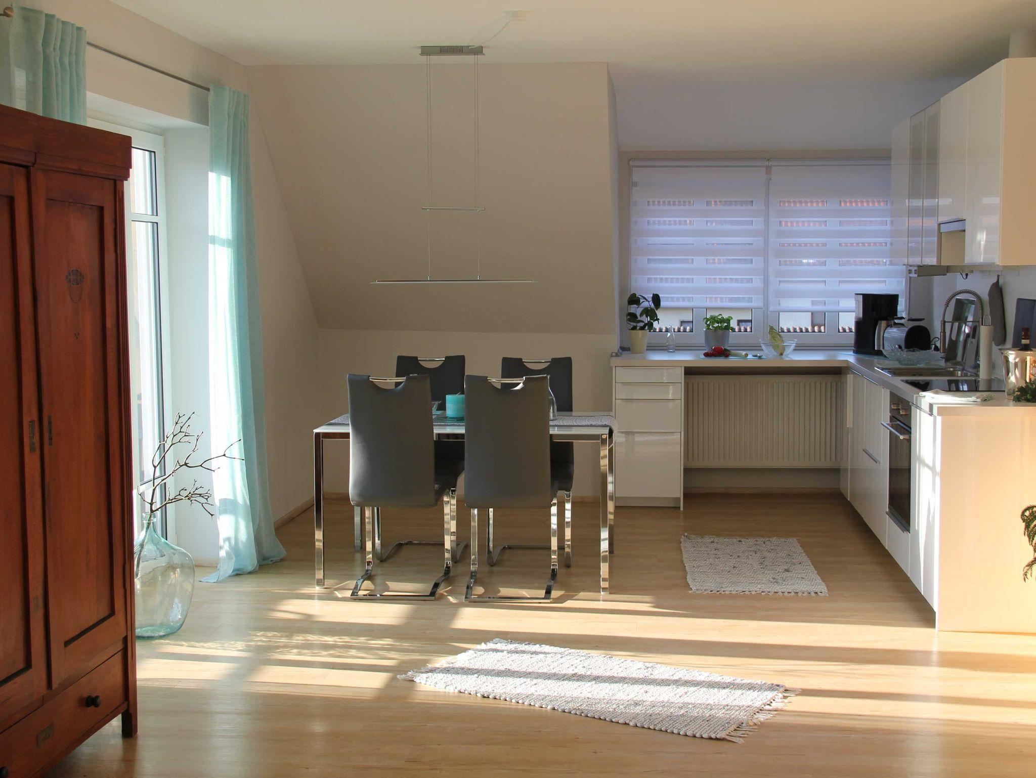 Der Wohnbereich lädt mit komfortabler Eckcouch, Couchtisch, Lesesessel, Flachbild-TV sowie einer Auswahl an Büchern und Spielen zum Verweilen ein. Der angrenzende Essbereich bietet Platz für bis zu 4 Personen; ein Kinderhochstuhl kann auf Wunsch bereitgestellt werden.