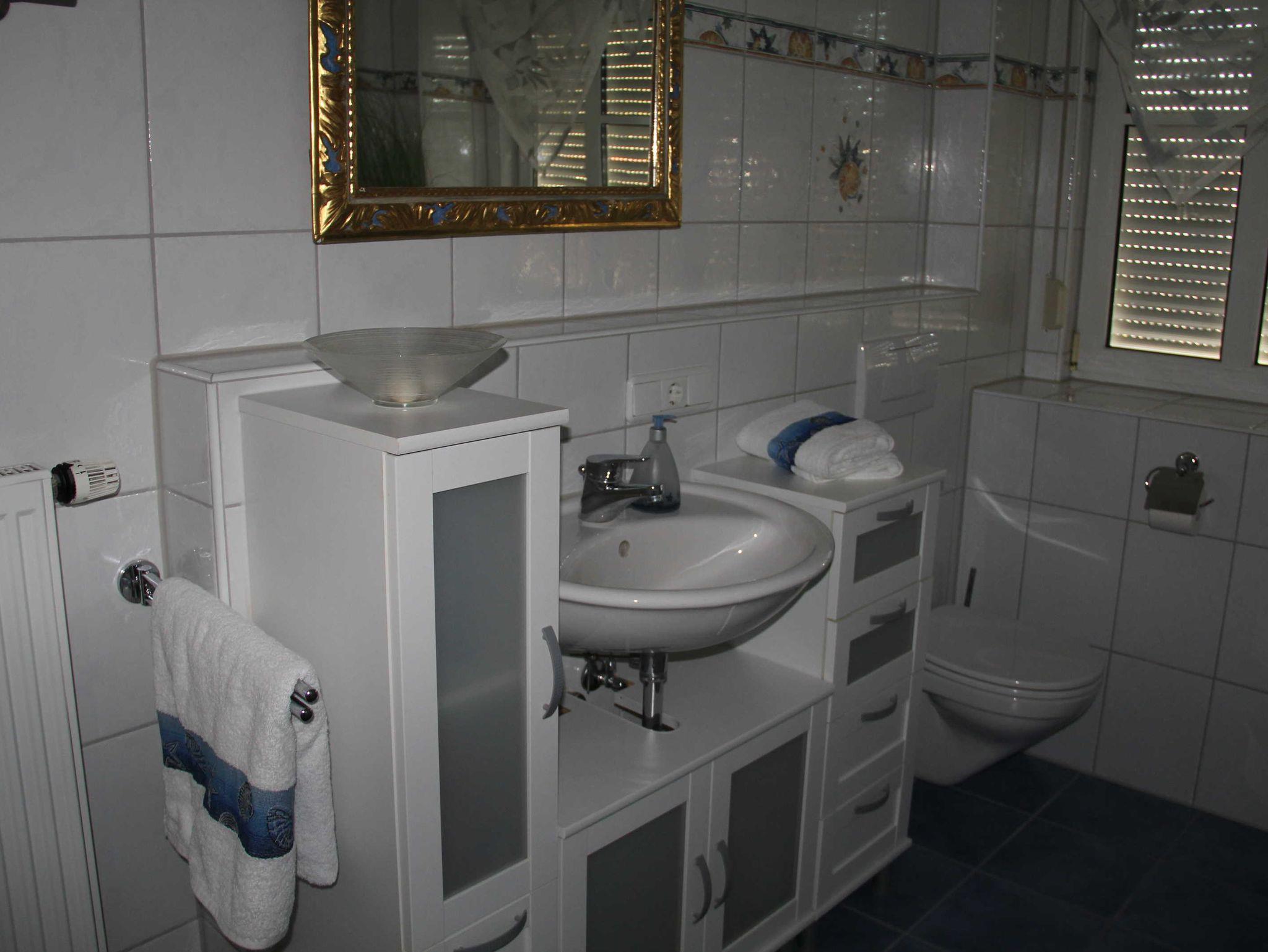 Das Tageslichtbad (7 m²) verwöhnt mit Badewanne, Dusche, modernen Badmöbeln, Kosmetikspiegel, Föhn, Handseife und WC.
