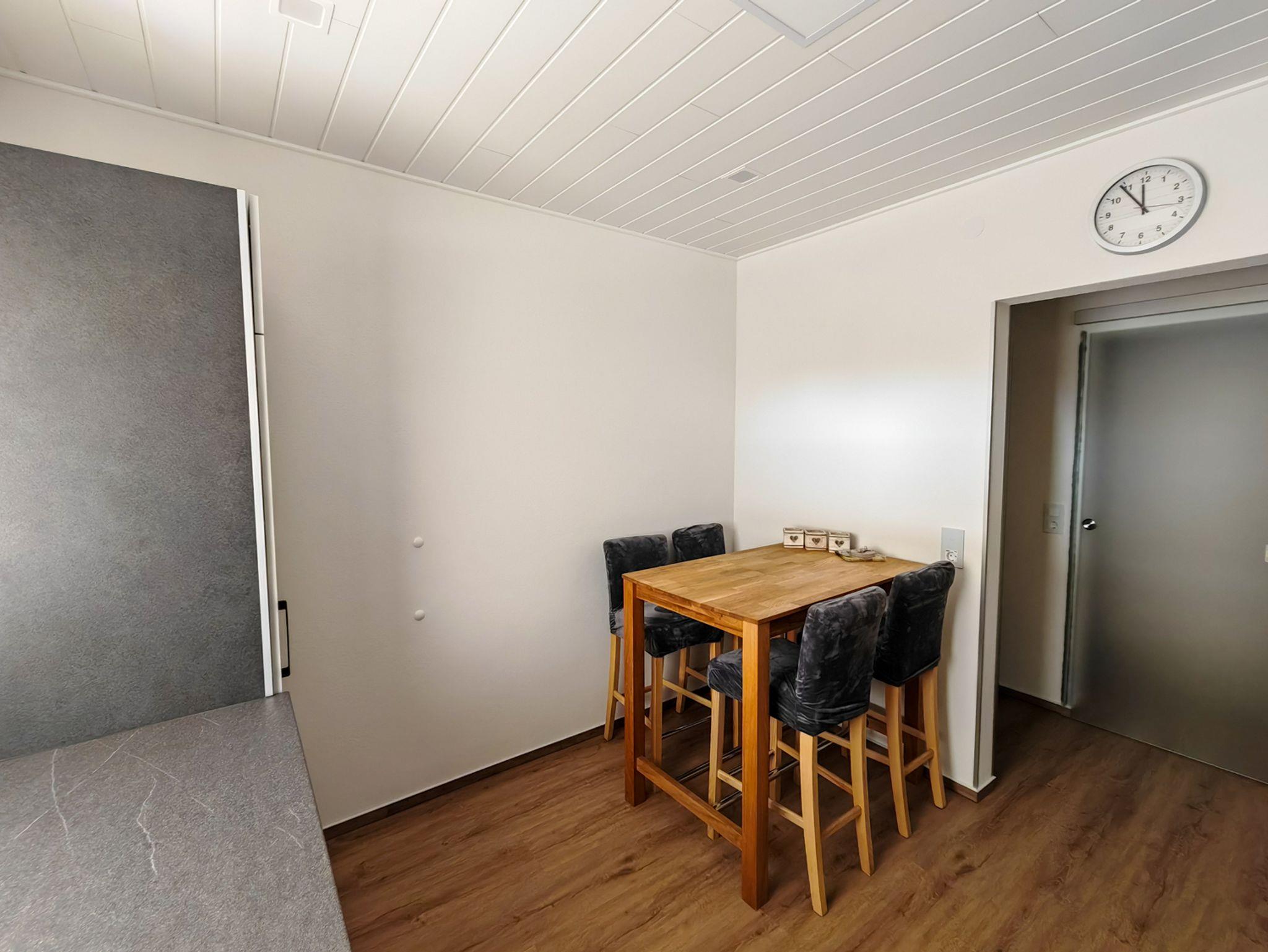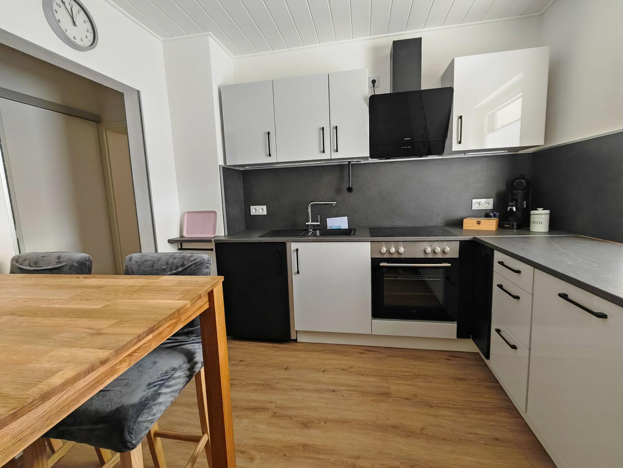 Die komplett ausgestattete Küche mit Geschirrspüler, Kühlschrank inkl. Gefrierfach, Herd, Backofen, Mikrowelle, Wasserkocher, Eierkocher, Toaster und Kaffeepadmaschine lässt keine Wünsche offen. Geschirr und weitere Kochutensilien gehören ebenfalls zur Ausstattung.