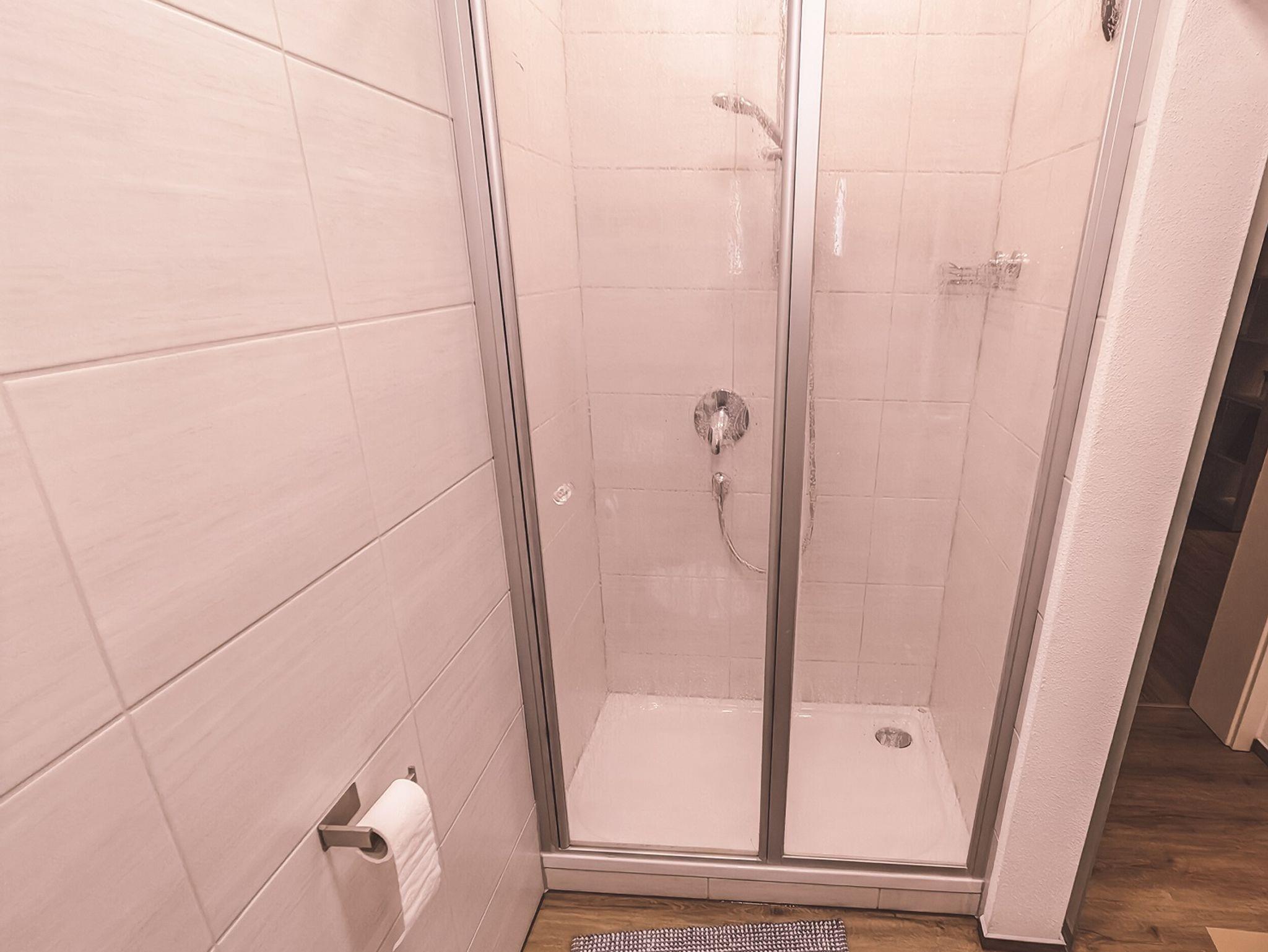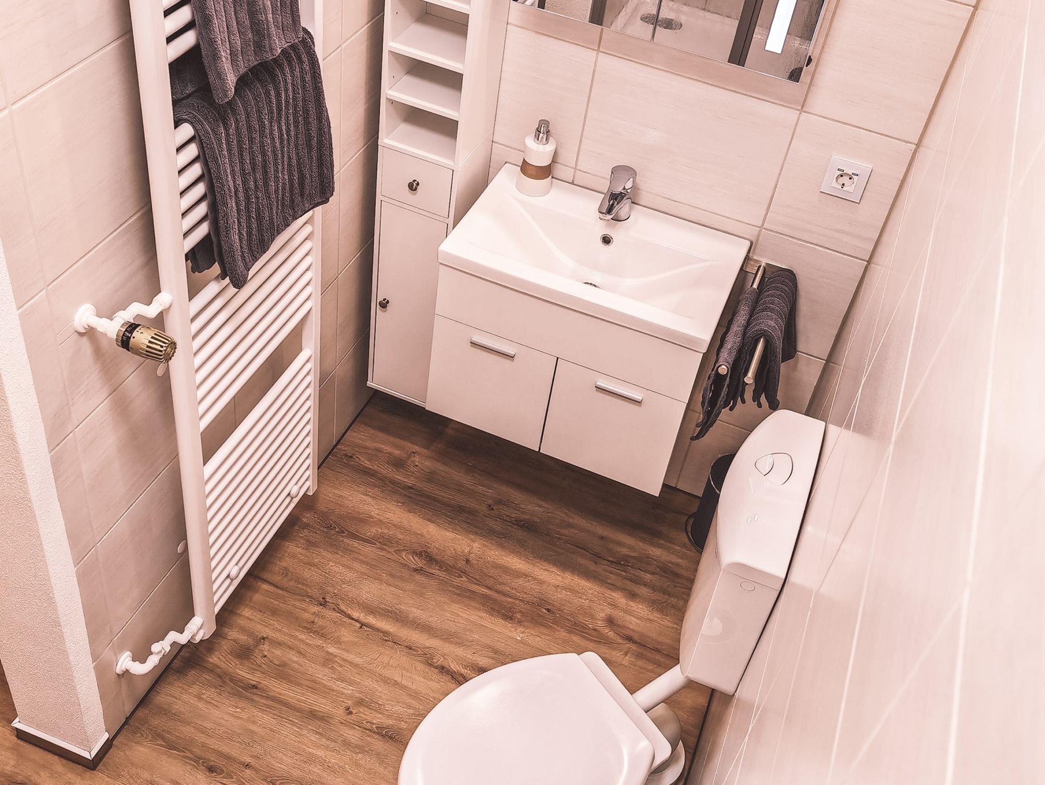 Das Bad verfügt über eine geräumige Dusche, WC, Waschbecken mit Spiegelschrank und Handtuchtrockner.