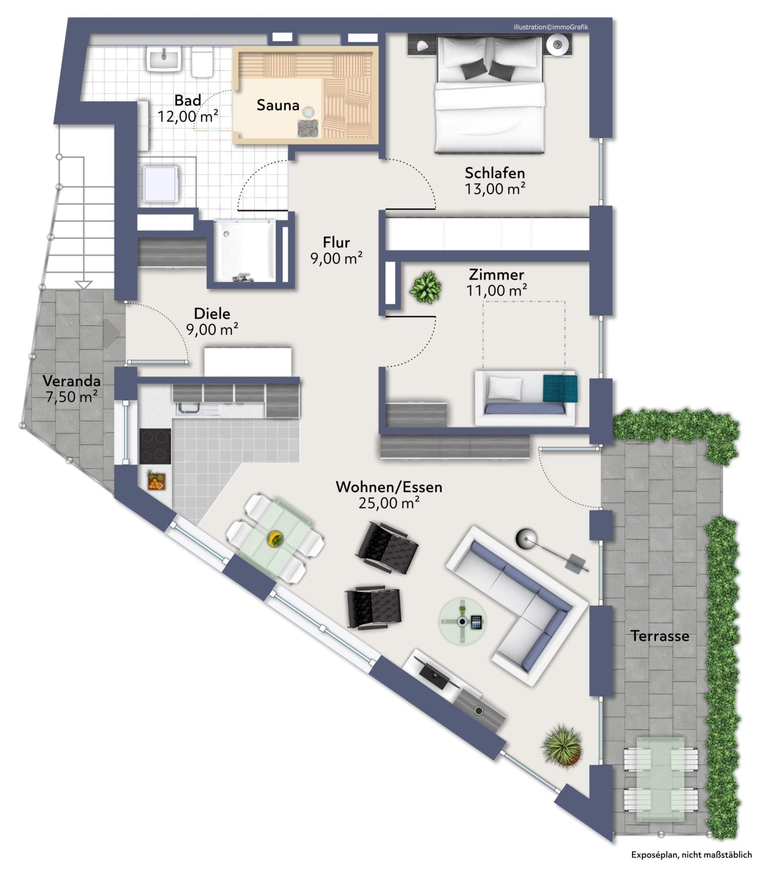 Die hochwertige, zur Entspannung einladende Sauna ist das beliebte Herzstück der Wohnung. Genießen Sie nach dem Saunagang Ihre Ruhepause auf der mit einer Buchenhecke umgebenen Terrasse und einem wunderschönen Blick auf das Hafenbecken. Der gemütliche offene Wohn- und Essbereich, mit voll ausgestatteter Küche, la¨dt zum gemeinsamen Entspannen und Kochen ein! Die Ferienwohnung verfügt über eine Veranda und eine Terrasse mit wunderschönem Ausblick auf das Hafenbecken. Das Hauptschlafzimmer wurde mit einem modernen Doppelbett (180x200) und einem Kleiderschrank ausgestattet und bietet somit die gewünschte nächtliche Erholung! Das Schlafsofa im zweiten Schlafzimmer bietet zudem U¨bernachtungsmo¨glichkeiten fu¨r 2 weitere Personen. Die Saune befindet sich im Badezimmer mit ebenerdiger Dusche. Die komplette Wohnung ist mit Vinylboden und Fußbodenheizung ausgestattet. Die im Hochparterre des Appartementhauses gelegene Ferienwohnung kann ''barrierefrei'' über einen Aufzug, mit direktem Zugang aus der Tiefgarage erreicht werden. Die Symbole vom Wohngrundriss können in der Darstellung von der tatsächlichen Innen- und Außengestaltung der Wohnung abweichen!