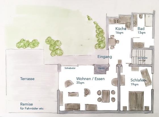 Die Ferienwohnung ist komplett ebenerdig. Den separaten Eingang erreichen Sie durch unseren idyllischen GARTEN mit eigener sonniger Terrasse.