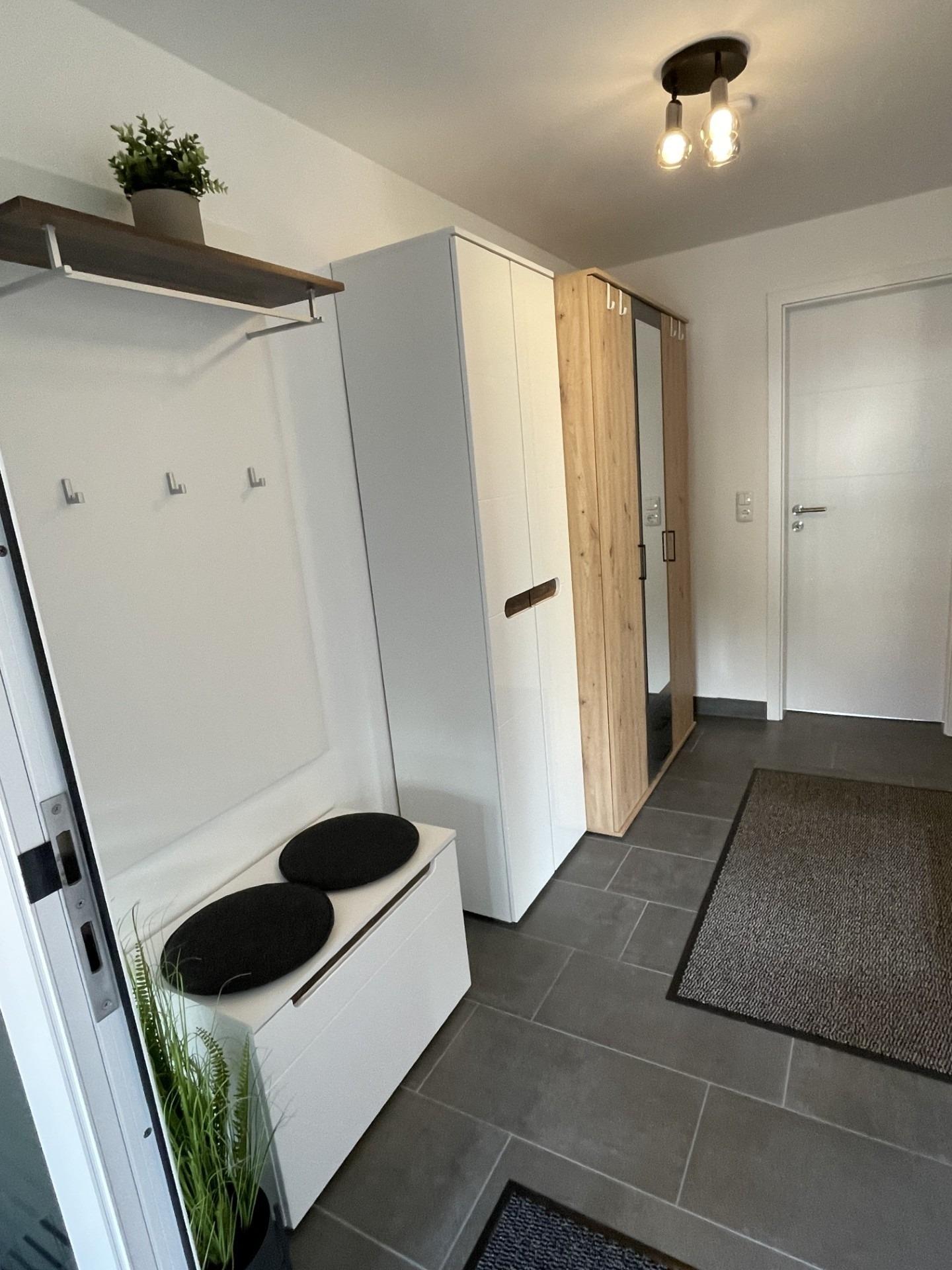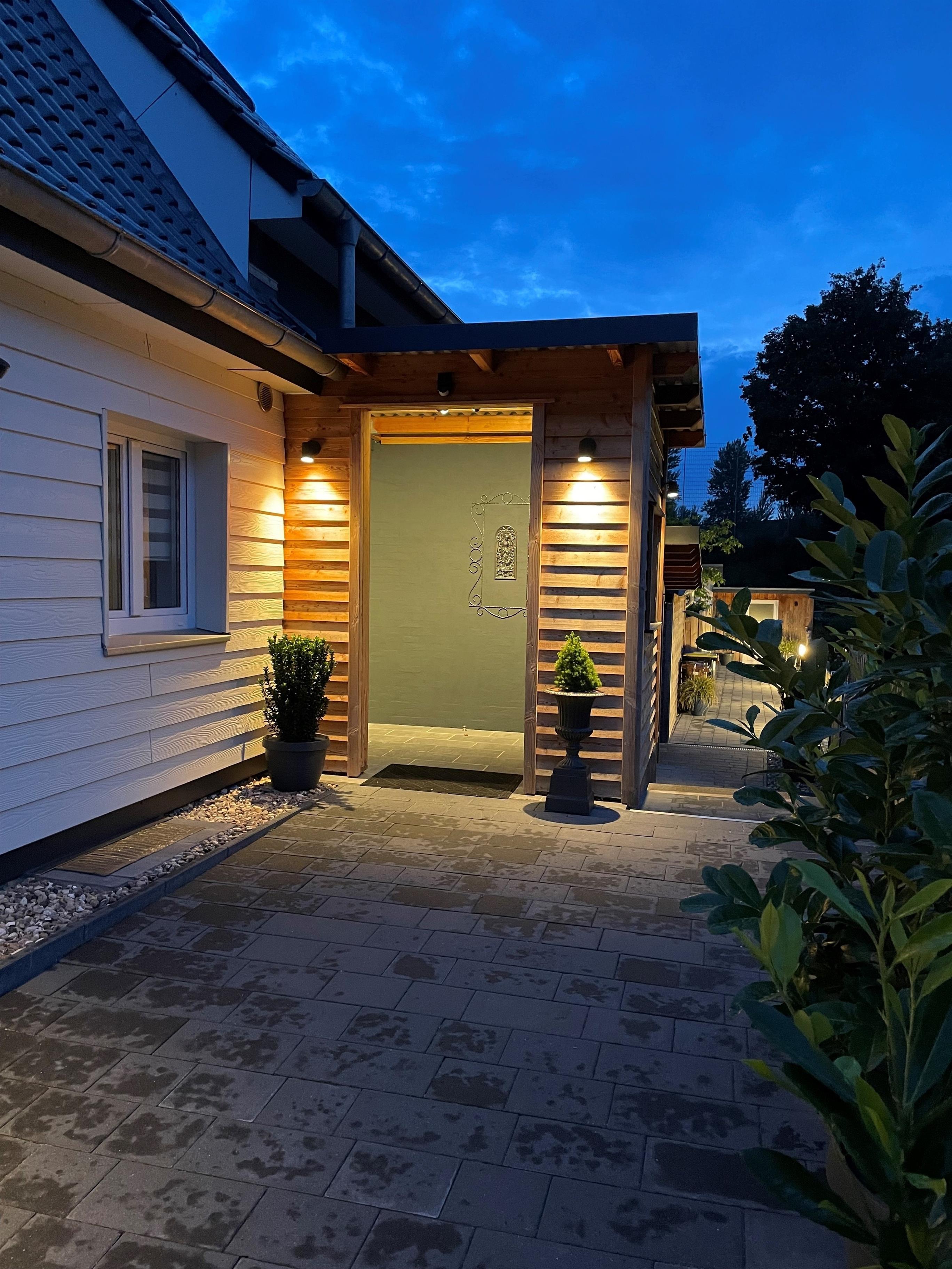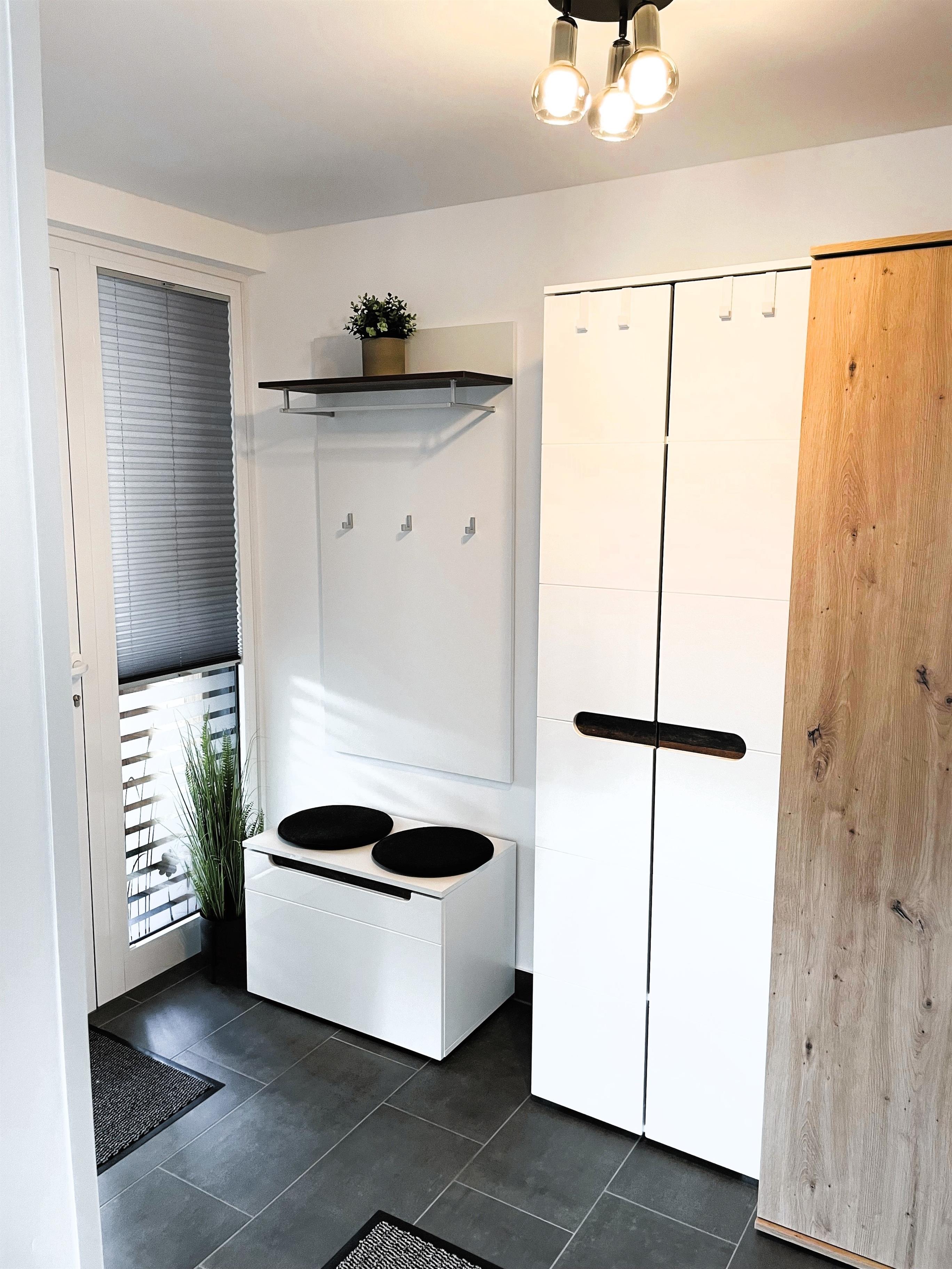 Eine geschützte , kleine Terrasse und eine neue , moderne Wohnung mit einem Blick auf einen schönen Garten.