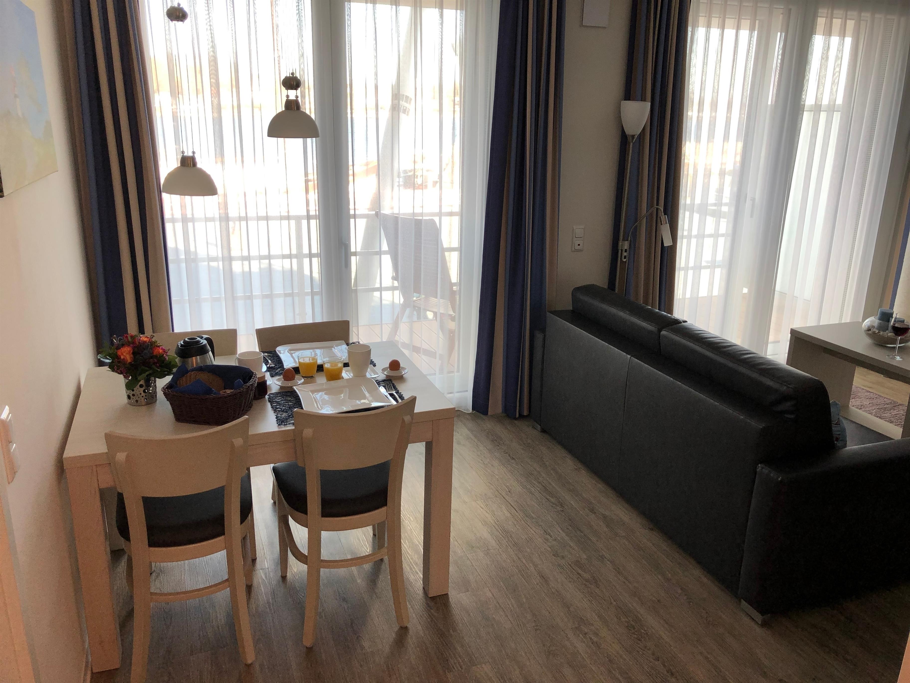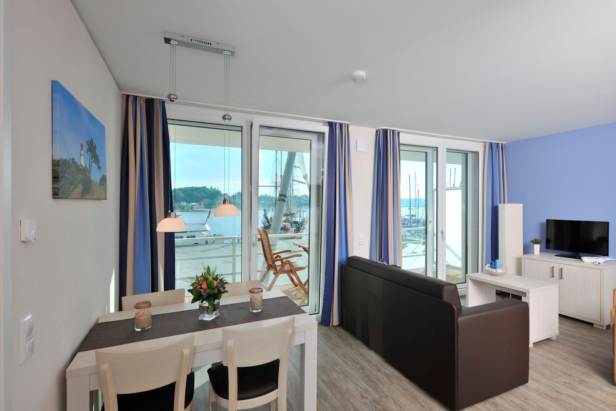 In unserer liebevoll maritim eingerichteten Nichtraucher-Ferienwohnung "Nordlicht" im 1. Obergeschoss können Sie die Seele baumeln lassen und den stressigen Alltag vergessen. Hier werden Sie sich von Anfang an wohlfühlen: Die ca. 46m² große Ferienwohnung verfügt über ein Wohn- und Esszimmer mit Einbauküche, ein Schlafzimmer mit komfortablem Boxsping-Doppelbett sowie Flur, Duschbad und Balkon. Sie wurde vom DTV mit vier Sternen zertifiziert und bietet Platz für zwei Erwachsene und einen kleinen Gast. Die vollwertige Marken-Einbauküche ist erstklassig ausgestattet: Kühlschrank mit Eisfach, Mikrowelle, Geschirrspüler, Ceran-Kochfeld, Backofen, Wasserkocher und Kaffeemaschine sind selbstverständlich vorhanden und lassen keine Wünsche offen, damit Sie sich bei uns wie zu Hause fühlen. Durch die beiden großen, bodentiefen Fenster können Sie von der gemütlichen Wohnzimmercouch aus direkt auf den Hafen schauen. In der kühleren Jahreszeit sorgt die Fußbodenheizung in der gesamten Wohnung für angenehme Wärme. In der Ferienwohnung sind zwei Flachbild-Fernseher mit Kabelanschluss, Blue Ray-Player und Stereo-Anlage vorhanden. Ebenso kann der WLAN-Anschluss kostenlos genutzt werden. Auf dem Balkon stehen für Sie bequeme Terrassenmöbel zur Verfügung. Hier können Sie in der Sonne frühstücken - ein Café mit Brötchenservice befindet sich im Erdgeschoss - oder einfach nur den unverbauten Blick auf die Eckernförder Bucht und den Yachthafen genießen. Zur Ferienwohnung gehört auch ein für Sie reservierter Pkw-Stellplatz im Parkhaus im Nachbargebäude, welcher im Mietpreis enthalten ist. Auch ein Abstellraum für Fahrräder ist vorhanden. Zwei Waschmaschinen und zwei Trockner befinden sich im Erdgeschoss. Selbstverständlich ist auch ein Fahrstuhl vorhanden. Für die kleinen Gäste stehen Kinderhochstuhl und Babybett bereit, die bei Bedarf optional gebucht werden können.