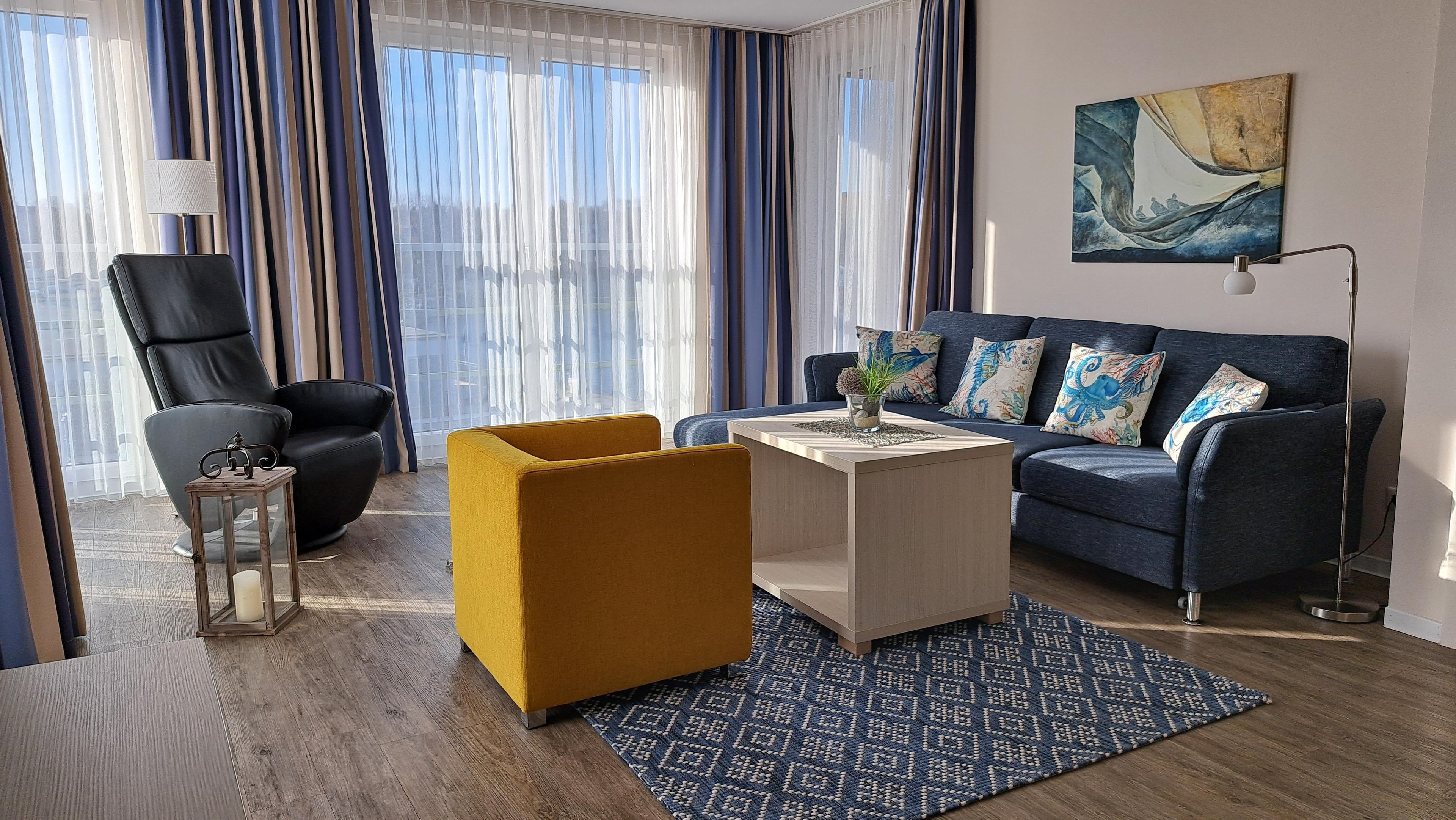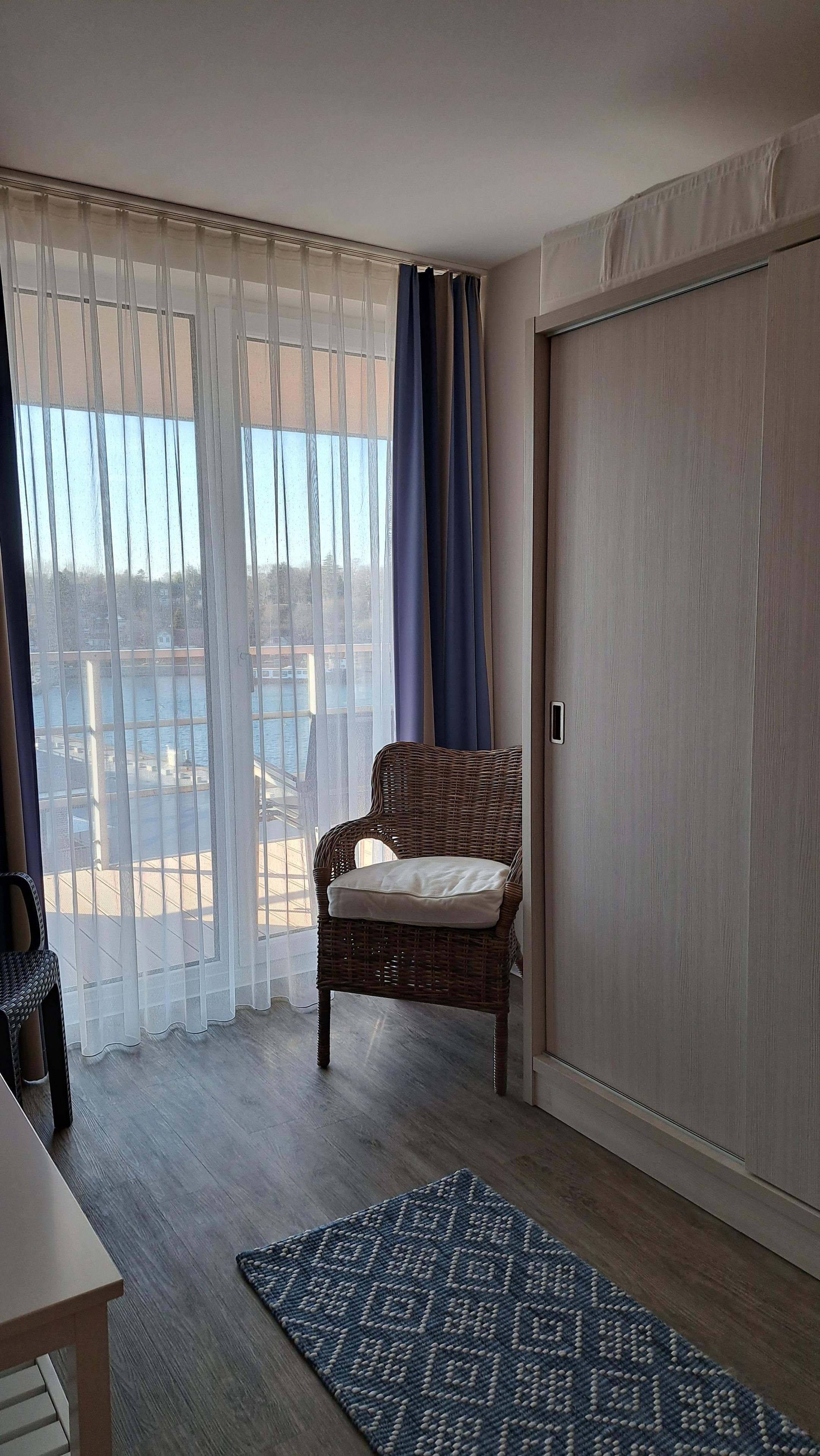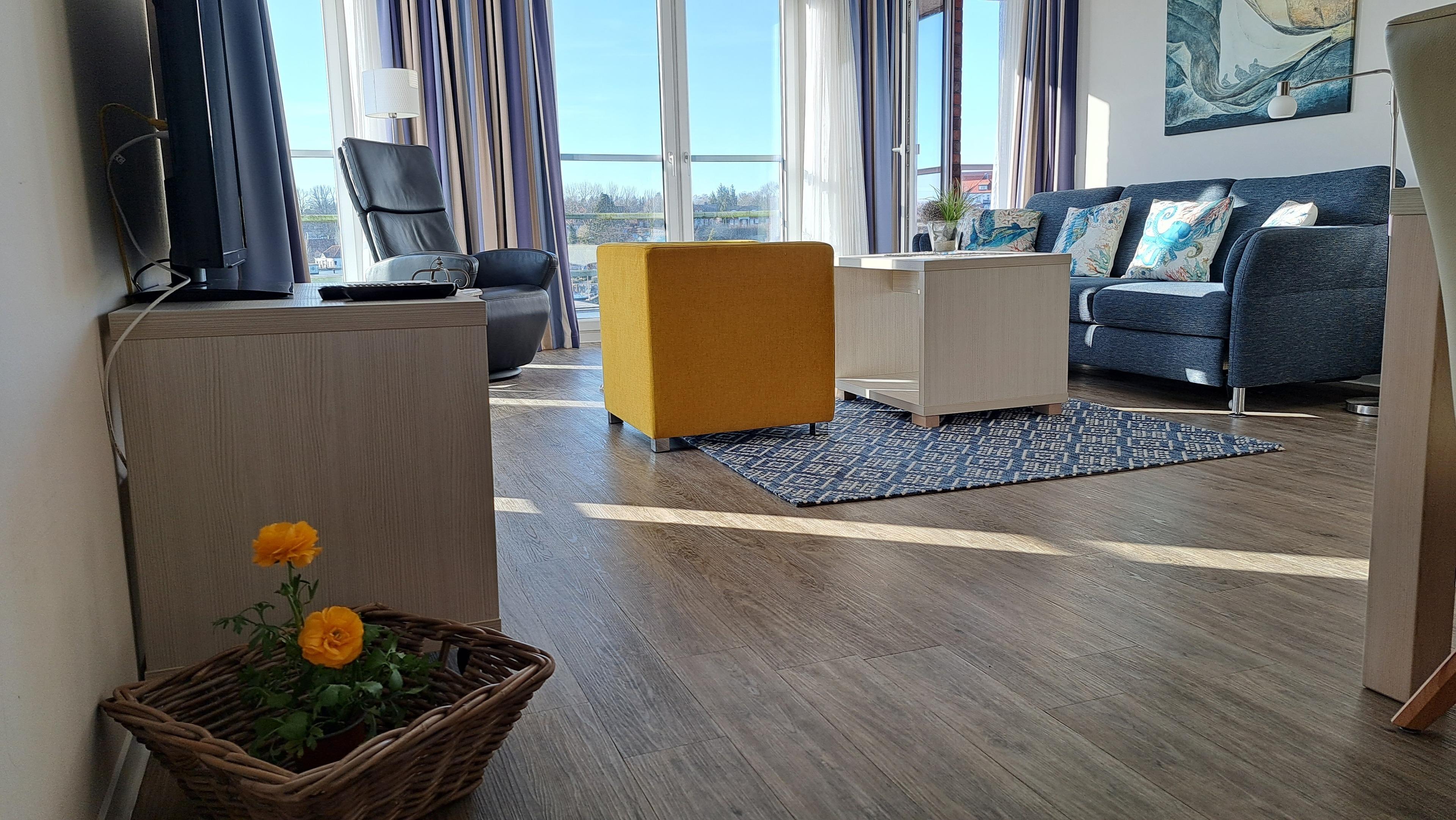 großen Fenster bietet es über die Dächer des Hafenspitze Quartiers einen wunderschönen Blick auf das maritime Treiben im