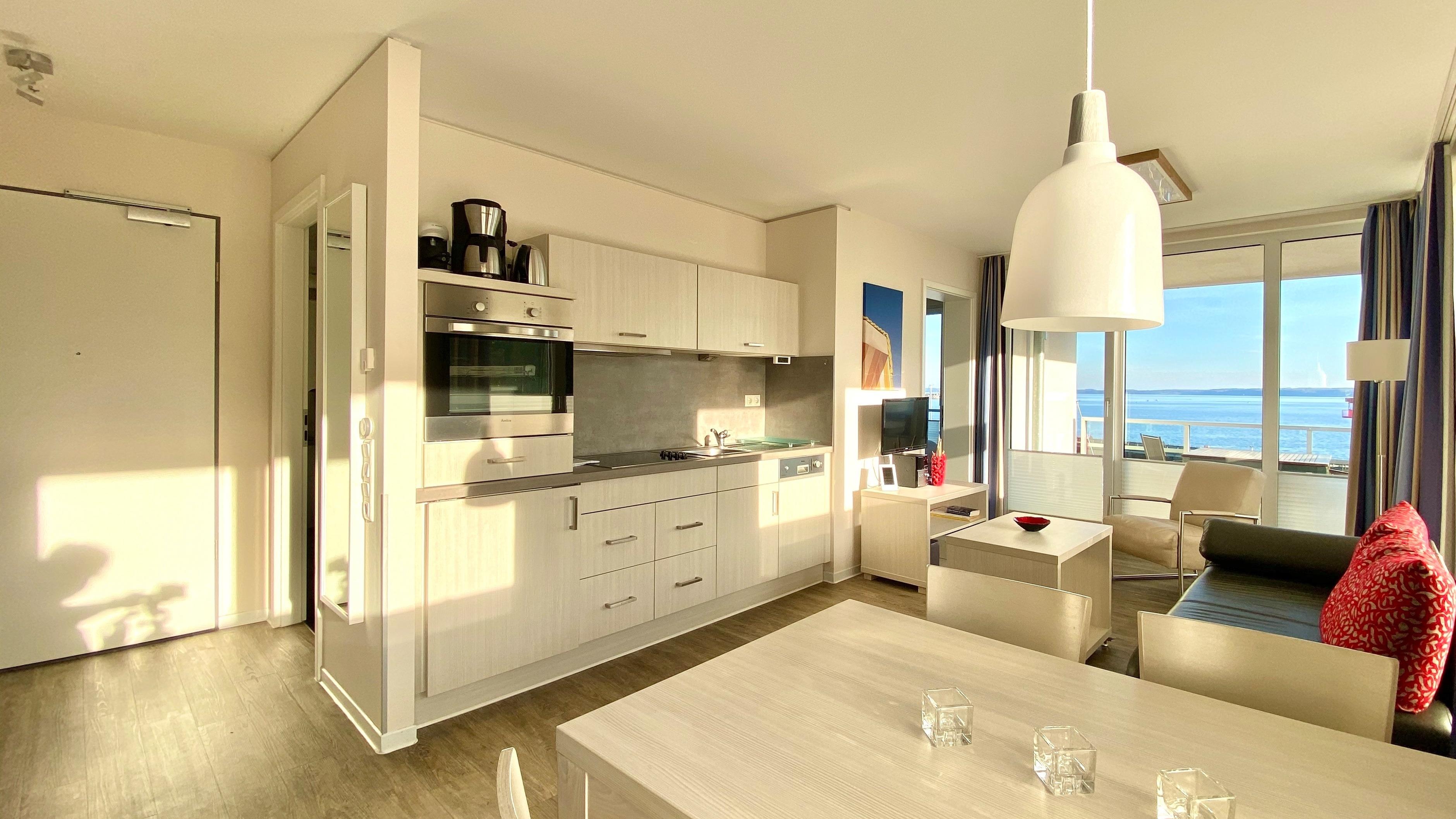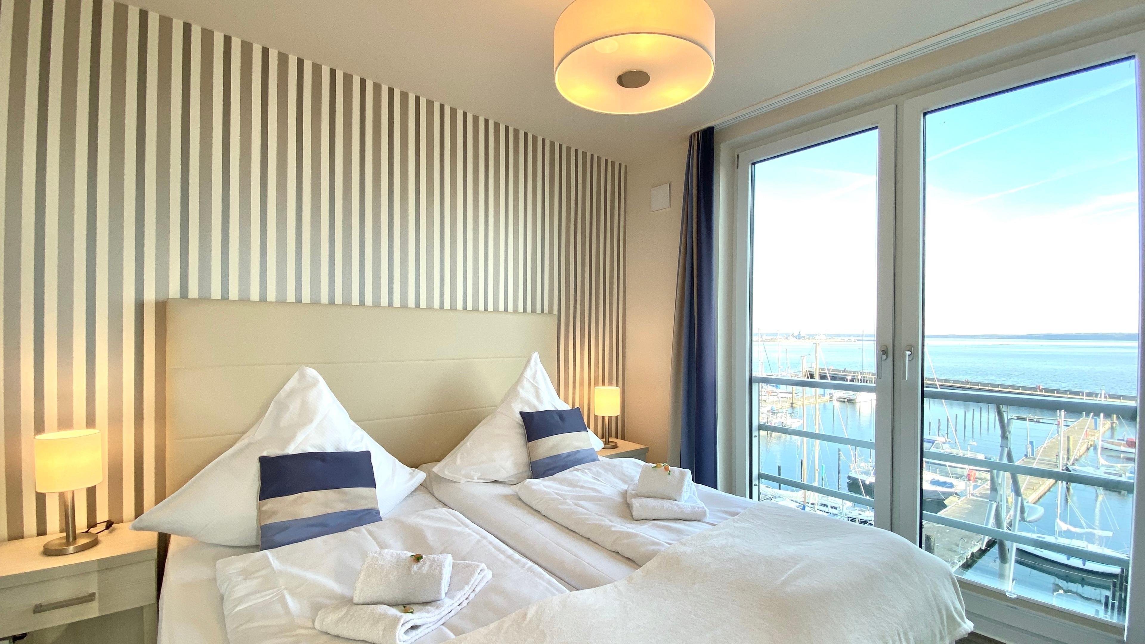 Beobachten Sie das Treiben auf dem unmittelbar vor Ihnen liegenden Jachthafen oder lassen Sie ihren Blick einfach über die Bucht schweifen. Von dem Balkon aus haben Sie einen tollen Blick über den Strand, die Bucht und die Promenade. Durch die großzügige, bodentiefe Verglasung können Sie die wunderschöne Umgebung natürlich auch aus dem Wohnraum heraus betrachten. Selbst aus dem Bett Ihres separaten Schlafzimmers schauen Sie direkt durch die bodentiefen Fenster auf die Eckernförder Bucht und den Segelhafen.