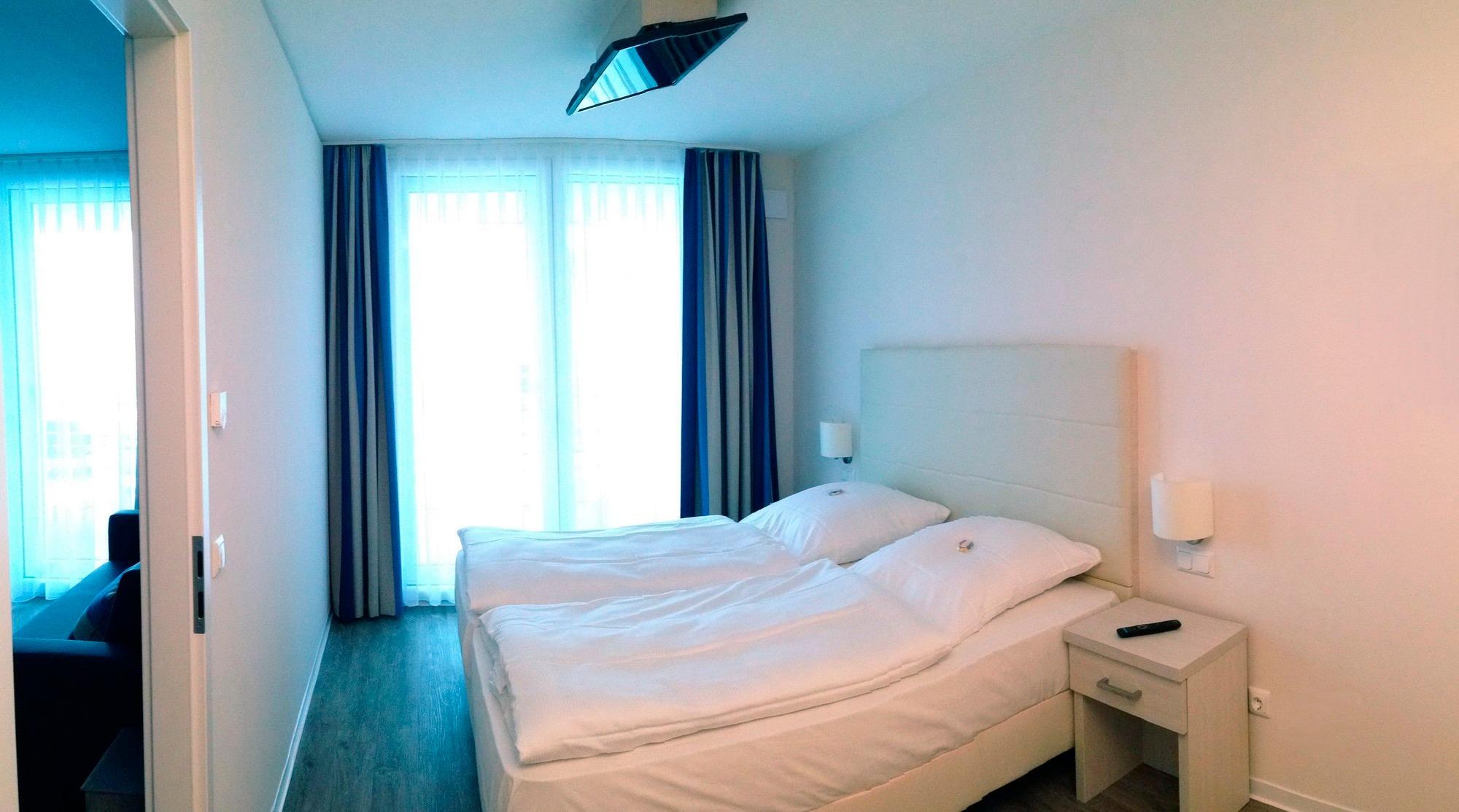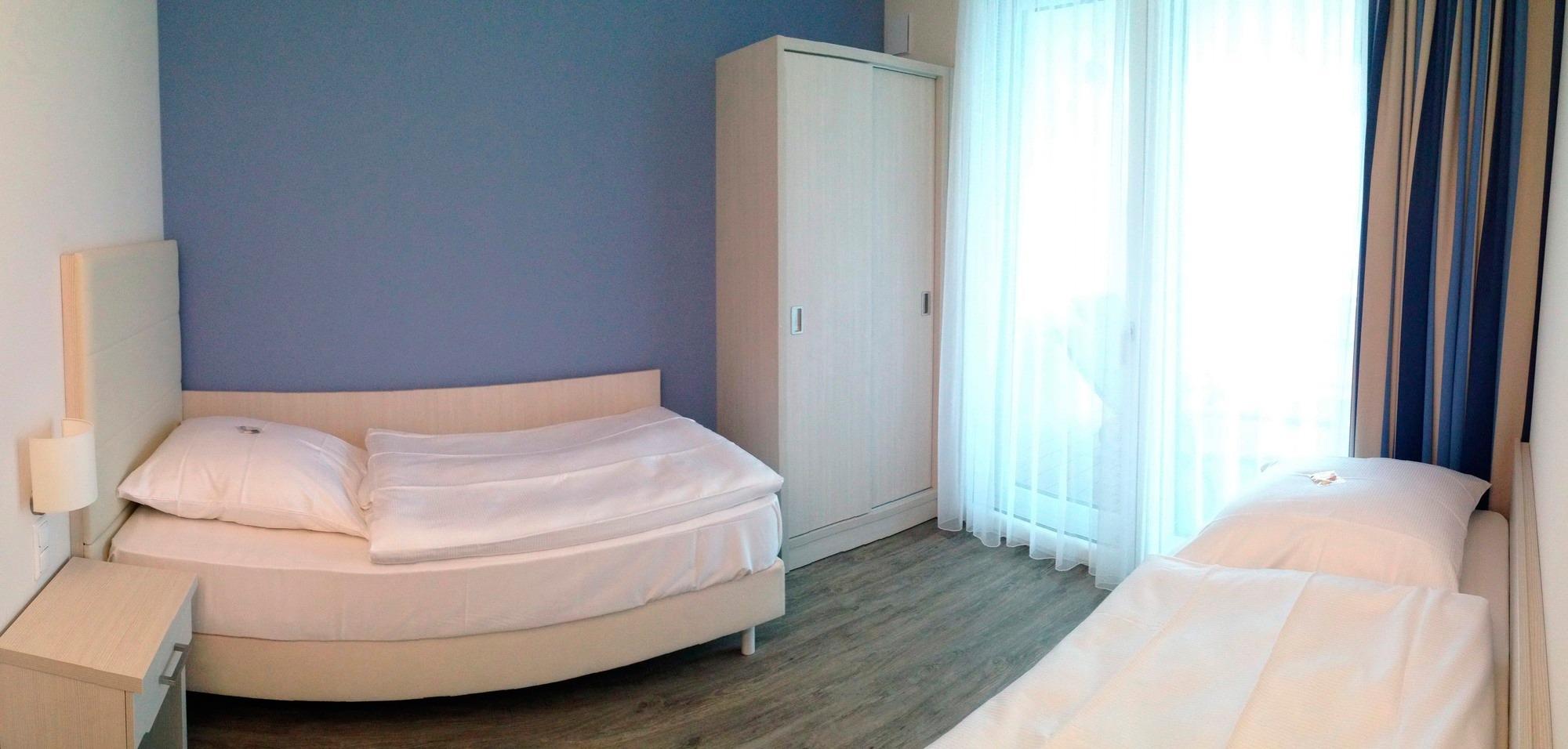 Es verfügt über 2 separate, durch Türen abgetrennte Schlafzimmer mit je 2 Betten (in einem Zimmer als Doppelbett, im anderen als Einzelbetten).