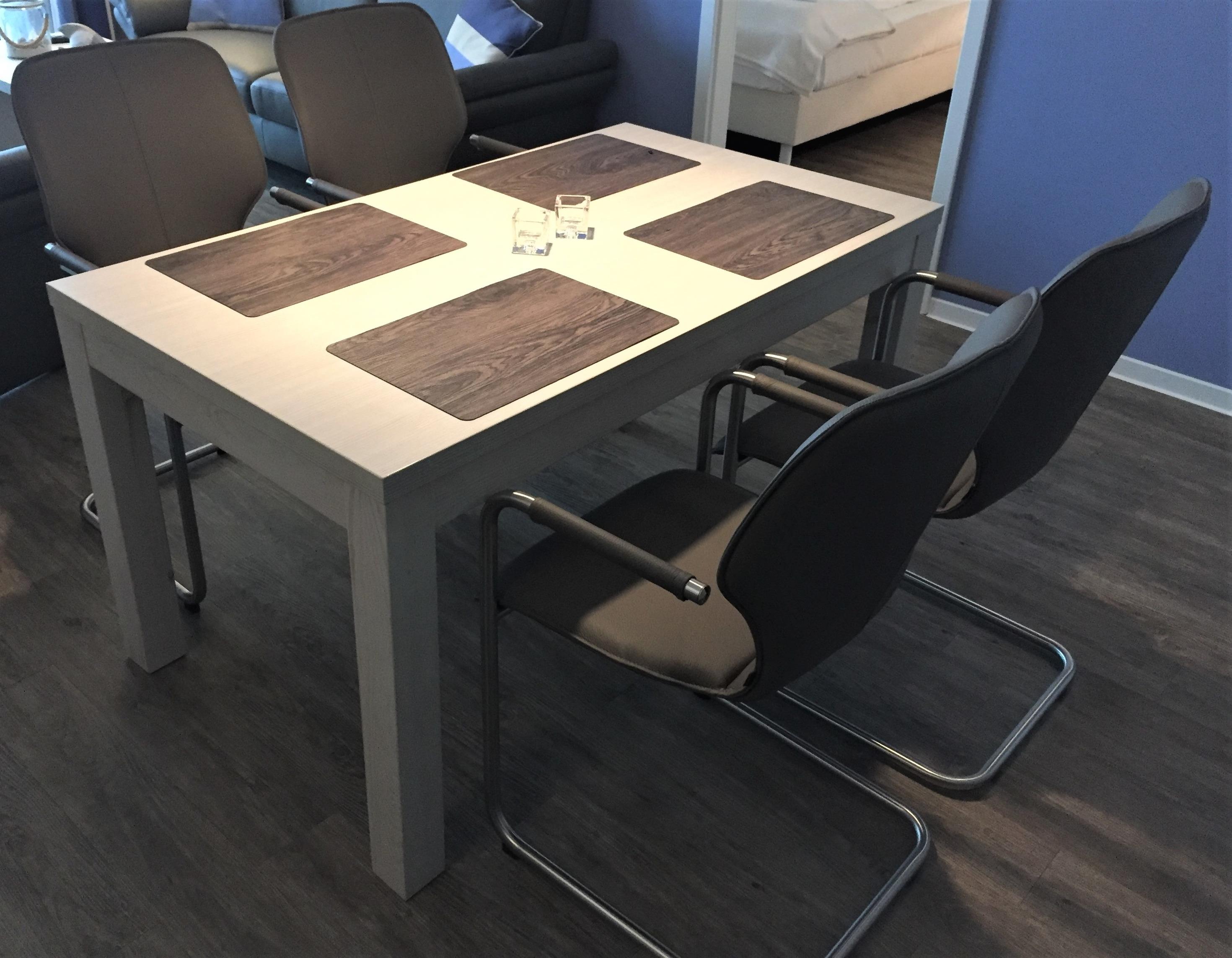 Wohnraum: Komplett ausgestattete Küchenzeile mit Cerankochfeld, Dunstabzugshaube, Umluftbackofen, Kühlschrank und Geschirrspüler, Essgruppe mit großem Tisch und 4 Stühlen, Sitzgruppe mit Sofa, 2 Sesseln und Couchtisch, großer LCD-Flachbild TV mit USB-Anschluss und Blu-ray-Player (auch für DVDs und CDs)