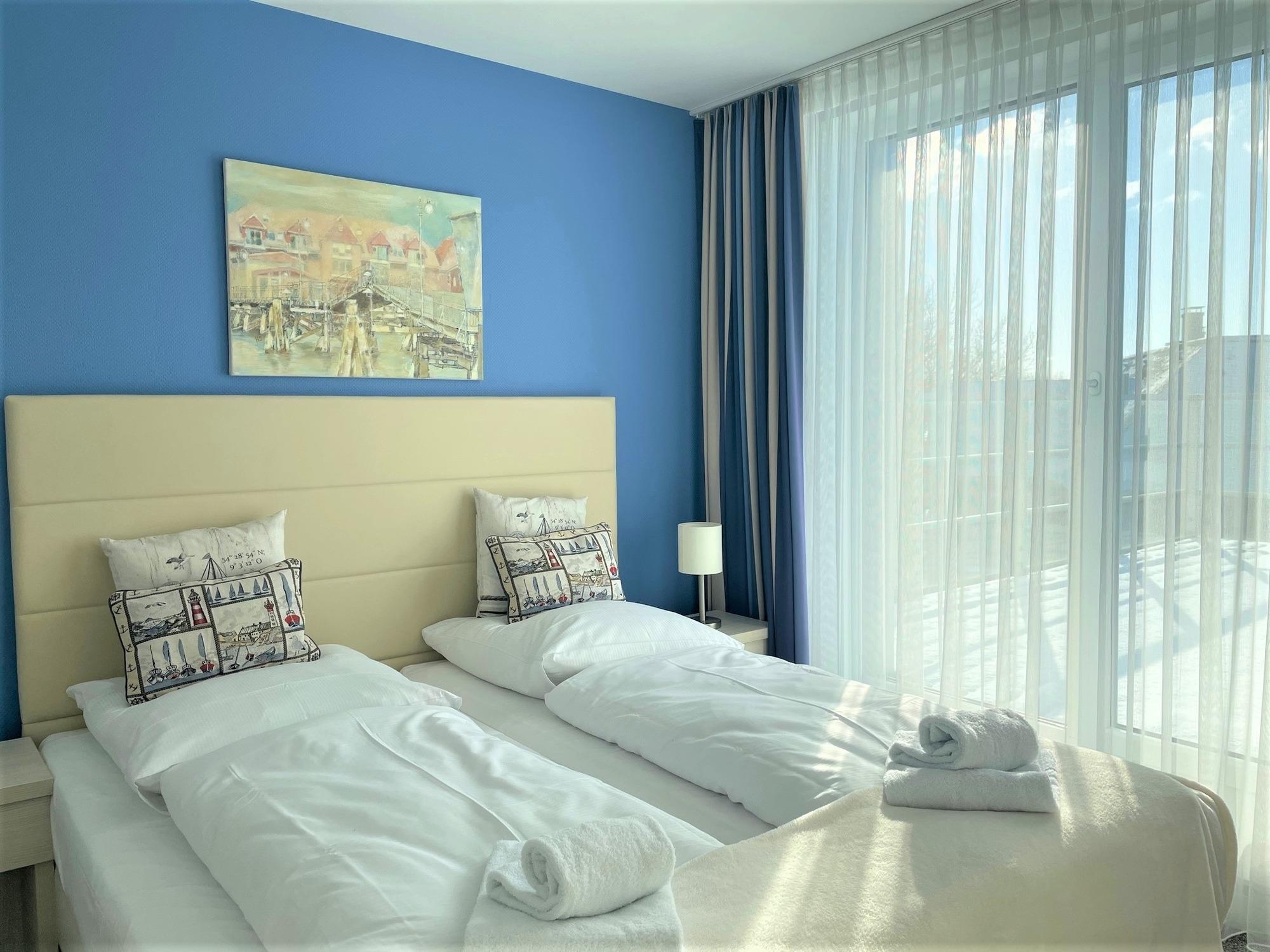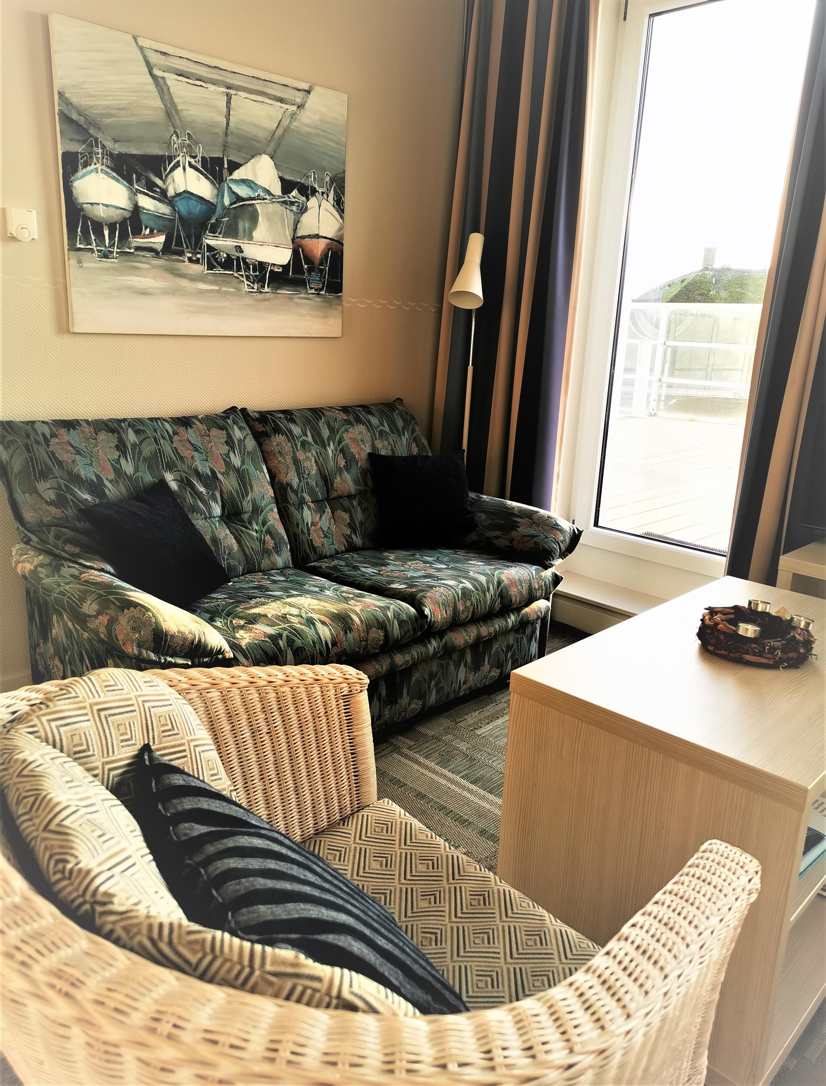 - alle Zimmer mit Raum hohen Fenstern und direktem Zugang zu der mit 2 Strandkörben, Sonnenliege, mobilen Sonnenschirmen und verschiedenen Sitzgelegenheiten ausgestatteten Südwest-Dachterrasse mit See- und Hafenblick (kein Seeblick aus dem Apartment)