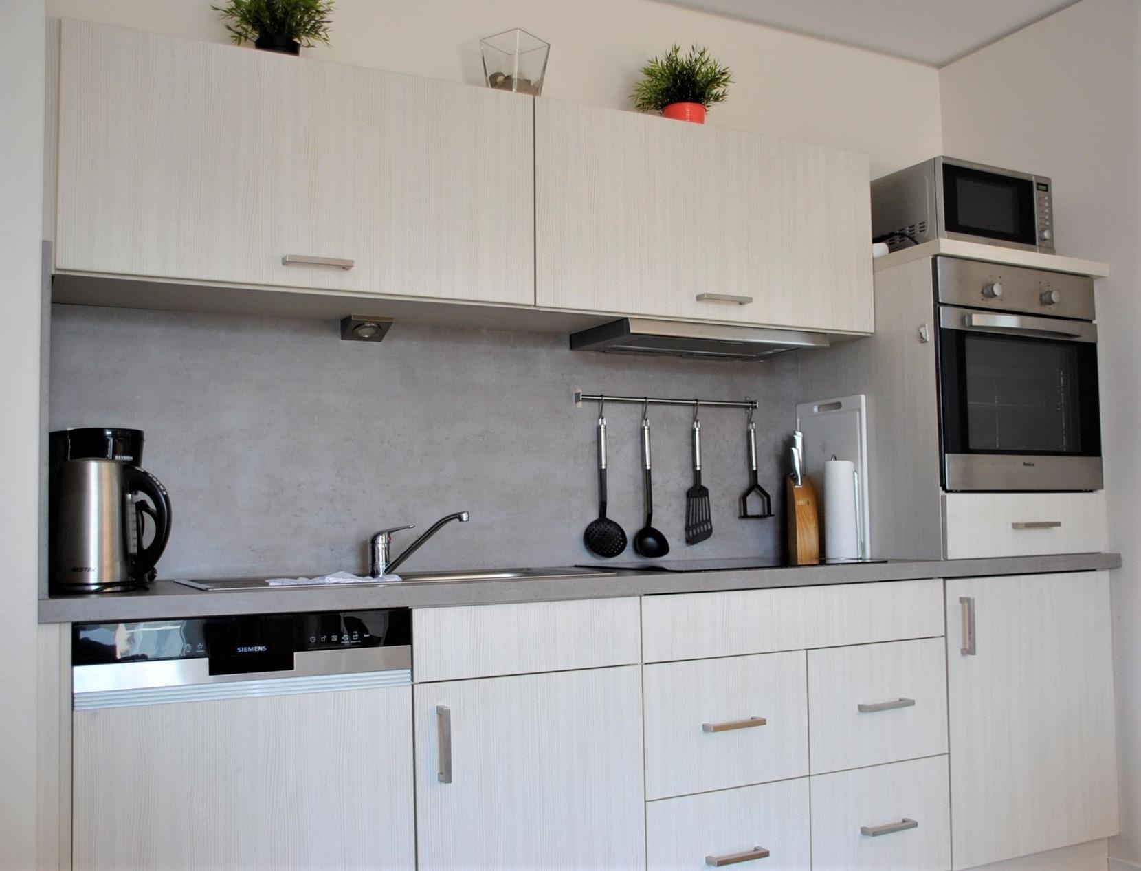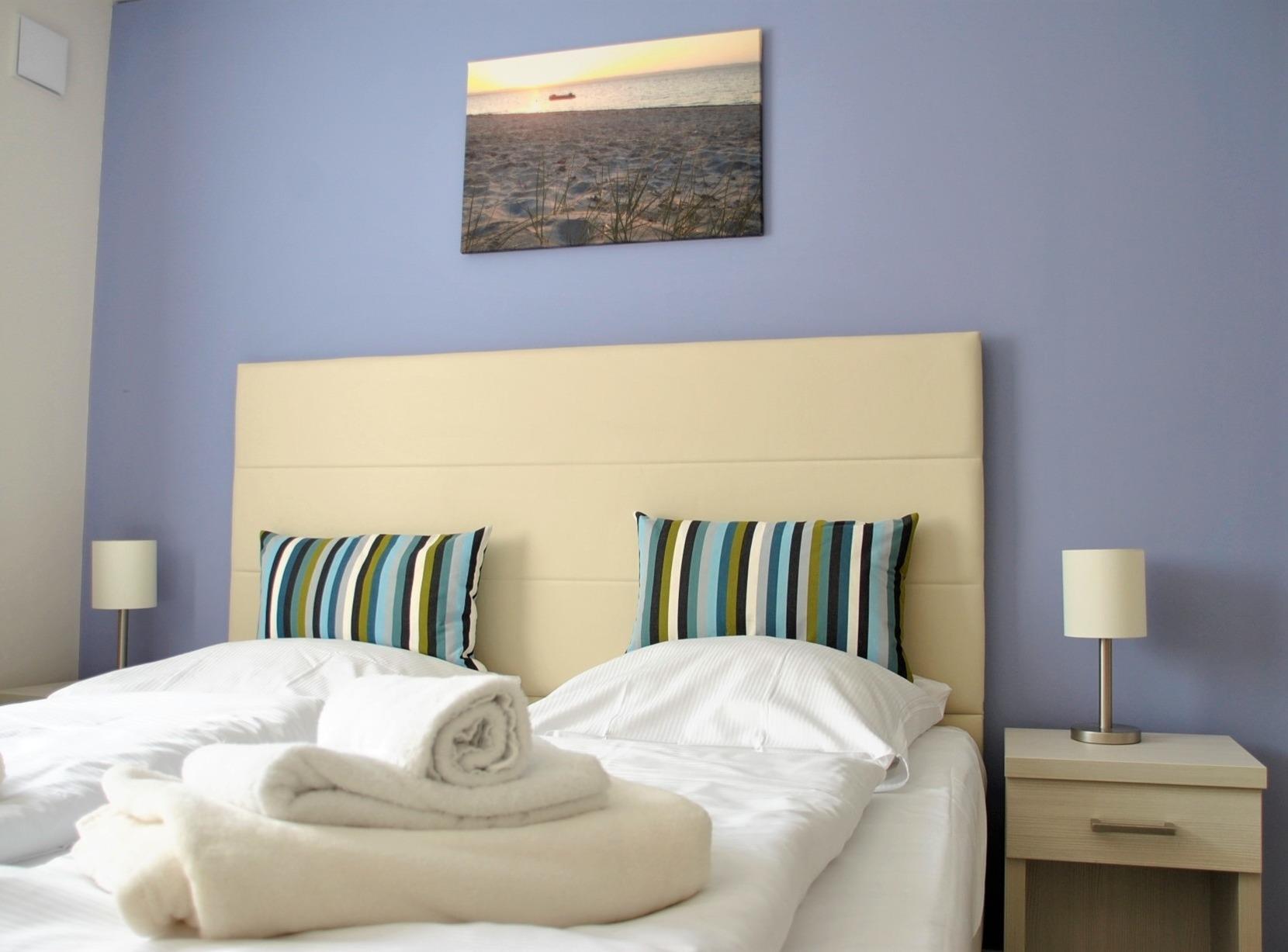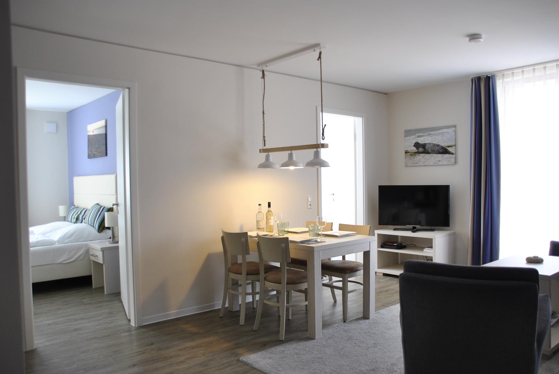 Unser modern ausgestattetes Apartment für 4 Personen verfügt über ein großzügiges Wohnzimmer mit Essbereich und moderner Einbauküche sowie ein Wannenbad mit zusätzlicher Dusche. Die Nachtruhe genießen Sie in zwei komfortablen Schlafzimmern, eines mit Doppelbett (180 x 200 cm), das andere mit zwei Einzelbetten (90 x 200 cm), die auch als Doppelbett zusammenstellbar sind.