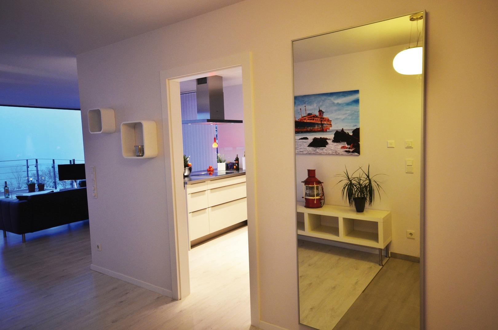 Unsere Unterkunft bietet Ihnen auf über 100 Quadratmetern großzügiges Wohnen in einer design- orientierten, hellen Umgebung, ausgestattet mit hochwertigem Interieur in einem einzigartigen Bauwerk auf Fünf Sterne Niveau.