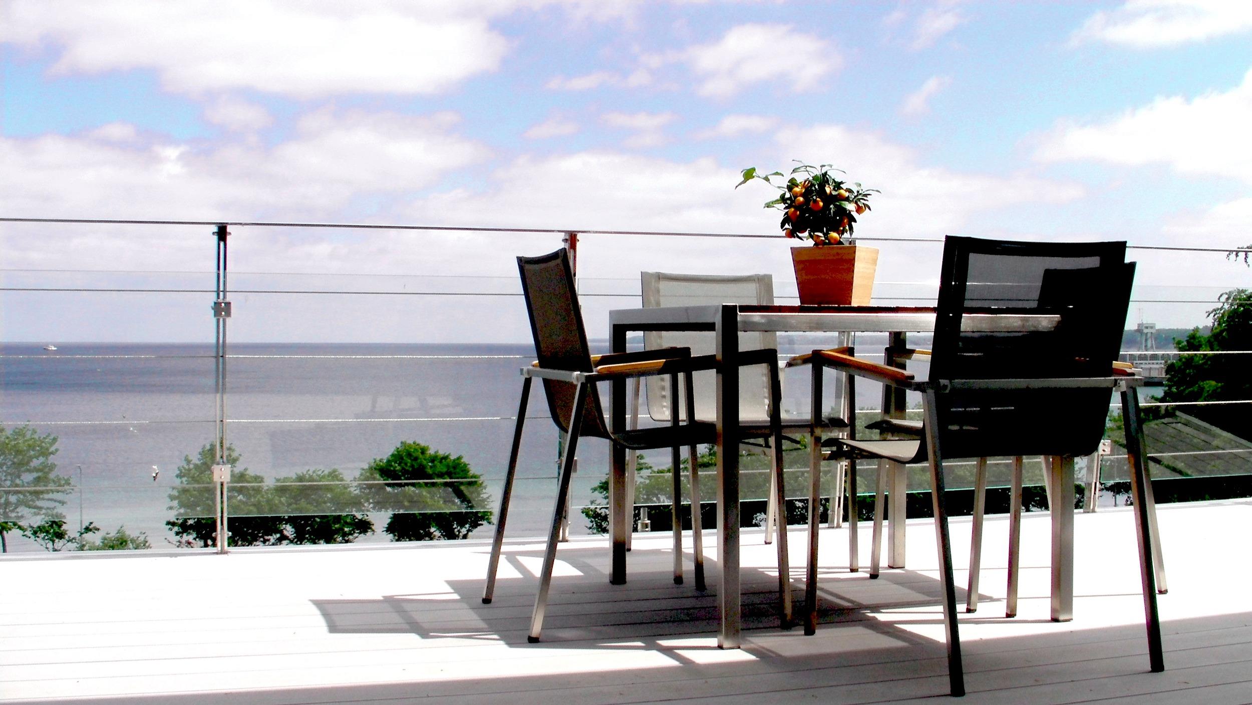 An den Wohnraum schließt sich auf gleicher Höhe eine großzügige Terrasse an, welche auf Grund der deckenhohen Fenster den Wohnraum optisch nach draußen erweitert. Dieser Effekt wird durch die großzügige Seitenverglasung noch verstärkt. Öffnen Sie einfach eine der Panoramascheiben und genießen die frische Meeresluft und das großartige Raumgefühl.