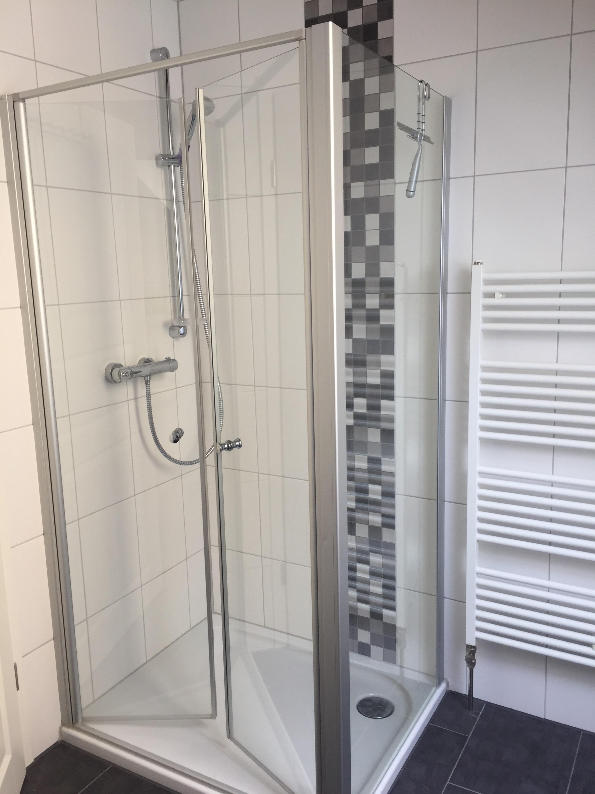 Die Wohnung hat ein Vollbad mit Dusche und Badewanne und Fußbodenheizung sowie ein Gäste-WC.