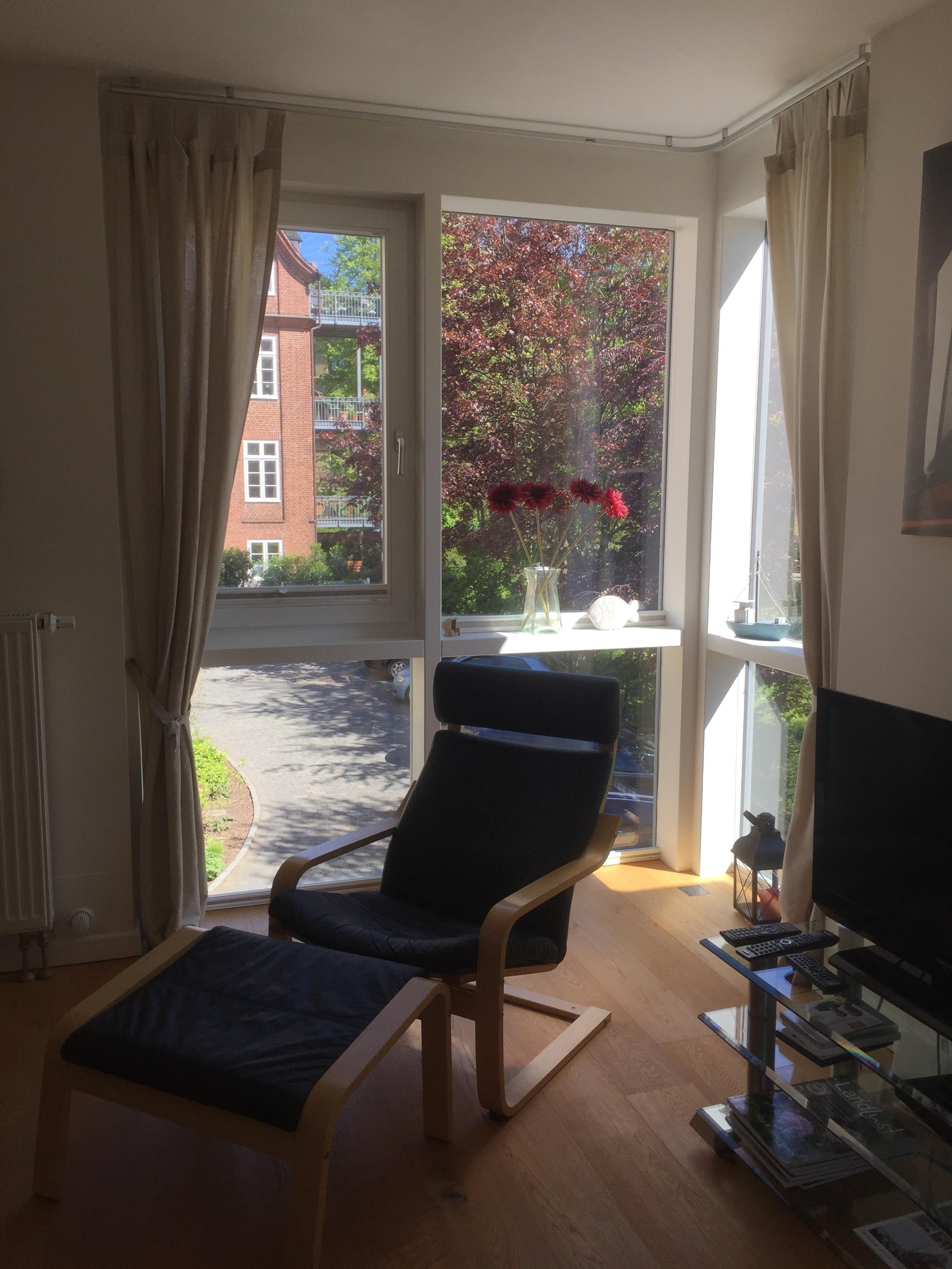 Wohnzimmer/Esszimmer: Eckcouch mit Blick in den Bürgerpark und ein IKEA-Poäng Sessel. Esstisch für 6 Personen, SAT-TV.