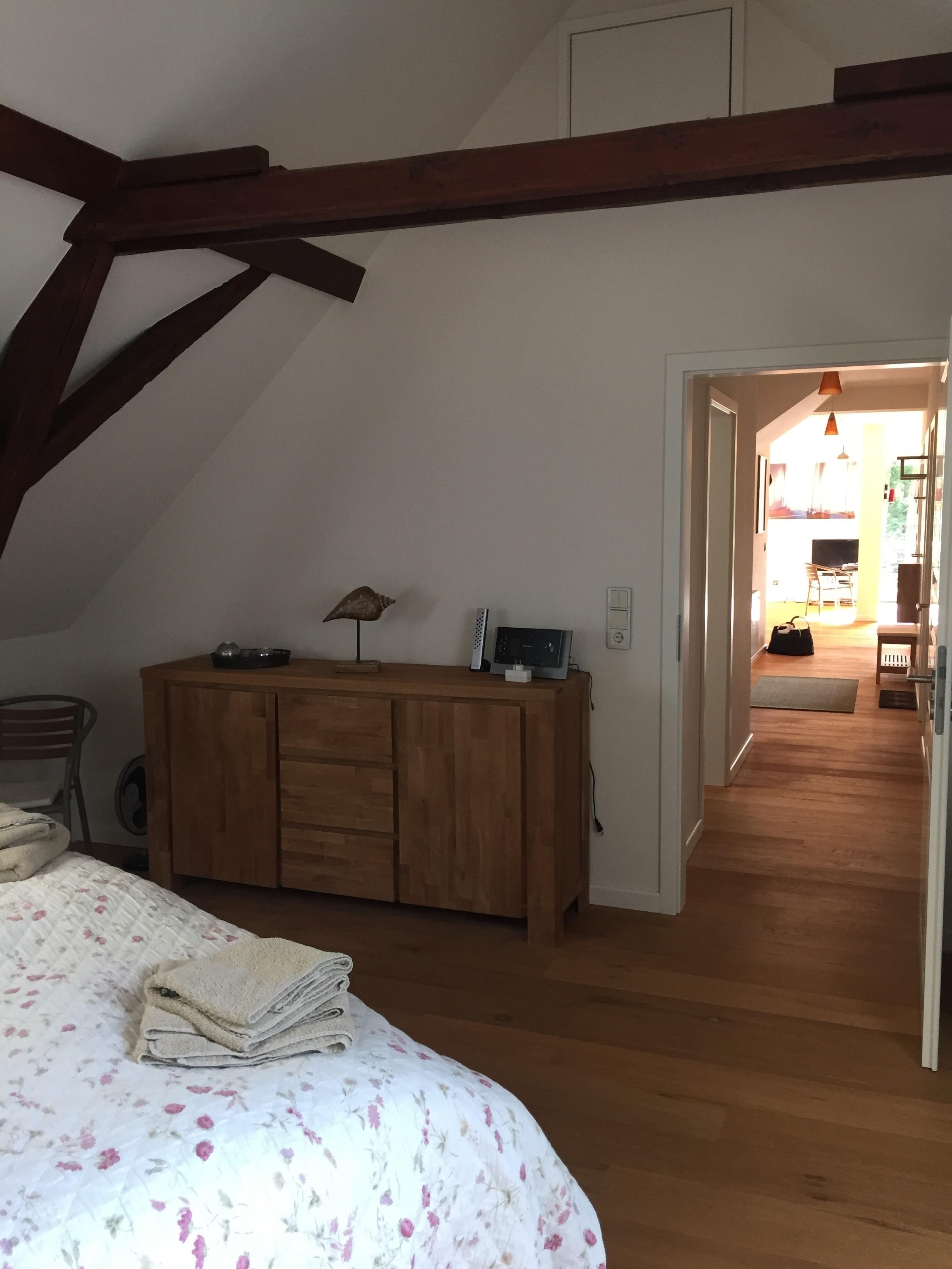 Sie besteht aus 3 Zimmern: einem sehr komfortablen, offenen Wohn-Küchen-Essbereich mit Fußbodenheizung, sowie zwei Schlafzimmern. Die Schiffsdielen in diesen 3 Räumen geben der Wohnung eine warme Gemütlichkeit. Zusätzlich verfügt die Wohnung über einen Hauswirtschaftsraum mit Waschmaschine.