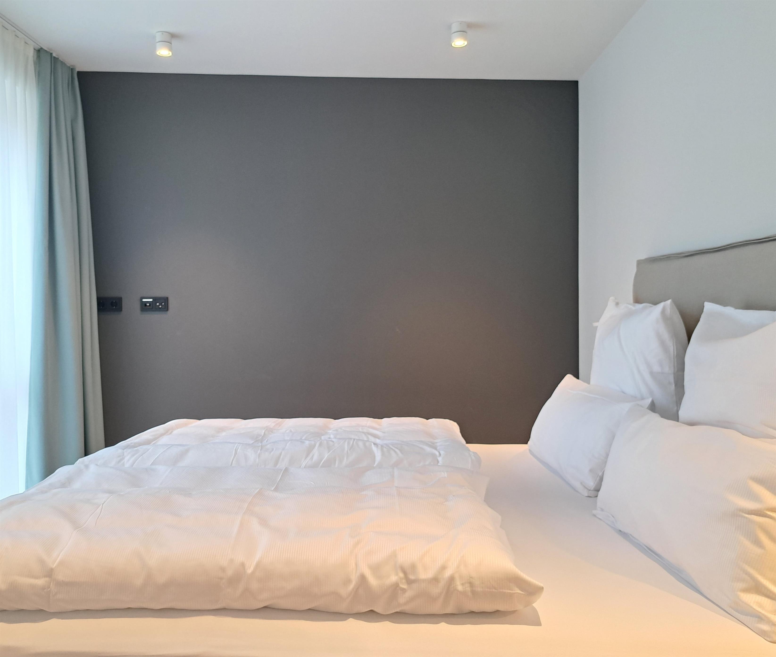 Die Schlafbereiche sind mit hochwertigen Boxspringbetten und Kleiderschrank mit Zimmersafe eingerichtet. Eines der Schlafzimmer ist zusätzlich mit einem TV ausgestattet.