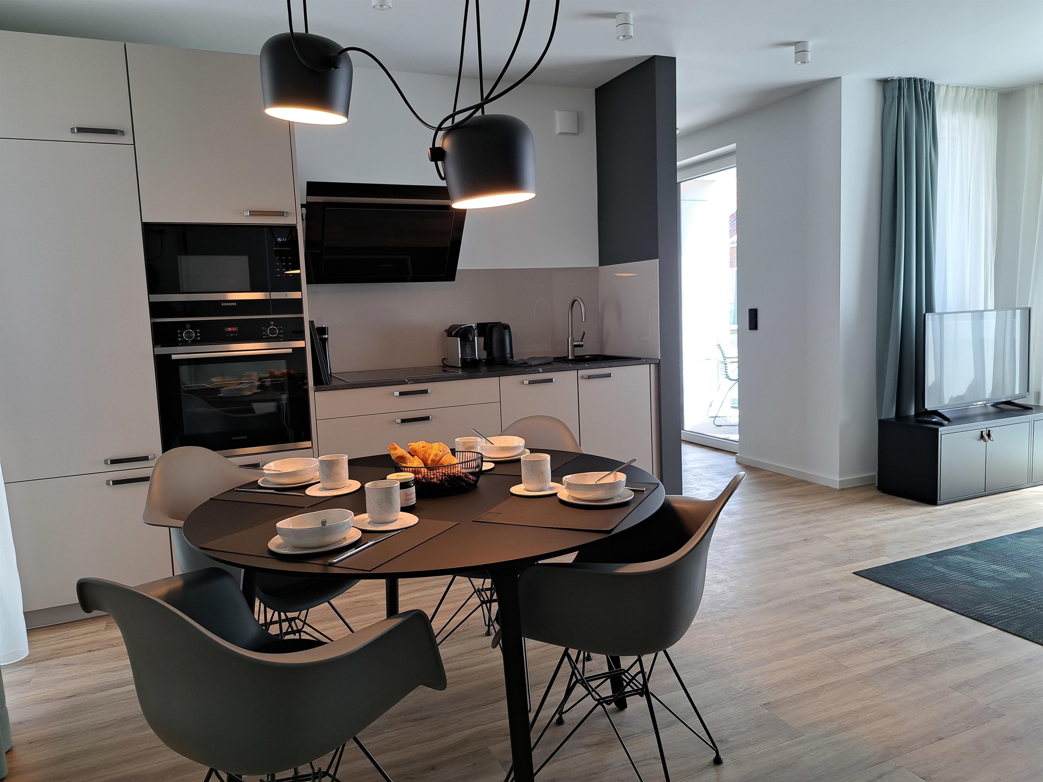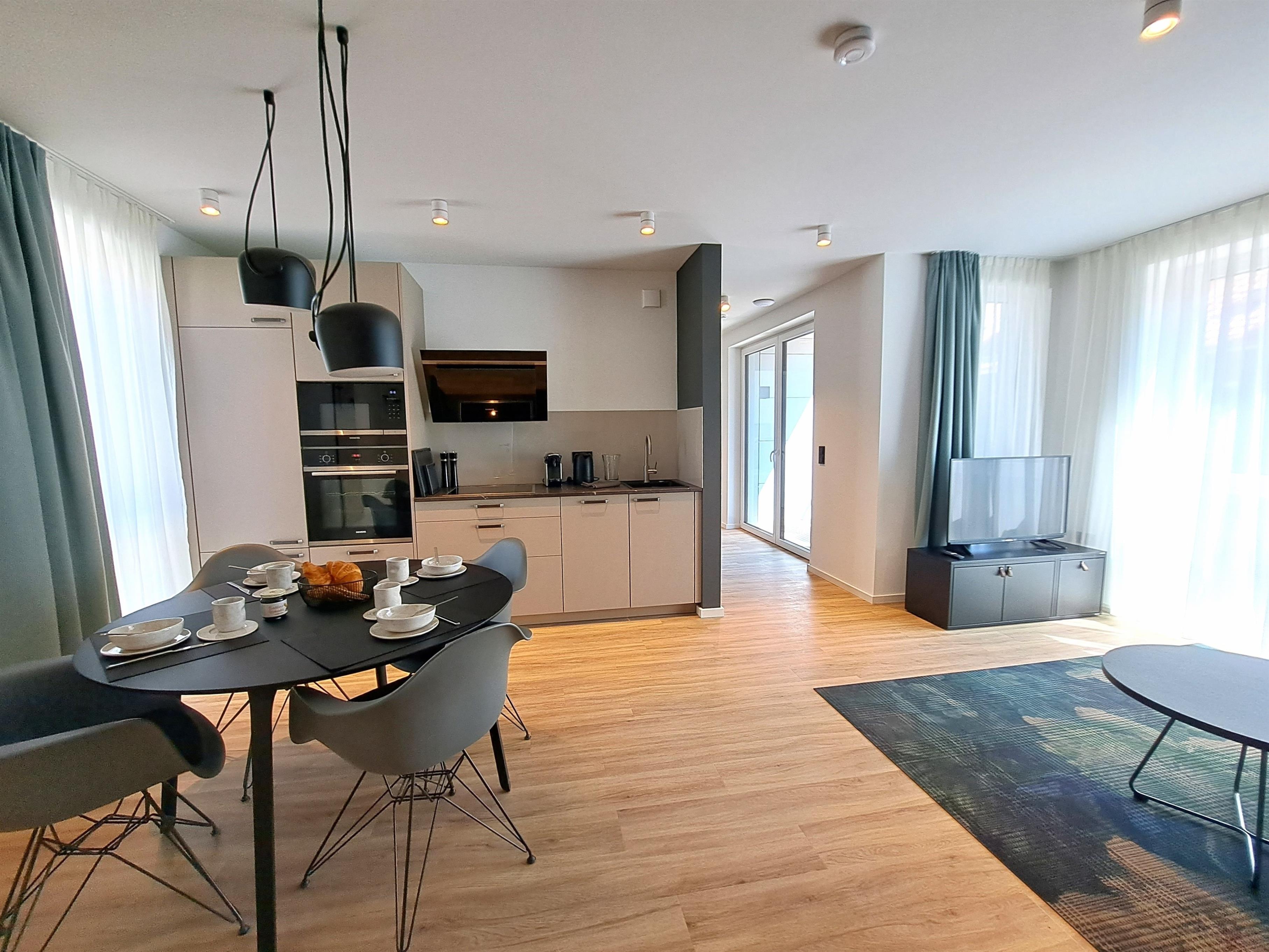 Eine voll ausgestattete, moderne Küche fügt sich offen in den kombinierten Wohn- und Essbereich ein, die Sitzecke mit dem Flachbildschirm und dem Esstisch laden zum Entspannen und Geschichten erzählen ein.