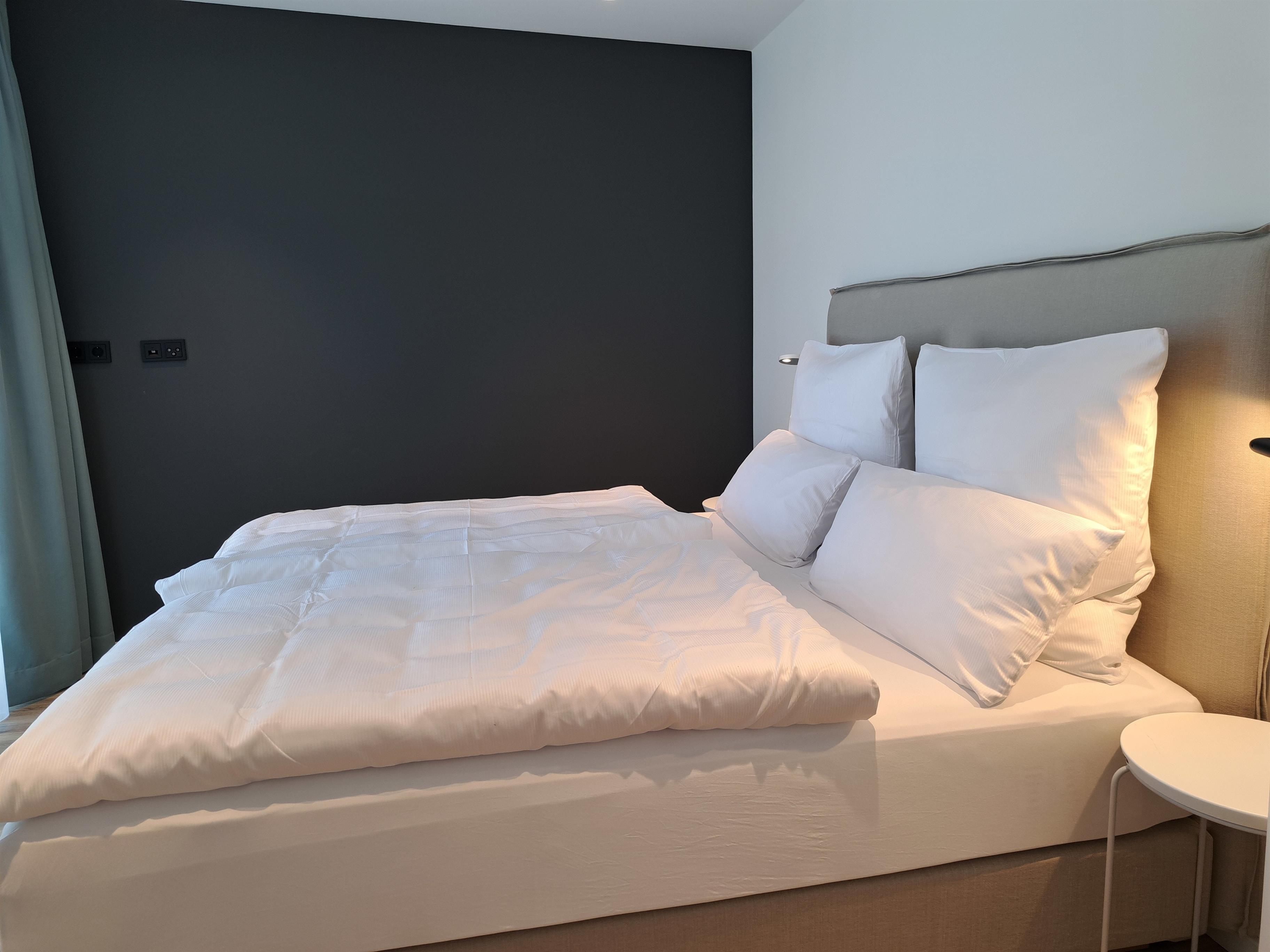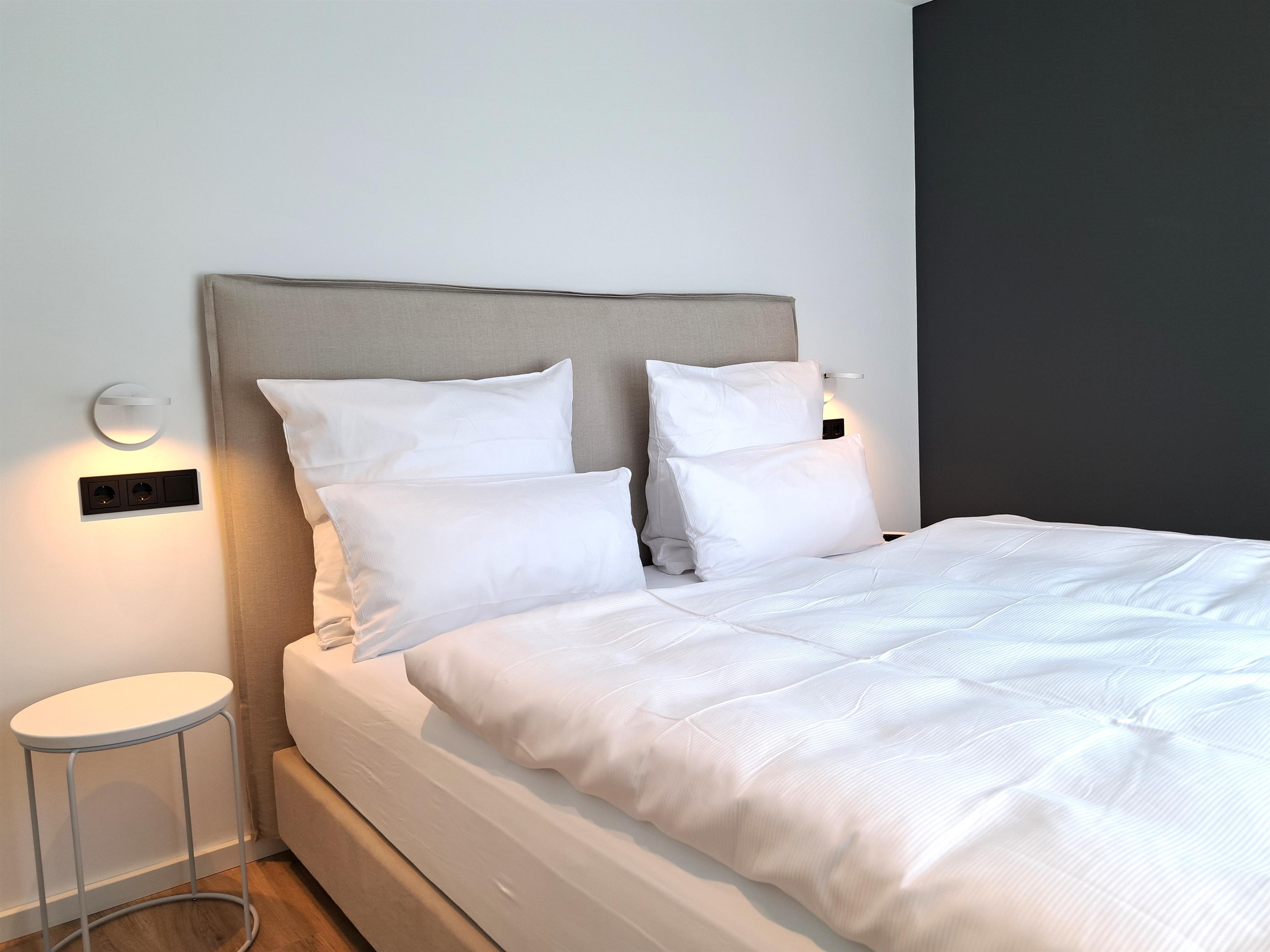 Die Schlafbereiche sind mit hochwertigen Boxspringbetten und Kleiderschrank mit Zimmersafe eingerichtet. Eines der Schlafzimmer ist zusätzlich mit einem TV ausgestattet.
