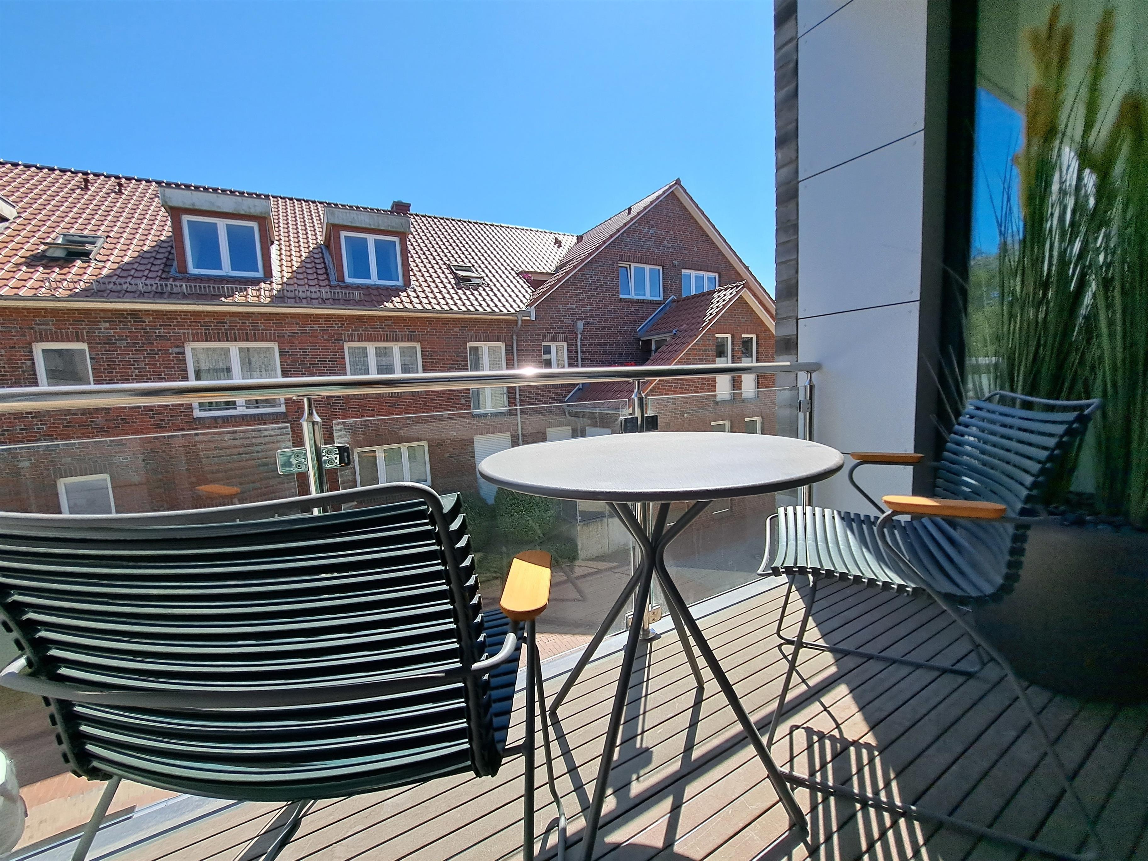 ECK AM MEER 3 verfügt über eine zum Meer und Strand hin seitliche Loggia von 4 qm mit südlicher Ausrichtung. Außenmöblierung ist selbstverständlich vorhanden.