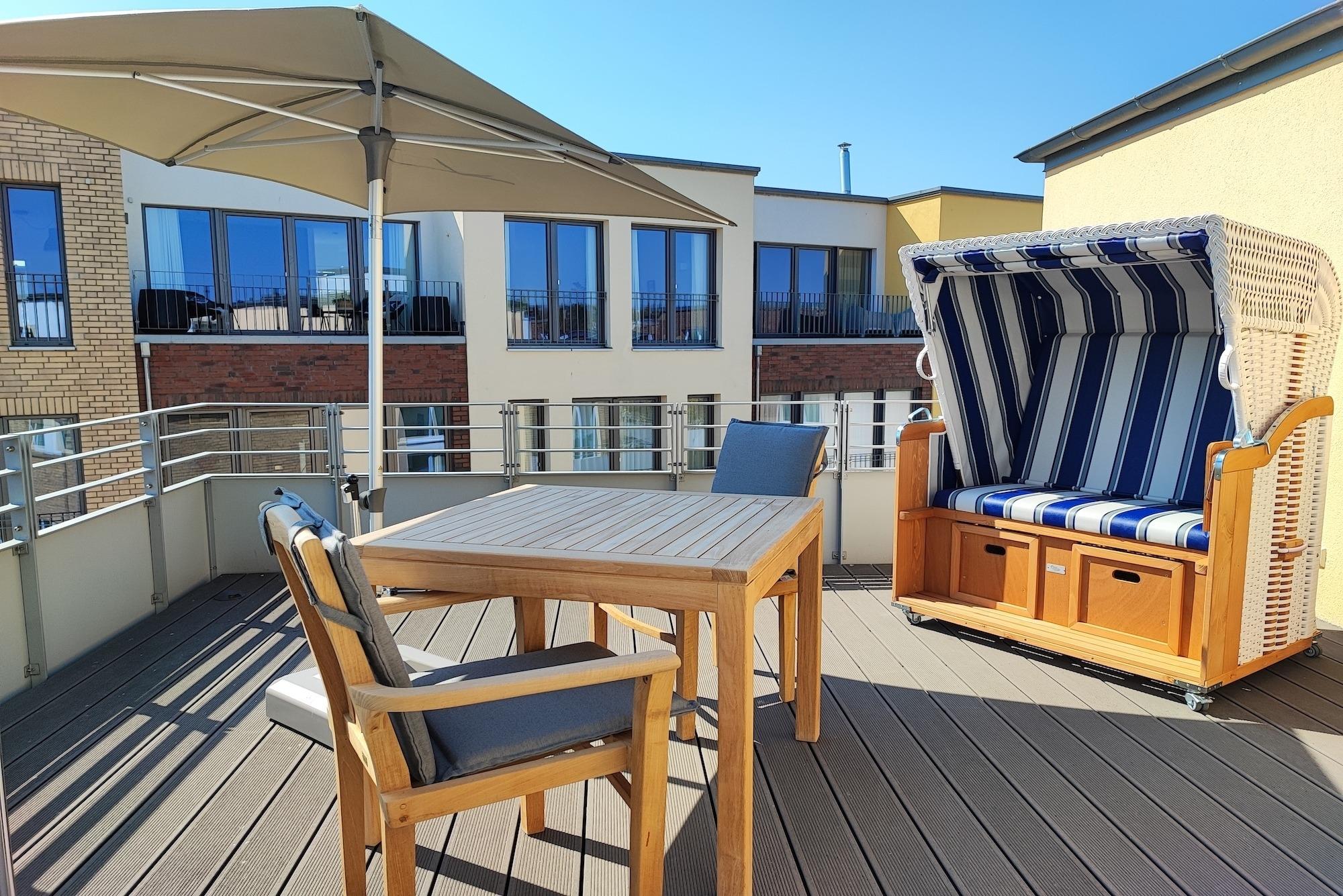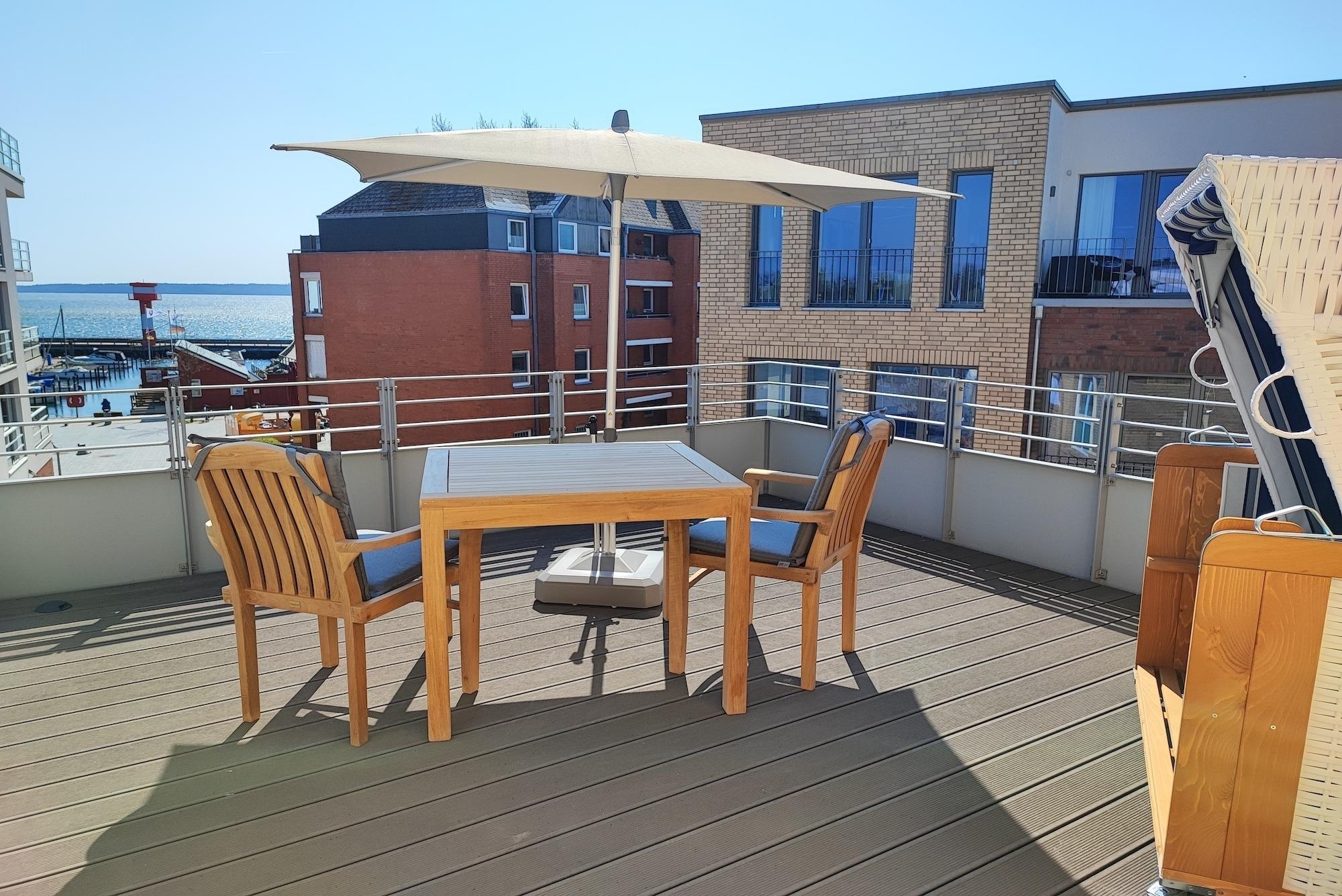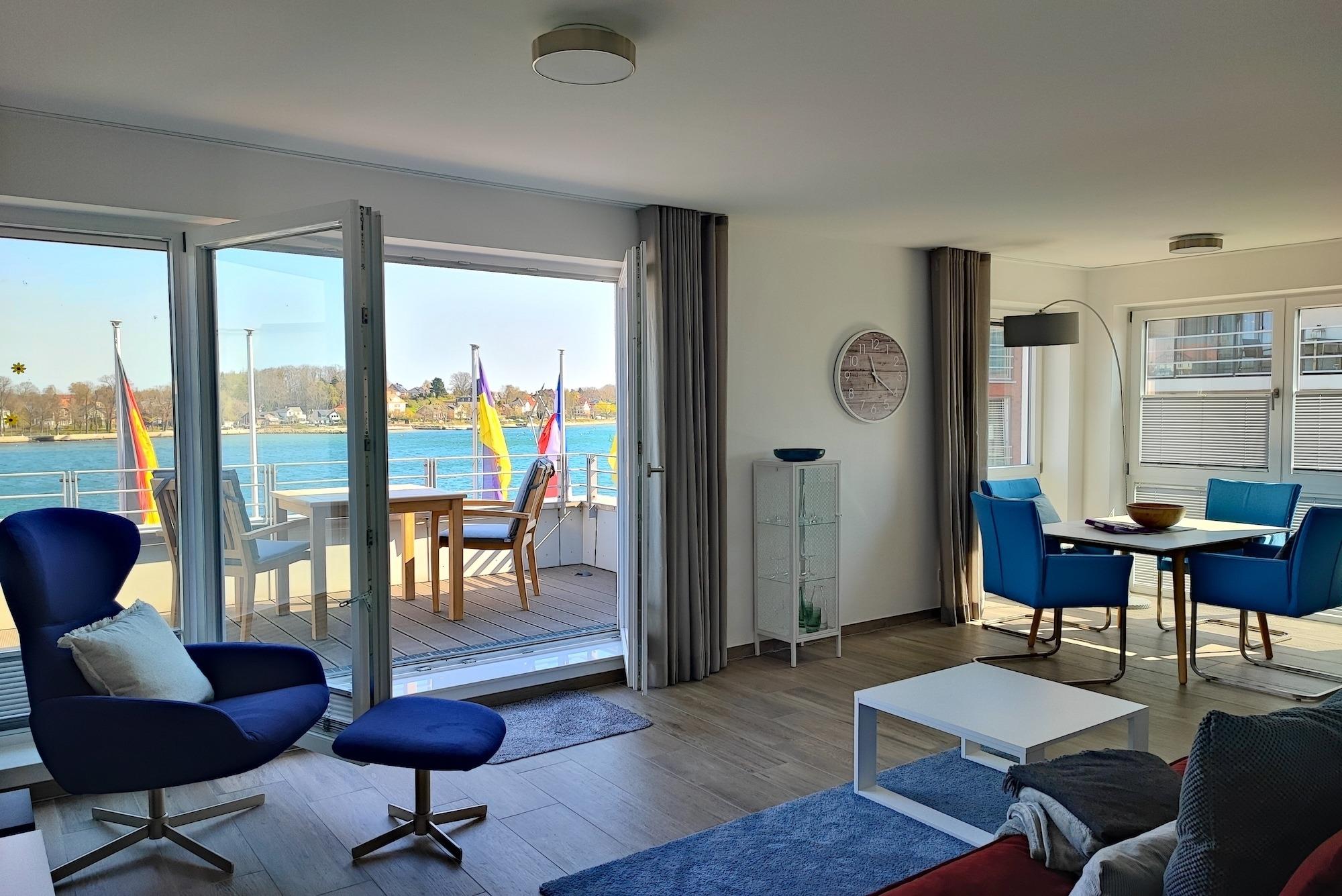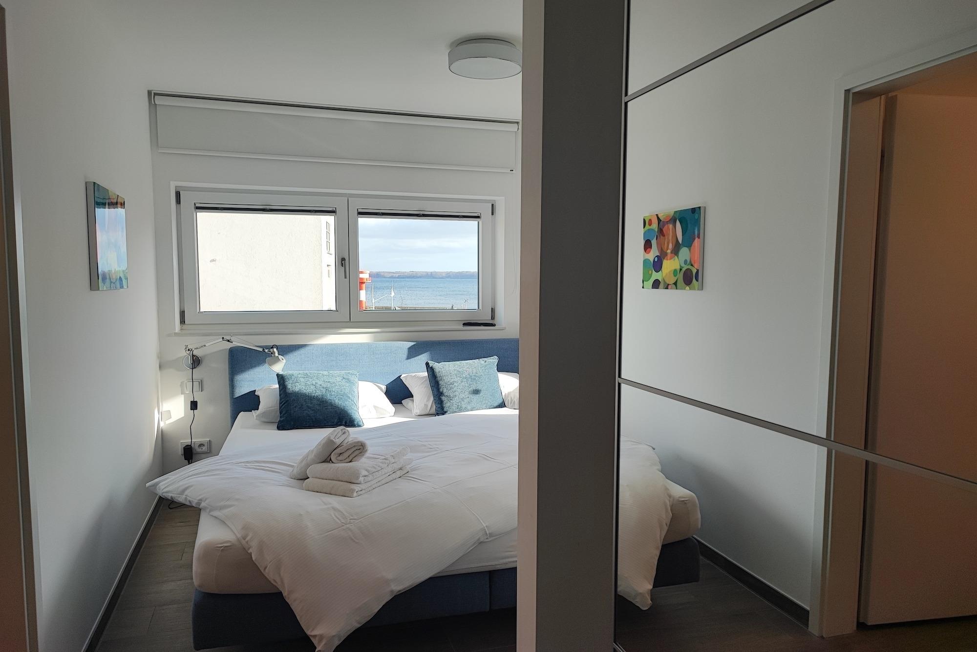 Einzigartig bei dieser Ferienwohnung - aus allen Räumen mit Blick aufs Wasser. Sie verfügt eine Sonnenterrasse (Südseite) mit MEERBLICK und über Balkon (Nordseite) mit Blick auf das Hafenbecken. Von beiden Seiten aus können Sie sowohl das Flanieren der Spaziergänger als auch die Veranstaltungen am Hafen von oben betrachten und den Blick genießen und weit schweifen lassen. Der offene und helle Wohn- und Essbereich, mit voll ausgestatteter Küche, lädt zum Entspannen und Kochen ein. Ein großer TV Bildschirm hängt an der Wand, so dass von allen Seiten darauf geschaut werden kann. Vom Wohnzimmer aus betreten Sie den Balkon mit dem fantastischen Blick über die Hafenpromenade und dem Hafenwasserbecken. Zu Zeiten der Aalregatta im Sommer können Sie die Segelboote vorbeiziehend betrachten. Das Schlafzimmer wurde mit einem modernen Boxspringbett (180x200), mit sehr großen TV -Bildschirm an der Wand und einem großzügigen Kleiderschrank mit Spiegelfront eingerichtet. Vom Schlafzimmer aus betreten Sie die Sonnenterrasse mit Meerblick, mit einem großem Strandkorb, Terrassenmöbeln und einem Sonnenschirm ausgestattet. Das Badezimmer on Suite ist mit ebenerdiger Dusche, einem WC und einem Waschbecken mit Schubladen ausgestattet. Zusätzlich haben Sie im Eingangsbereich mit dem Gäste-WC eine weitere Toilette. Der Flur ist mit viel Platz großzügig geschnitten. Für den längeren Aufenthalt stehen Ihnen in der Abstellkammer der Wohnung eine Waschmaschine und ein Trockner zur Verfügung. Die Fußböden der gesamten Wohnung sind mit Steinfliesen und komplett mit einer Fußbodenheizung durchzogen. Die im 2. Stock des Appartementhauses gelegene Ferienwohnung kann ''barrierefrei'' über einen Aufzug, mit direktem Zugang aus der Tiefgarage erreicht werden. Die Symbole vom Wohngrundriss können in der Darstellung von der tatsächlichen Innen- und Außengestaltung der Wohnung abweichen!