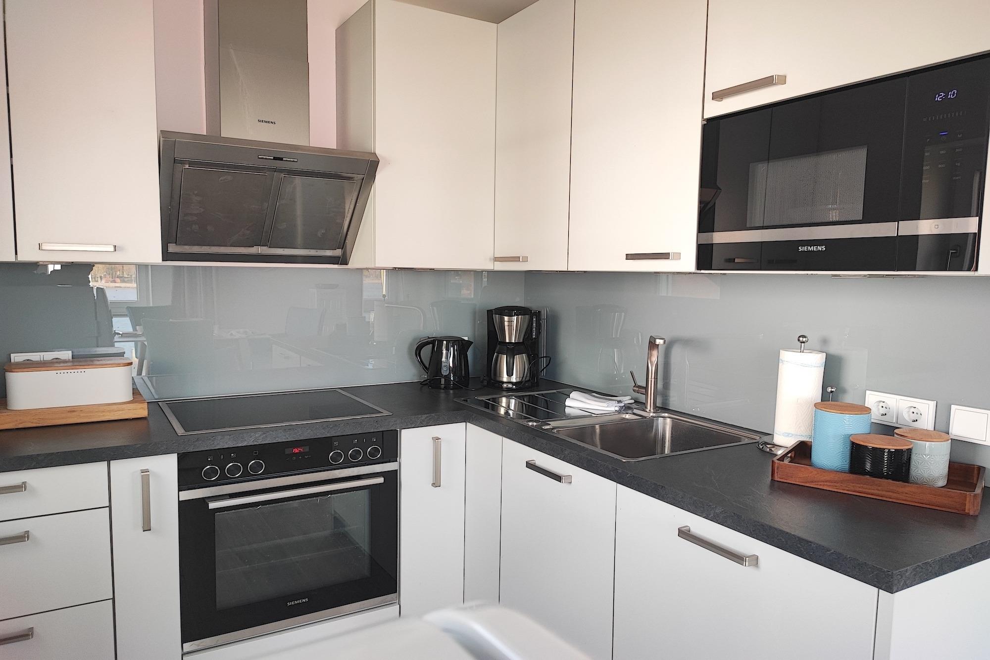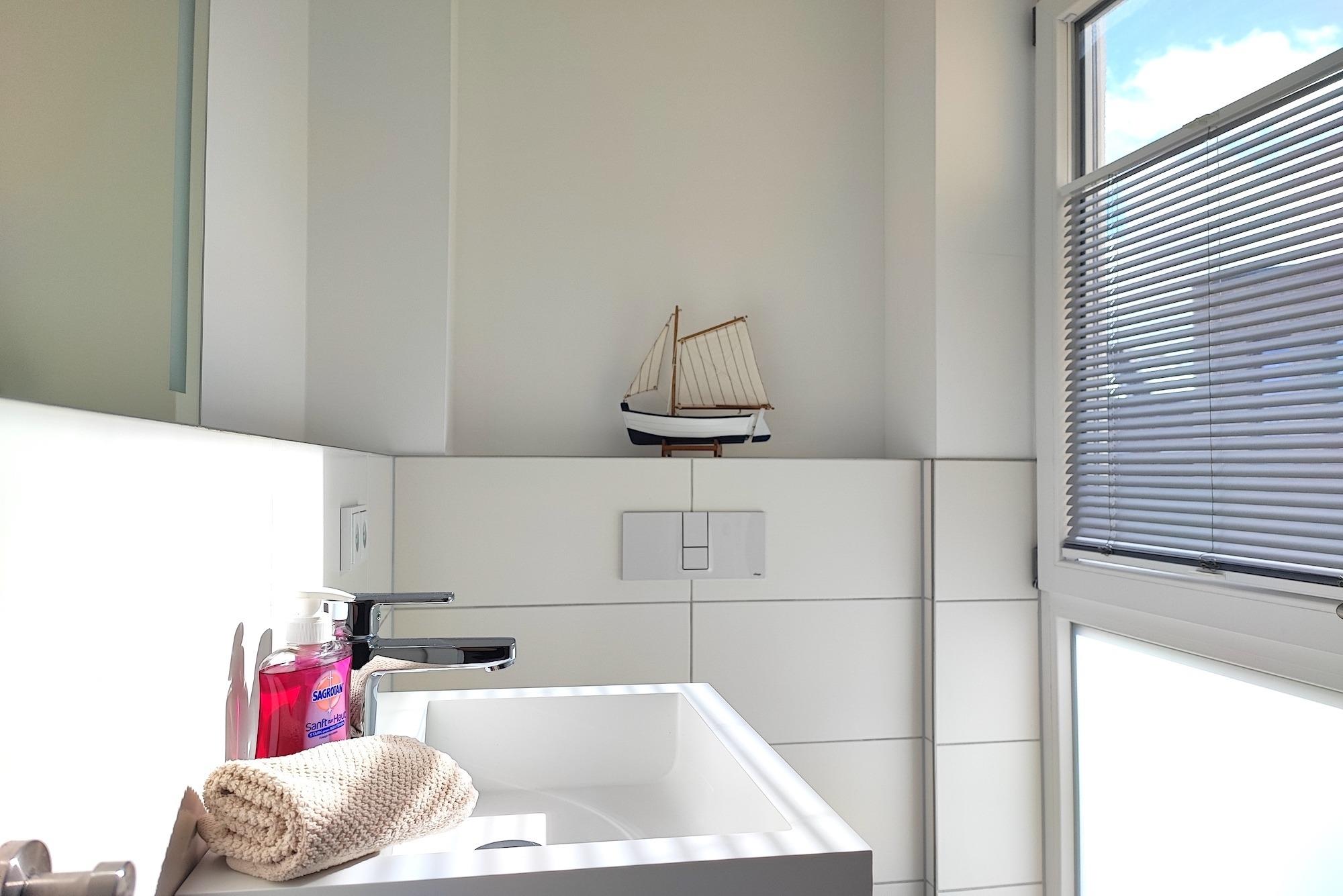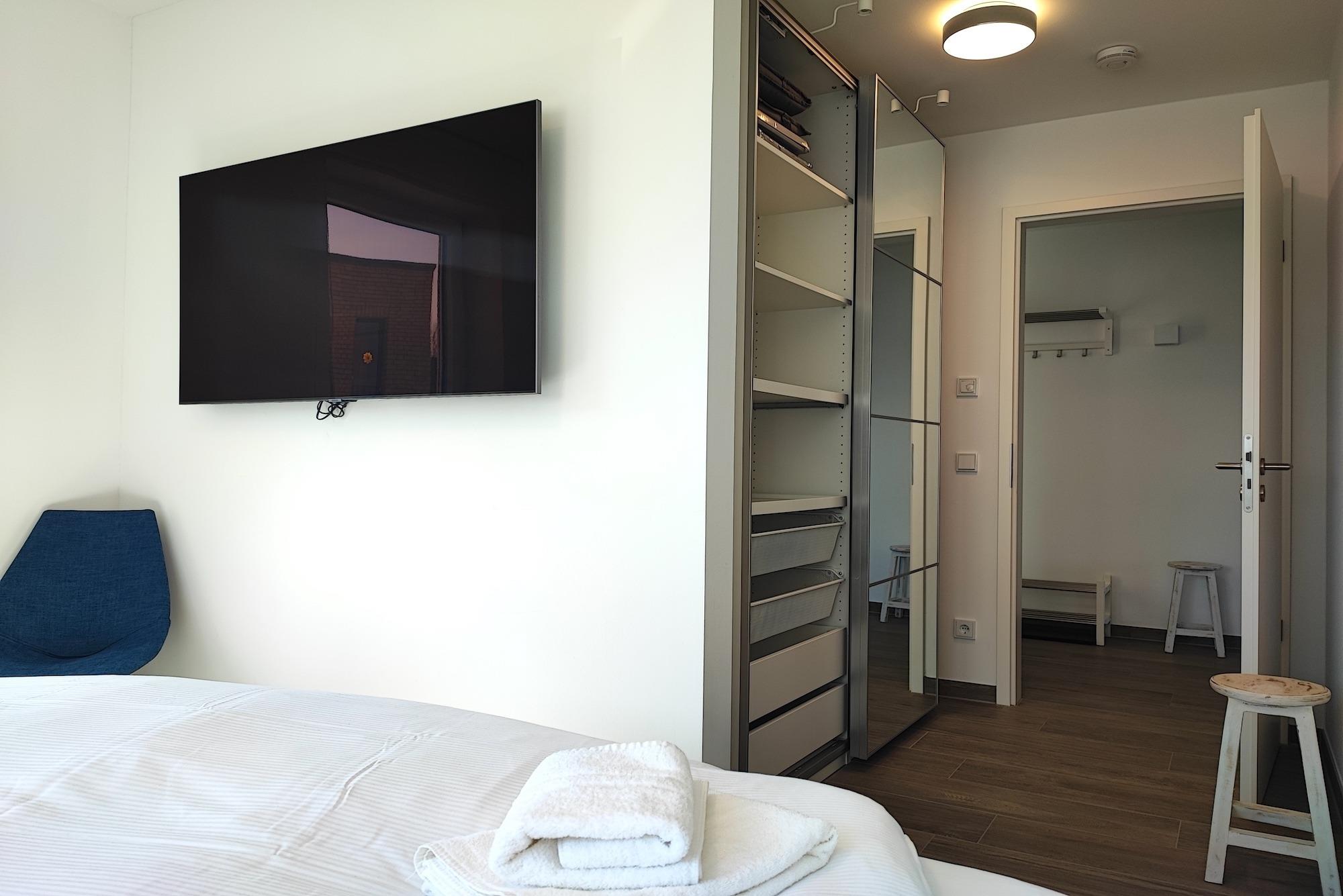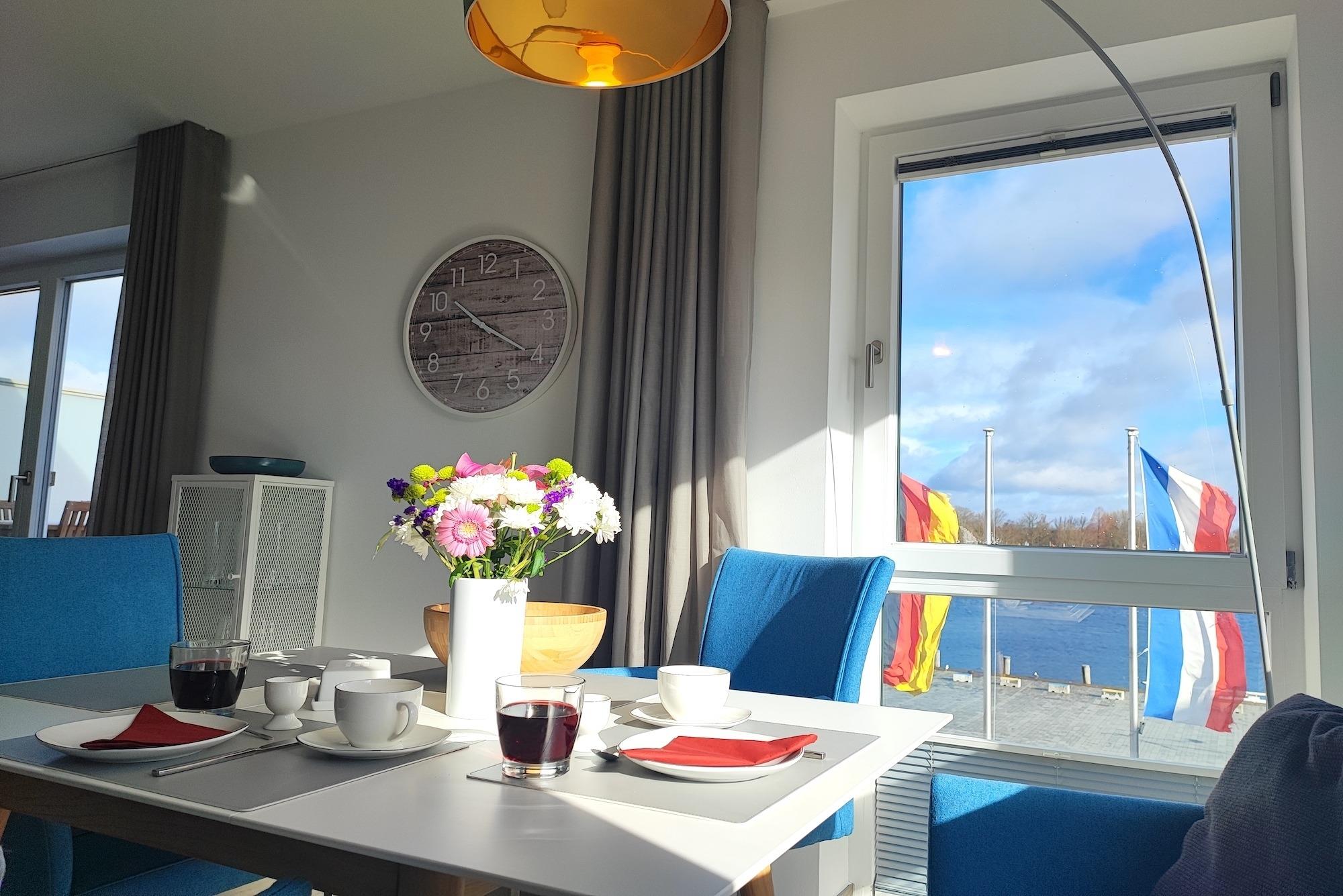 Einzigartig bei dieser Ferienwohnung - aus allen Räumen mit Blick aufs Wasser. Sie verfügt eine Sonnenterrasse (Südseite) mit MEERBLICK und über Balkon (Nordseite) mit Blick auf das Hafenbecken. Von beiden Seiten aus können Sie sowohl das Flanieren der Spaziergänger als auch die Veranstaltungen am Hafen von oben betrachten und den Blick genießen und weit schweifen lassen. Der offene und helle Wohn- und Essbereich, mit voll ausgestatteter Küche, lädt zum Entspannen und Kochen ein. Ein großer TV Bildschirm hängt an der Wand, so dass von allen Seiten darauf geschaut werden kann. Vom Wohnzimmer aus betreten Sie den Balkon mit dem fantastischen Blick über die Hafenpromenade und dem Hafenwasserbecken. Zu Zeiten der Aalregatta im Sommer können Sie die Segelboote vorbeiziehend betrachten. Das Schlafzimmer wurde mit einem modernen Boxspringbett (180x200), mit sehr großen TV -Bildschirm an der Wand und einem großzügigen Kleiderschrank mit Spiegelfront eingerichtet. Vom Schlafzimmer aus betreten Sie die Sonnenterrasse mit Meerblick, mit einem großem Strandkorb, Terrassenmöbeln und einem Sonnenschirm ausgestattet. Das Badezimmer on Suite ist mit ebenerdiger Dusche, einem WC und einem Waschbecken mit Schubladen ausgestattet. Zusätzlich haben Sie im Eingangsbereich mit dem Gäste-WC eine weitere Toilette. Der Flur ist mit viel Platz großzügig geschnitten. Für den längeren Aufenthalt stehen Ihnen in der Abstellkammer der Wohnung eine Waschmaschine und ein Trockner zur Verfügung. Die Fußböden der gesamten Wohnung sind mit Steinfliesen und komplett mit einer Fußbodenheizung durchzogen. Die im 2. Stock des Appartementhauses gelegene Ferienwohnung kann ''barrierefrei'' über einen Aufzug, mit direktem Zugang aus der Tiefgarage erreicht werden. Die Symbole vom Wohngrundriss können in der Darstellung von der tatsächlichen Innen- und Außengestaltung der Wohnung abweichen!