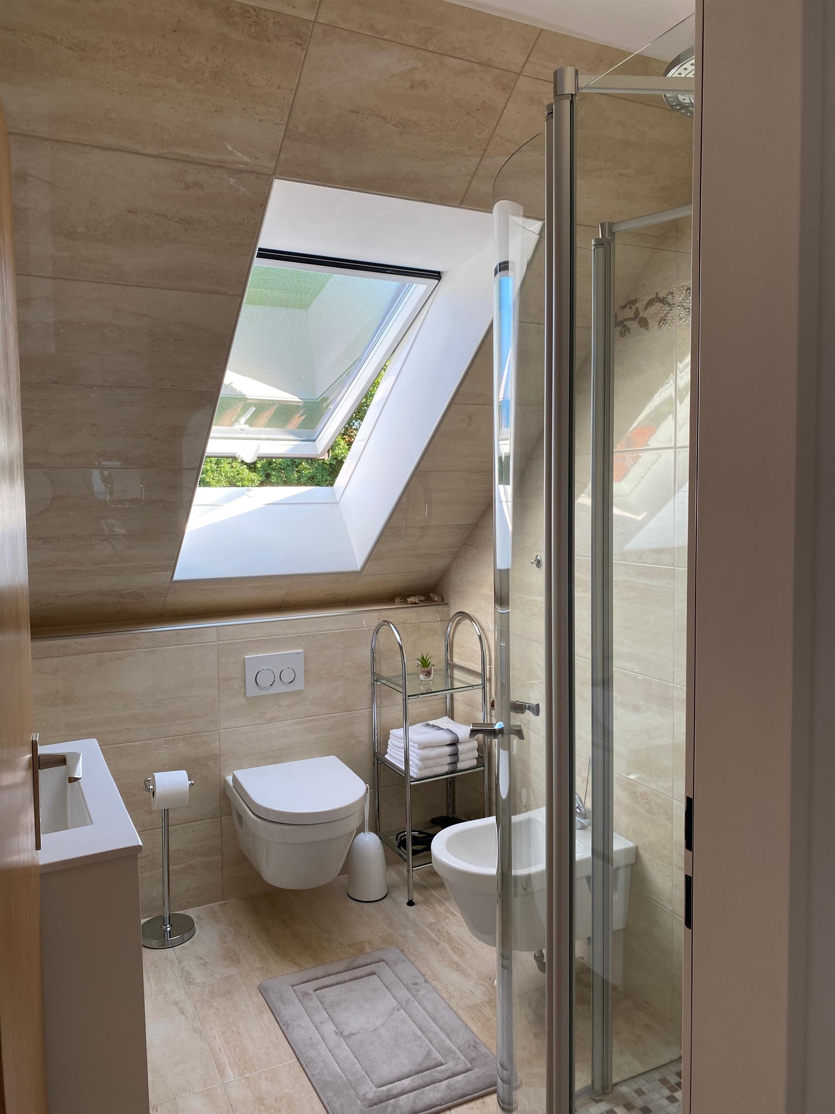 Die Küche ist vollständig ausgestattet mit Mikrowelle, Backofen, Herd, Spülmaschine, Wasserkocher, Kaffeemaschine und Toaster. Ein Kühlschrank mit Gefrierfach ist ebenfalls vorhanden. Das Badezimmer verfügt über eine Regendusche und ein Bidet, inklusive Föhn. Bettwäsche und Handtücher sind inbegriffen.