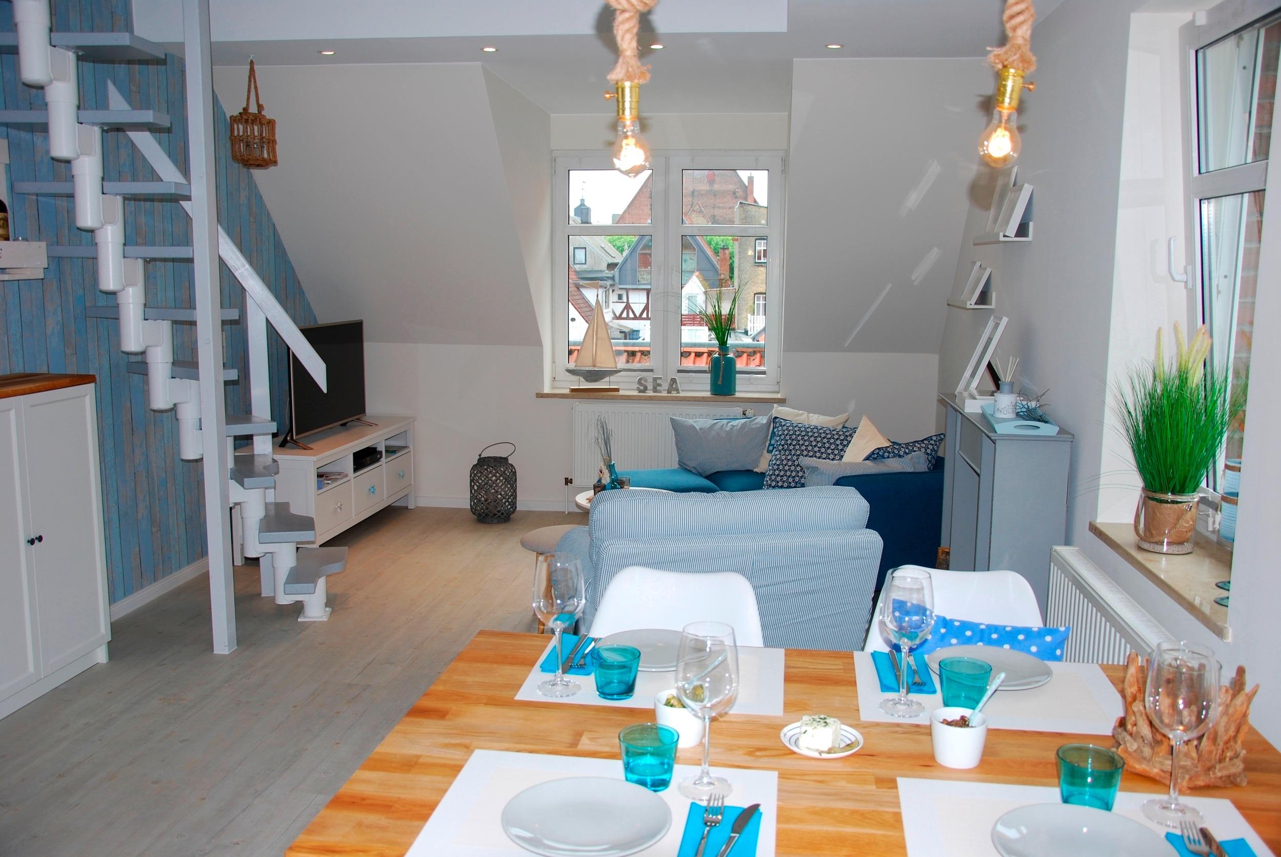 Die Dachschrägen und der offene Wohn- und Essbereich verleihen dem Appartement eine schöne Gemütlichkeit. Aus den Fenstern könnt Ihr die Altstadt von Eckernförde überschauen und von der Galerie einen Blick auf den Hafen erhaschen.