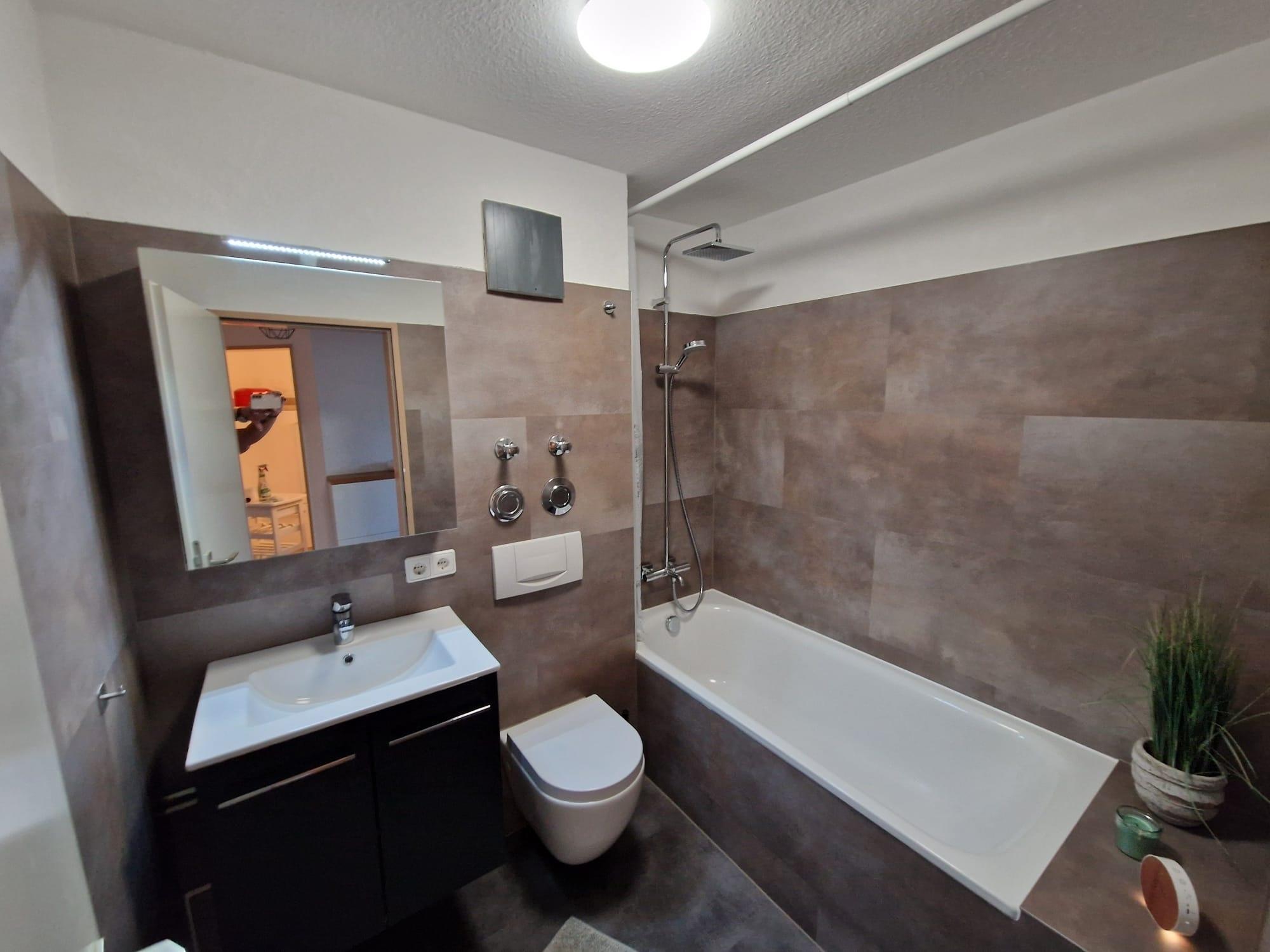 - mit Badewanne, Waschtisch, Spiegel, Fön und WC
