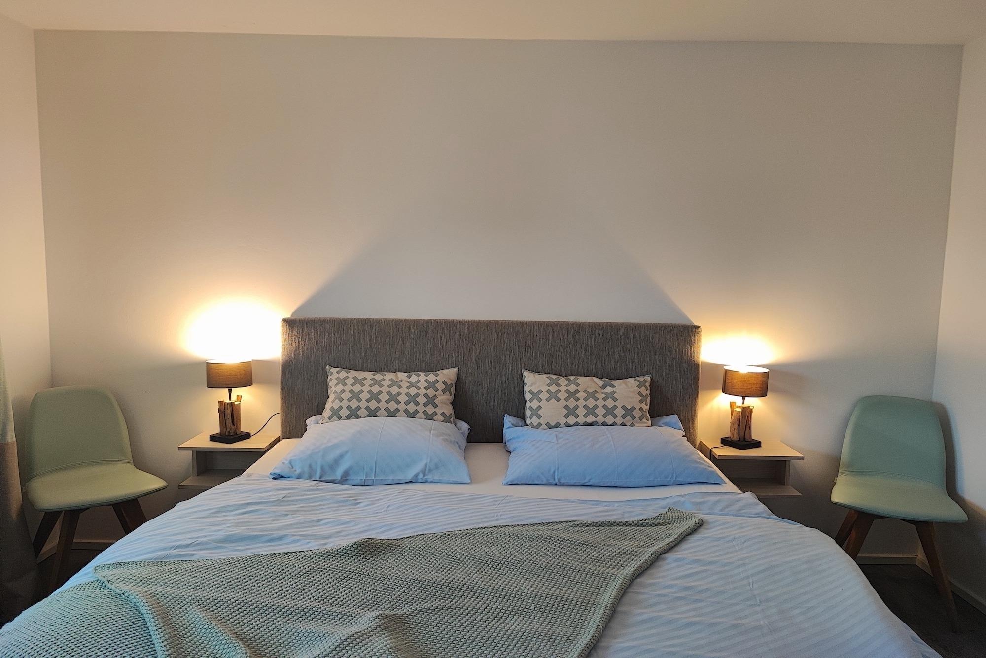 ? Wäschepakete optional wählbar gegen Gebühr: (Bettwäscheset/Handtuchset jeweils pro Aufenthalt/pro Person) können gegen eine Gebühr bestellt werden oder Selbst mitgebracht werden. Achten Sie bei Buchung an die gleiche Anzahl Wäschepakte wie gebuchten Personen. Ein Handtuchset pro Aufenthalt/pro Person ist ausgelegt für eine Woche (1 Duschtuch, 1 Handtuch), zusätzlich 1 Badvorlage pro Bad. Weitere Handtuchsets können bei längeren Aufenthalten z.B. ab dem 7. Tag gegen eine weitere Gebühr dazu bestellt werden ? 2 Topper auf den Matratzen 180x200 und 160x200 ? Babys und Kleinkinder bis zum vollendeten 2. Lebensjahr kostenfrei (Verleih Babyreisebett gegen Gebühr, Babyhochstuhl kostenfrei) ? Haustiere willkommen; müssen dazu gebucht werden (Miete Hund und Endreingung Hund) ? Parkplatz Nr.07 in der Tiefgarage (inklusive) ? Höhe Toreinfahrt in die Tiefgarage ist 2,00 m ? Fahrradabstellraum (Gemeinschaftsraum) ? Nichtraucherwohnung
