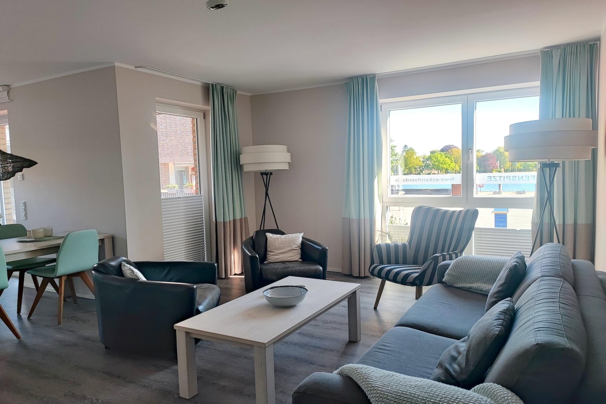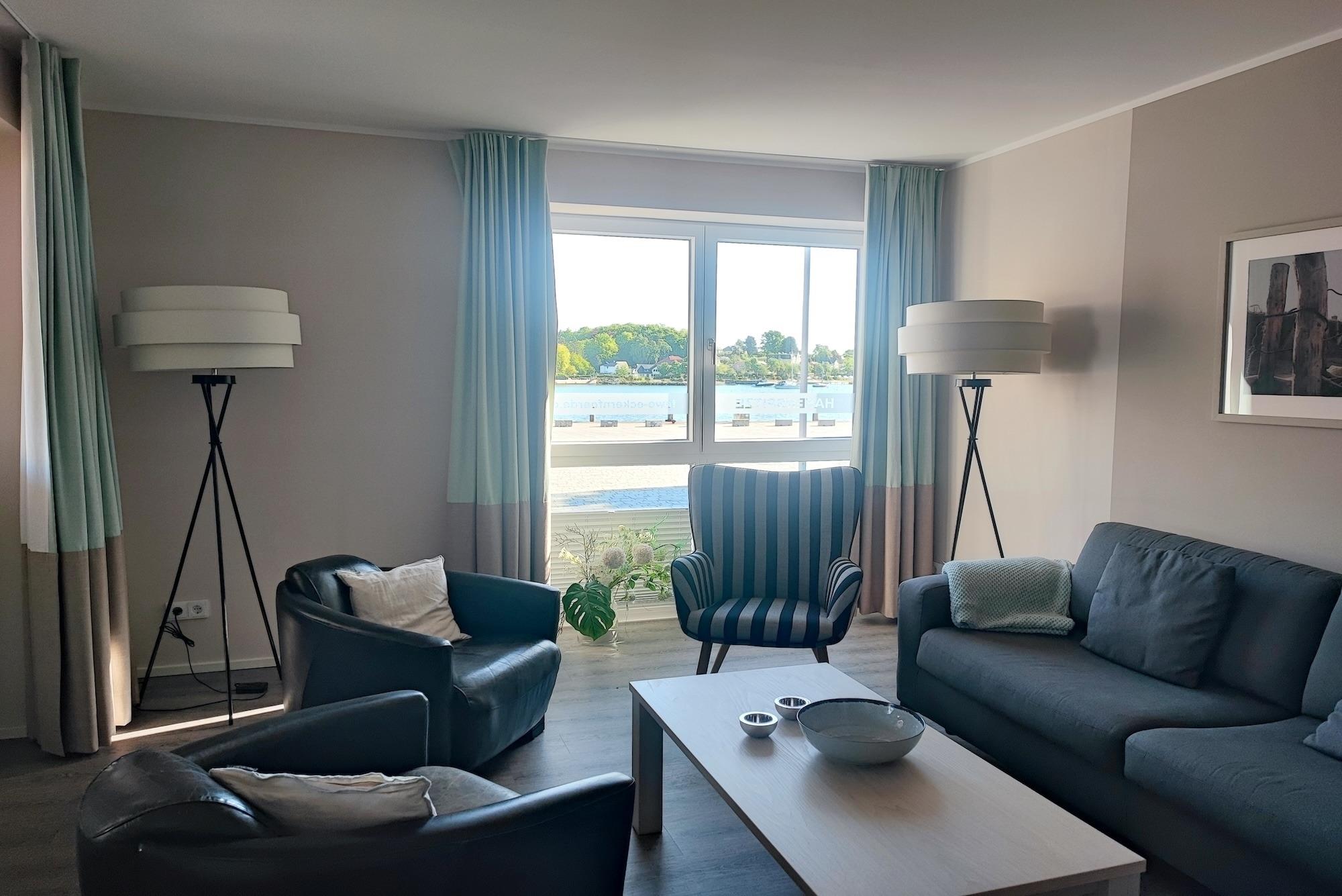 Der stilvoll eingerichtete, großzügige Wohn- und Essbereich, mit voll ausgestatteter Küche, la¨dt zum gemeinsamen Entspannen und Kochen ein! Die Ferienwohnung verfügt über einen Balkon mit wunderschönem Blick auf das Hafenbecken. Beide Schlafzimmer wurden mit modernen Doppelbetten (180x200 und 160x200), Kleiderschränken und TV-Geräten ausgestattet. Die Schlafzimmer bieten somit die gewünschte Erholung! Die Duschen in beiden Badezimmern sind ebenerdig. Die komplette Wohnung ist mit Vinylboden und Fußbodenheizung ausgestattet. Die im Hochparterre des Appartementhauses gelegene Ferienwohnung kann ''barrierefrei'' über einen Aufzug, mit direktem Zugang aus der Tiefgarage erreicht werden.