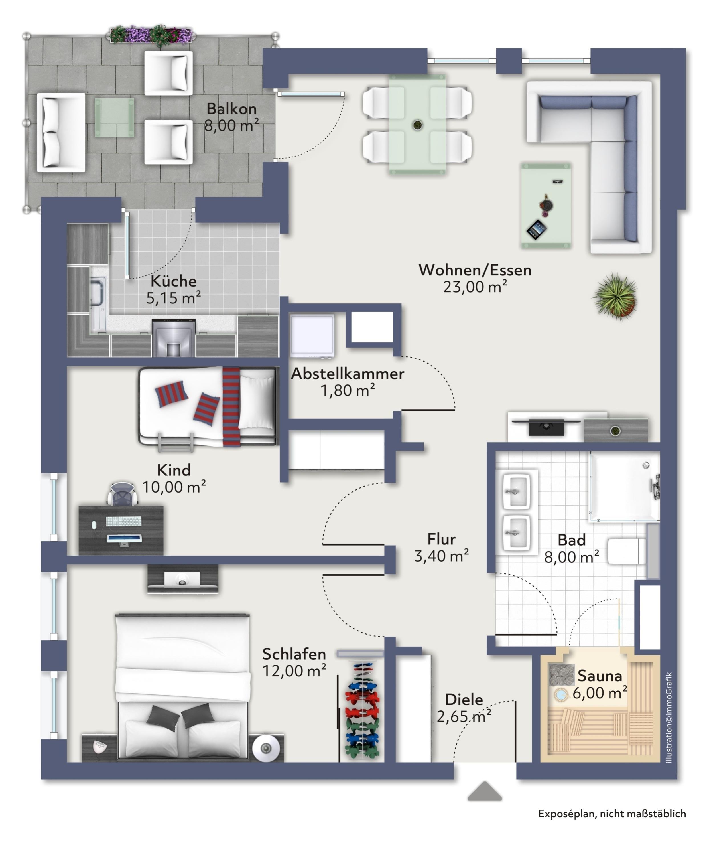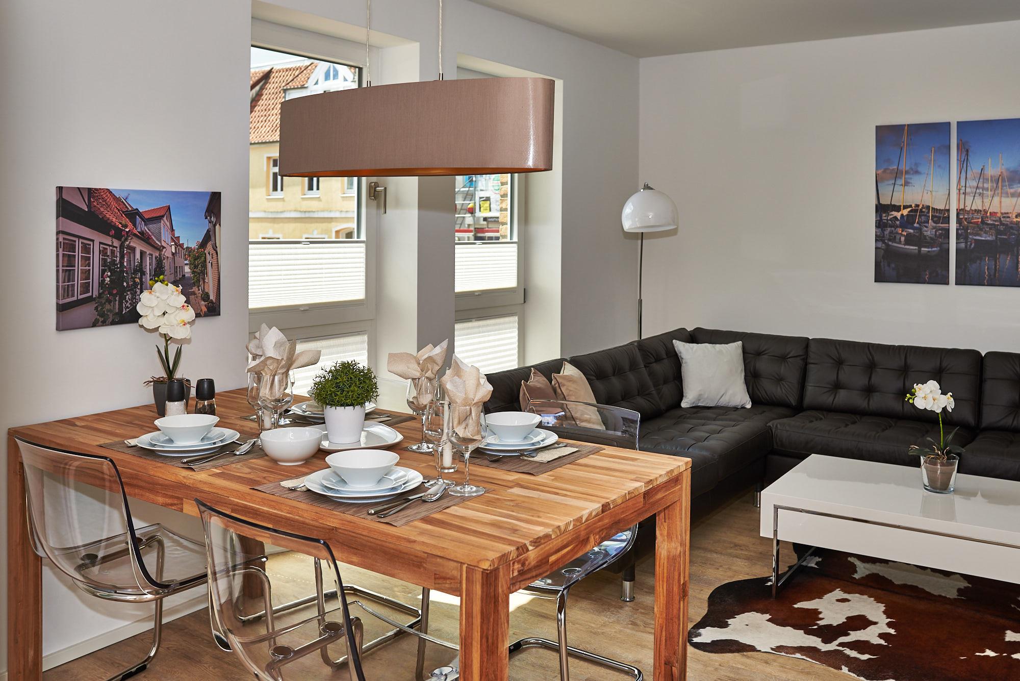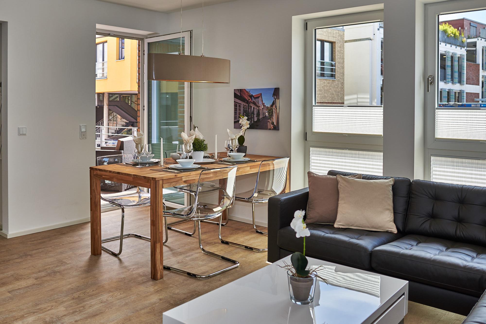 Das gemütliche Wohnzimmer hat eine geschmackvolle Einrichtung mit großem Ledersofa, 55 Zoll TV mit Amazon Prime Video und Surround Sound System. An dem großen Tisch mit 4 Stühlen ist reichlich Platz, um alle Mahlzeiten festlich und dekorativ anzurichten. Die im Hochparterre des Appartementhauses gelegene Ferienwohnung, mit Hauseingang im Treppenhaus, bietet Sonne durch die Südausrichtung des überdachten Balkons mit Blick in den Seglersteg und über die Hafenallee bis zum Hafenbecken. Die hochwertige Granitküche hat eine umfangreiche Ausstattung, um schöne Mahlzeiten für die Familie zuzubereiten. Der Herd lässt sich mit einem Magnet zur Kindersicherung ab-/entriegeln. Mit dem Mehr an Komfort erweitert ein Elektrogrill die Küchenausstattung. Die nächtliche Erholung finden Sie in den zwei Schlafzimmern mit je einem Kleiderschrank. Das erste Schlafzimmer wurde mit einem modernen Doppelbett (180x200) und einem TV-Geräte ausgestattet. Im zweiten Schlafzimmer befindet sich ein ausziehbares Einzelbett von (80x200 auf 160x200) und ein Schreibtisch mit Stuhl. Beide Schlafzimmer verfügen über Verdunklungsmöglichkeit durch blickdichte Gardinen. Das Duschbad ist mit Bodenfliesen und Fußbodenheizung ausgestattet. Die Dusche ist großflächig und ebenerdig. Die zur Entspannung einladende Sauna ist das beliebte Extra der Wohnung. Wohnung ist mit Vinylboden im Eichendielenlook und Fußbodenheizung; WLAN / Internet. Die im Hochparterre des Appartementhauses gelegene Ferienwohnung kann ''barrierefrei'' über einen Aufzug, mit direktem Zugang aus der Tiefgarage erreicht werden. Die Symbole vom Wohngrundriss können in der Darstellung von der tatsächlichen Innen- und Außengestaltung der Wohnung abweichen!