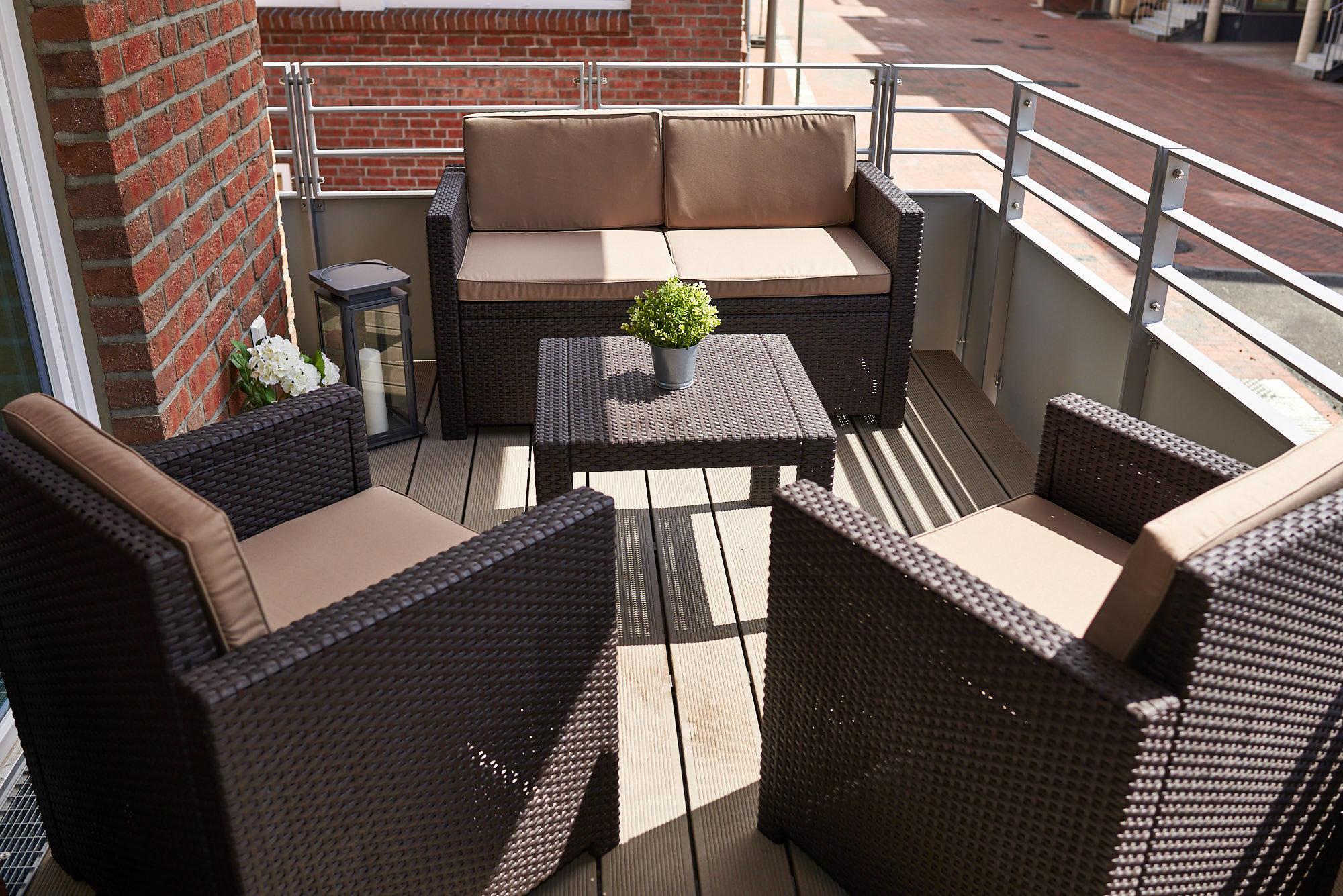 Vom Balkon kann man einen seitlichen Blick auf den Hafen werfen.