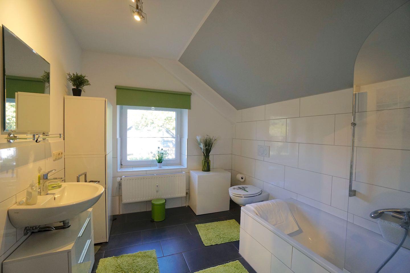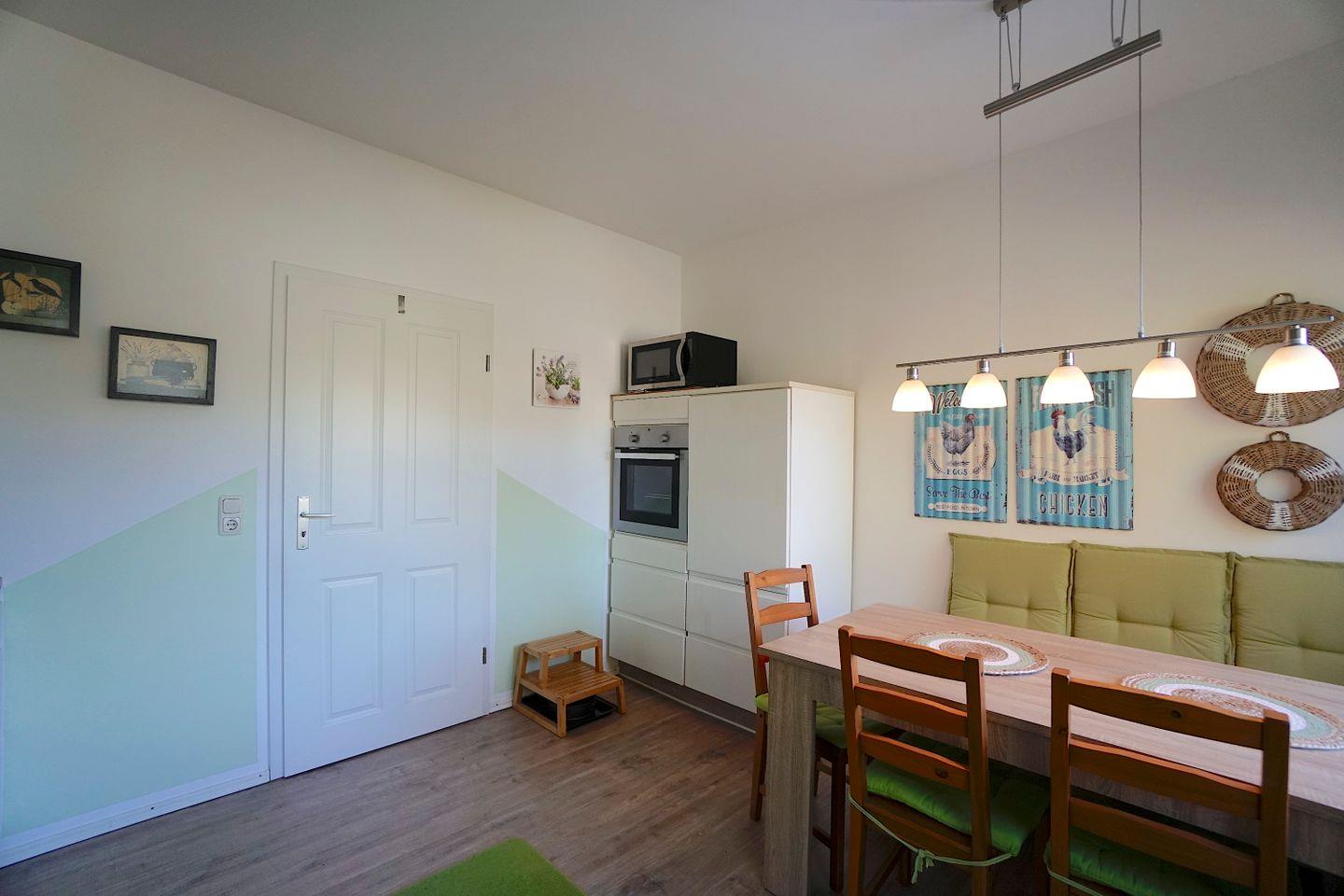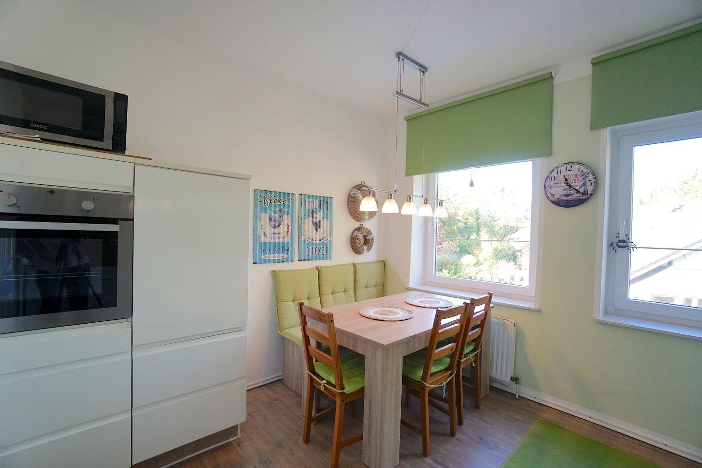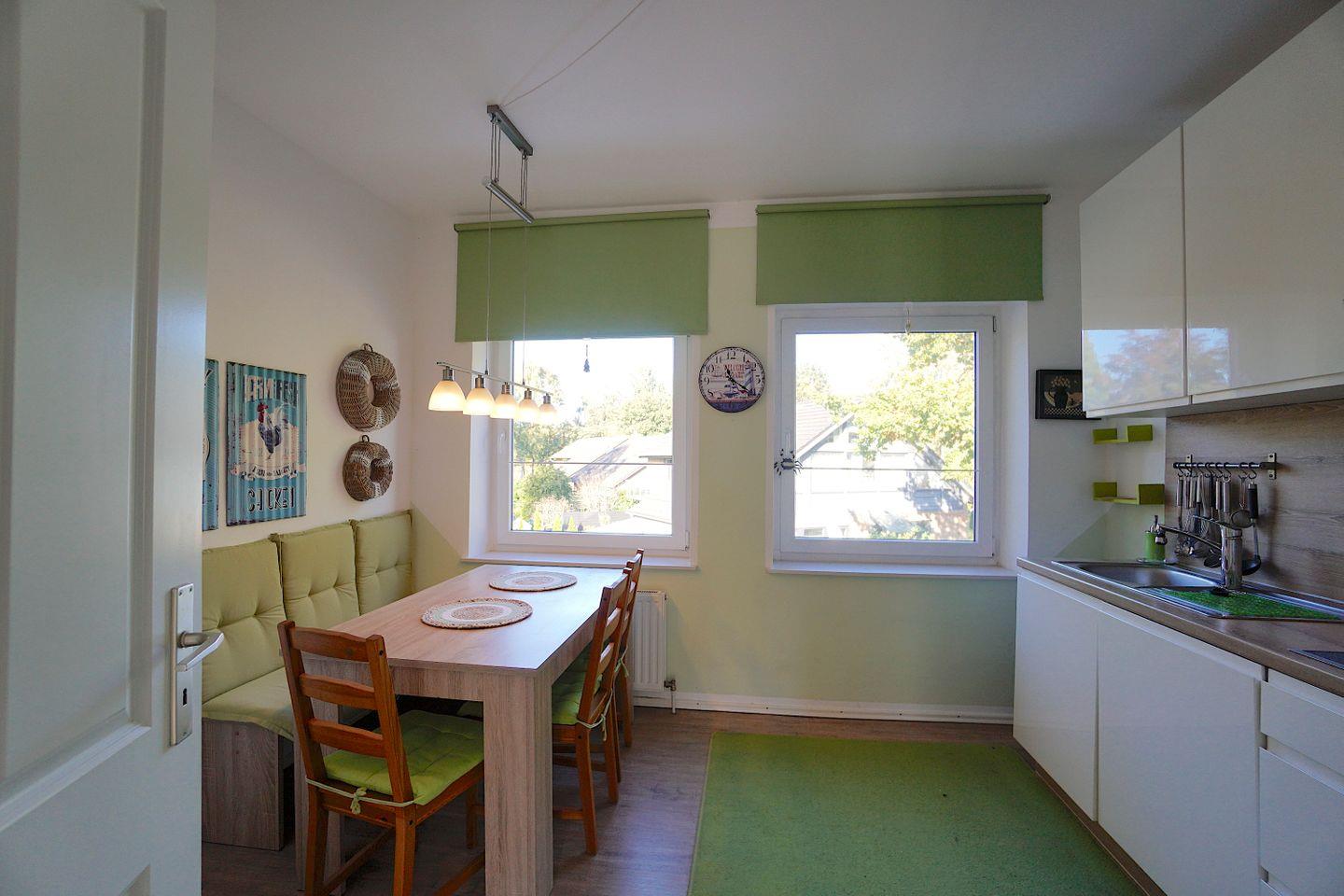 Gegenüber dem Wohnzimmer liegt das moderne Vollbad, mit Badewanne und Tageslicht und die vollausgestattete Küche mit einem weiteren Esstisch. Die Küche liegt zur Straßenseite und bietet alles was man für einen Ferienaufenthalt gebrauchen kann.