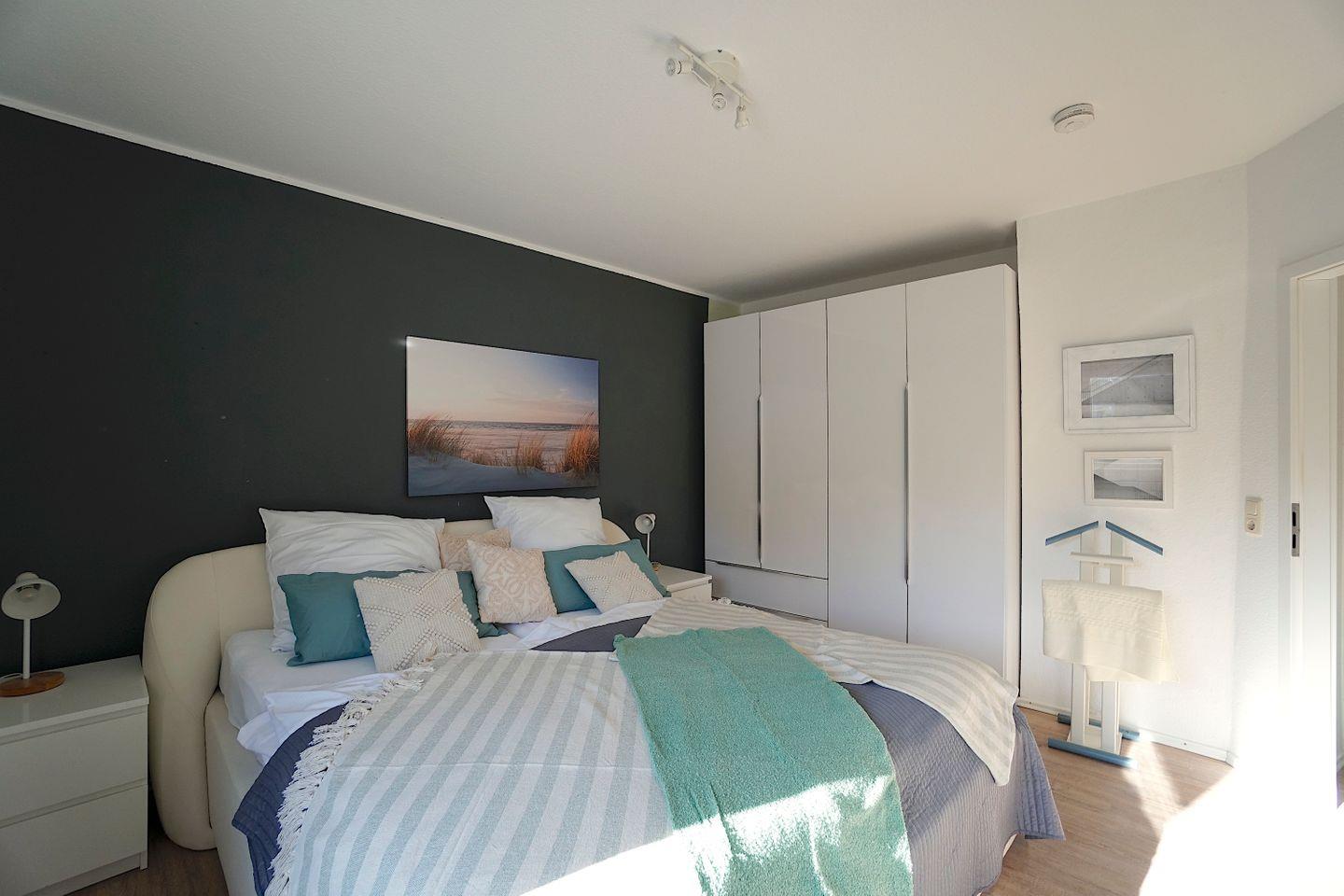 Über eine wunderschöne Treppe gelangt man in die hübsche Wohnung. Oben angekommen, befindet sich rechts das komfortable Schlafzimmer mit einem gemütlichen Doppelbett und einem geräumigen Kleiderschrank. Hier erwacht man mit dem Blick auf die Eckernförder Bucht.